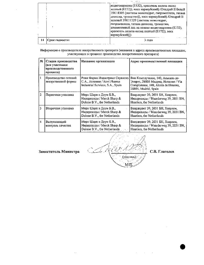 вспомогательные вещества: кальция гидрофосфат, целлюлоза микрокристаллическая, кроскармеллоза натрия, магния стеарат;