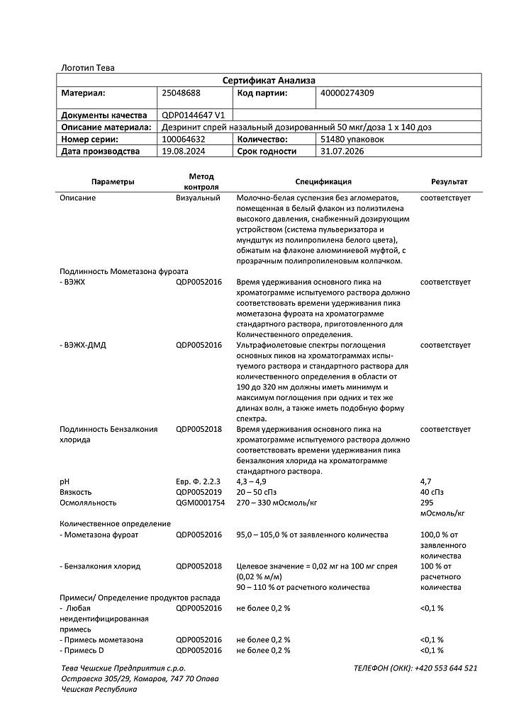 Вспомогательные вещества: авицел RC-591 (целлюлоза микрокристаллическая, кармеллоза натрия) - 2 мг, глицерол - 2.1 мг, бензалкония хлорида раствор 500 г/л - 40 мкг, полисорбат 80 - 10 мкг, лимонной кислоты моногидрат - 200 мкг, натрия цитрата дигидрат - 280 мкг, вода д/и - q.s. до 100 мг.