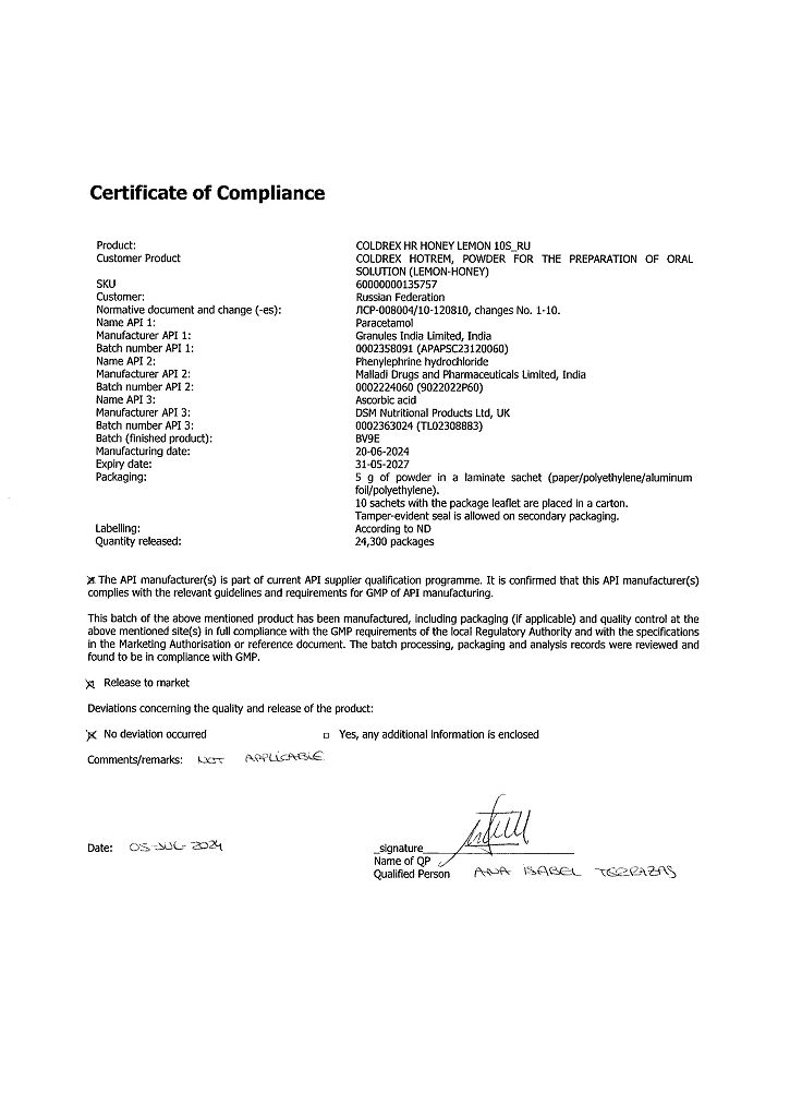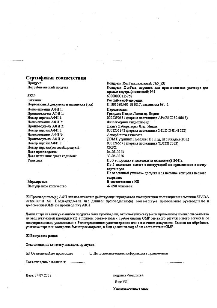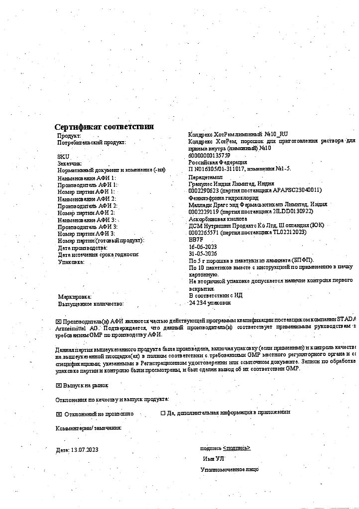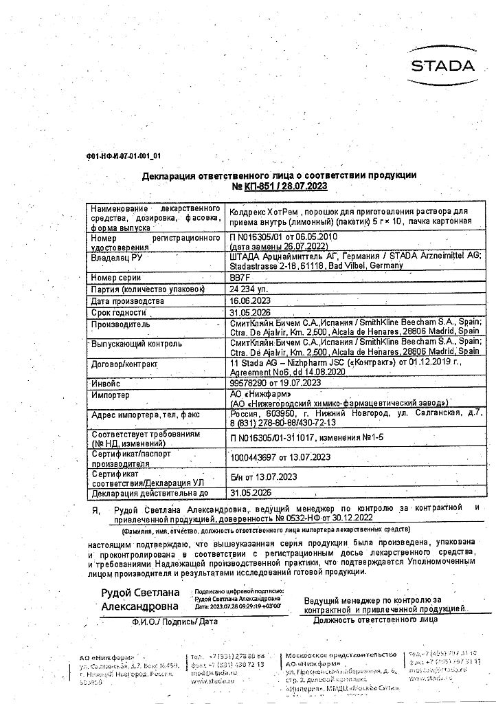 В случае передозировки препарата Колдрекс ХотРем (даже при хорошем самочувствии) следует учитывать риск возникновения отсроченных признаков серьезного повреждения печени.