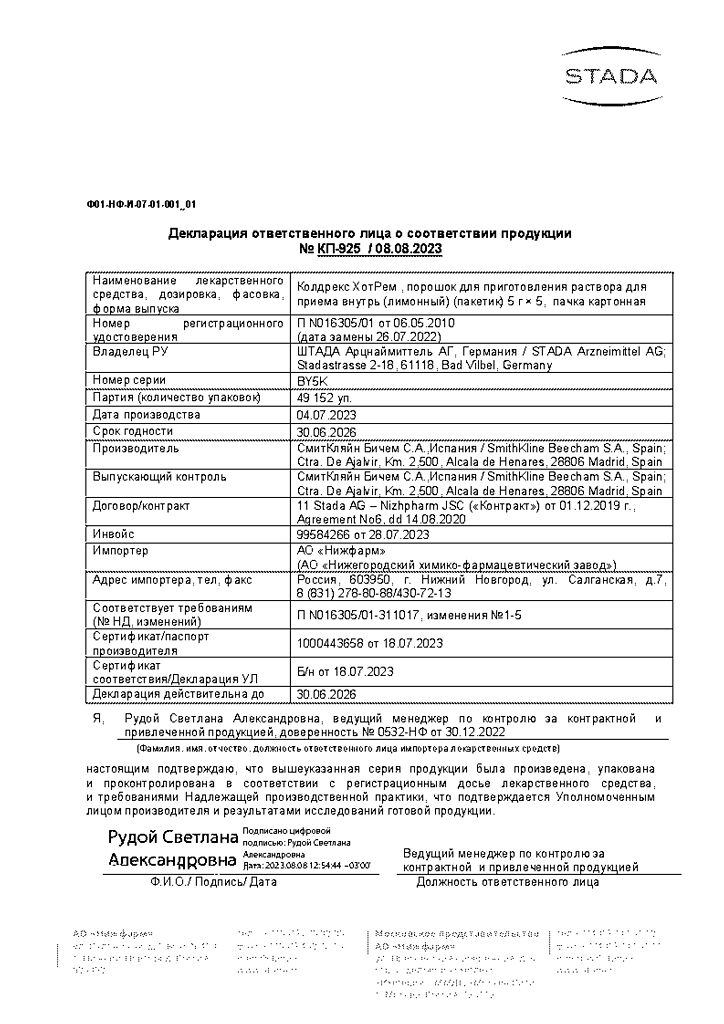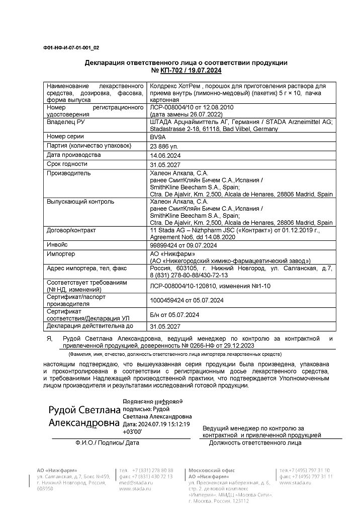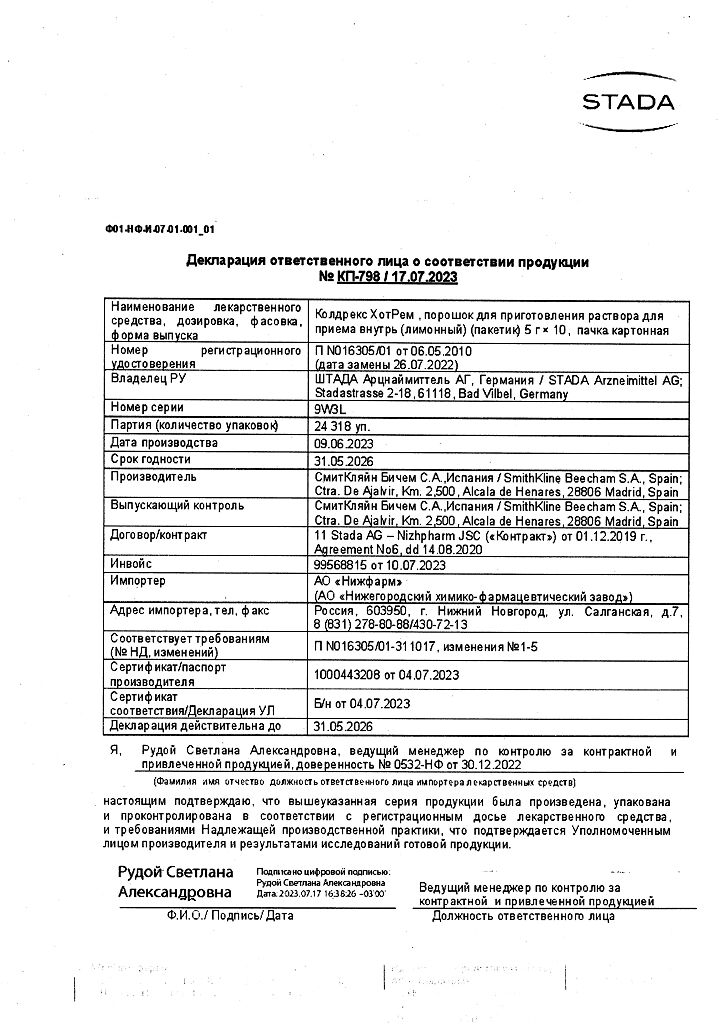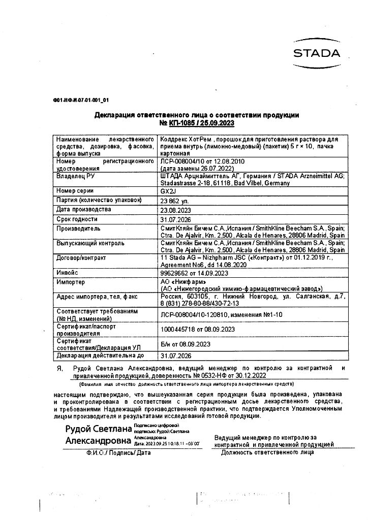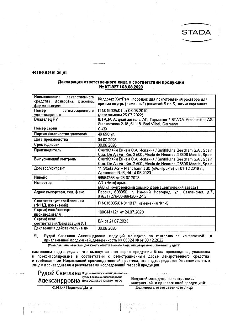В случае передозировки препарата Колдрекс ХотРем (даже при хорошем самочувствии) следует учитывать риск возникновения отсроченных признаков серьезного повреждения печени.