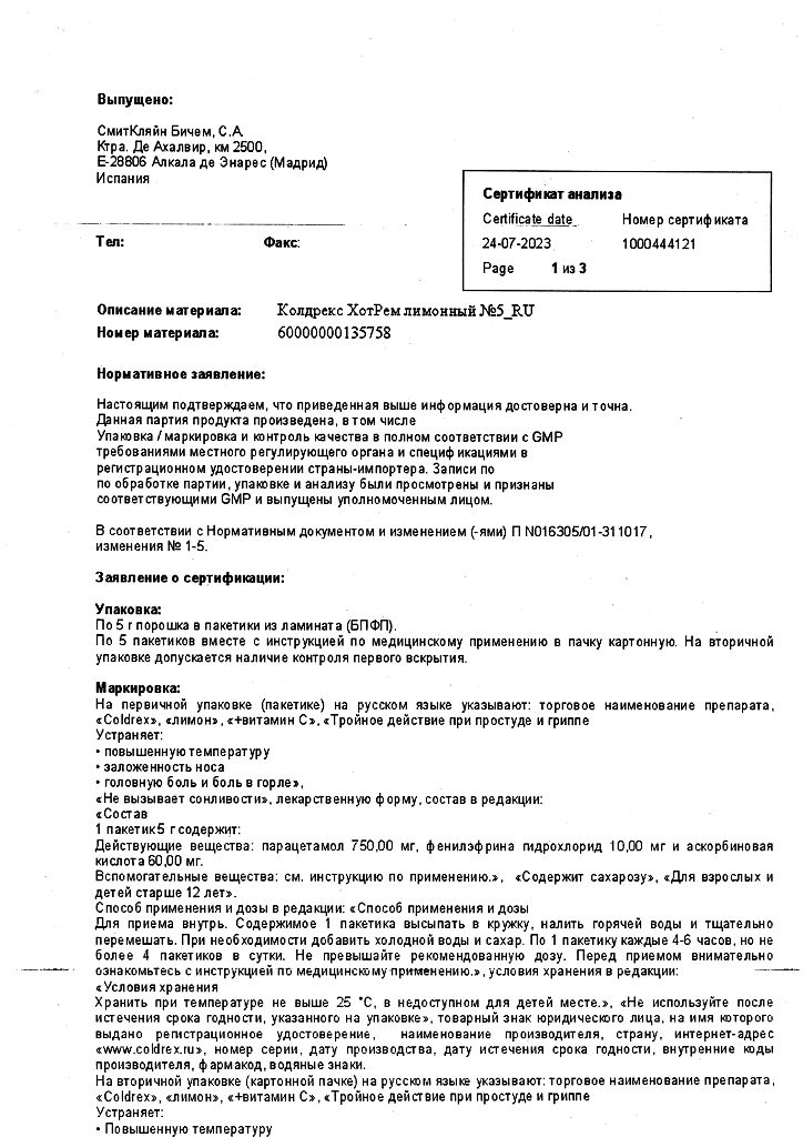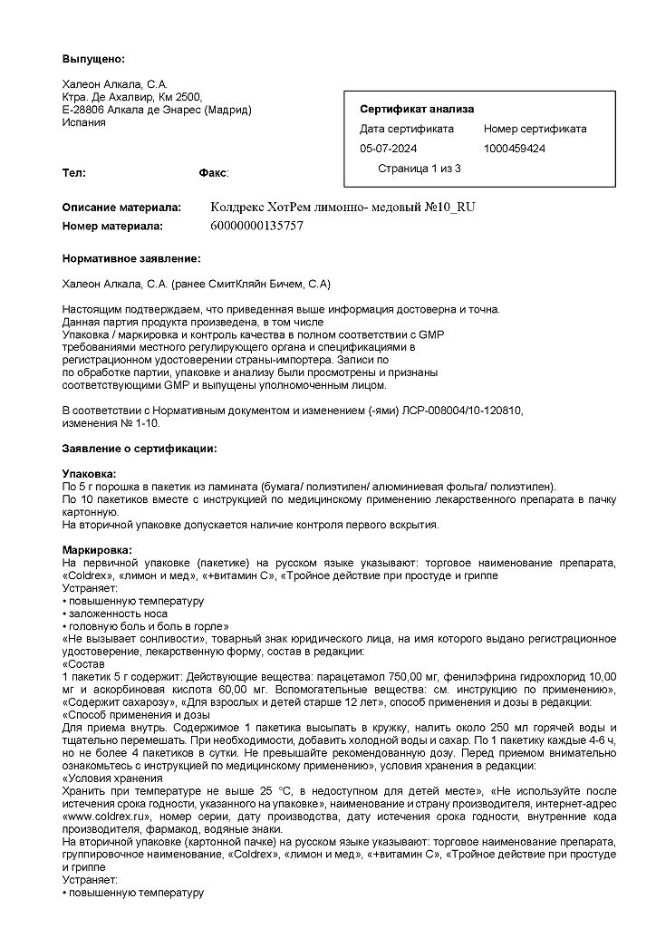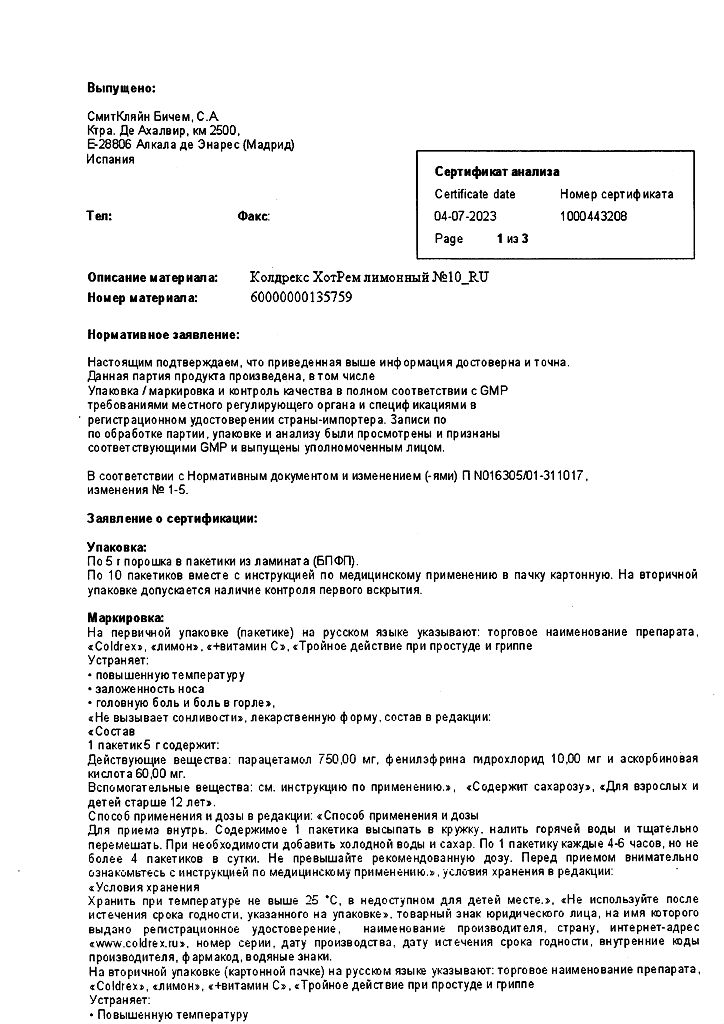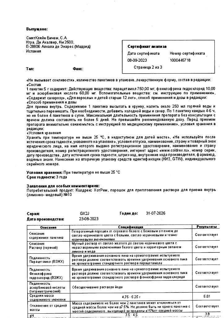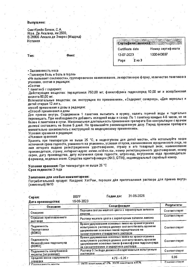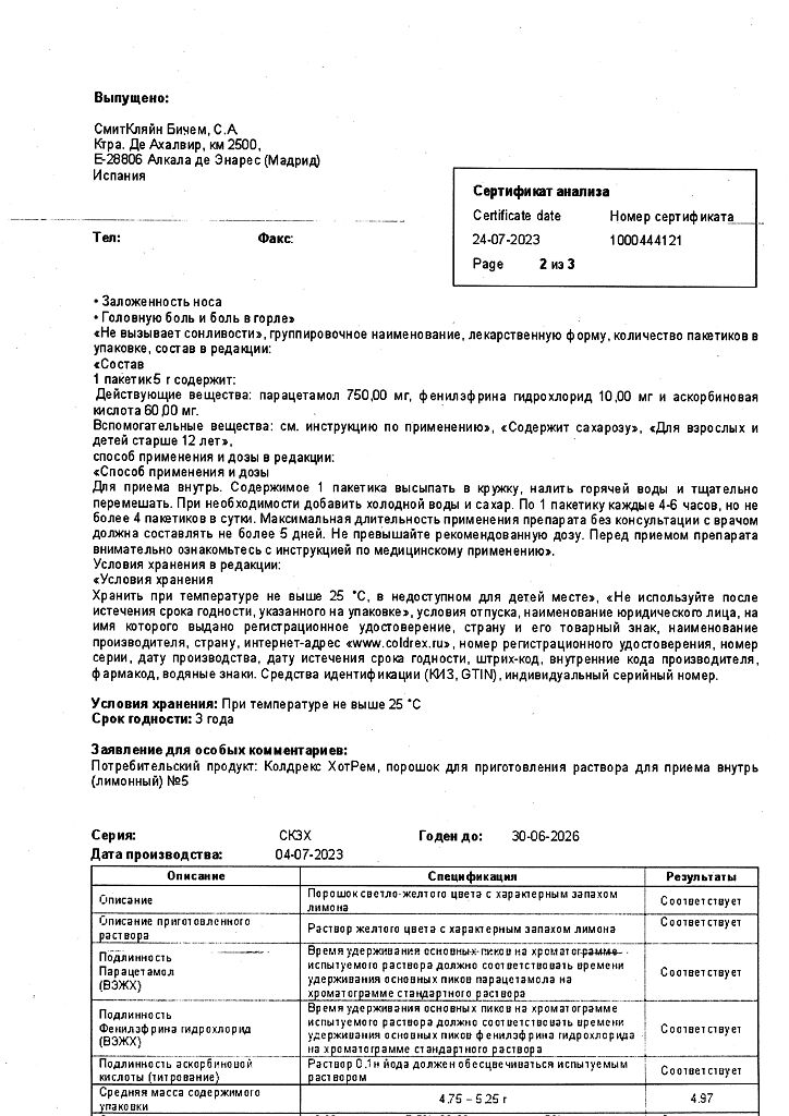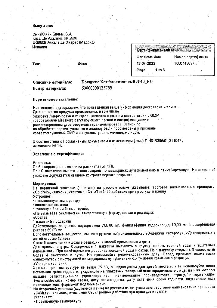 При проведении анализов на определение мочевой кислоты иуровня глюкозы в крови пациент должен сообщить врачу о применении препарата Колдрекс ХотРем, т.к. препарат может искажать результаты лабораторных тестов, оценивающих концентрацию глюкозы и мочевой кислоты.