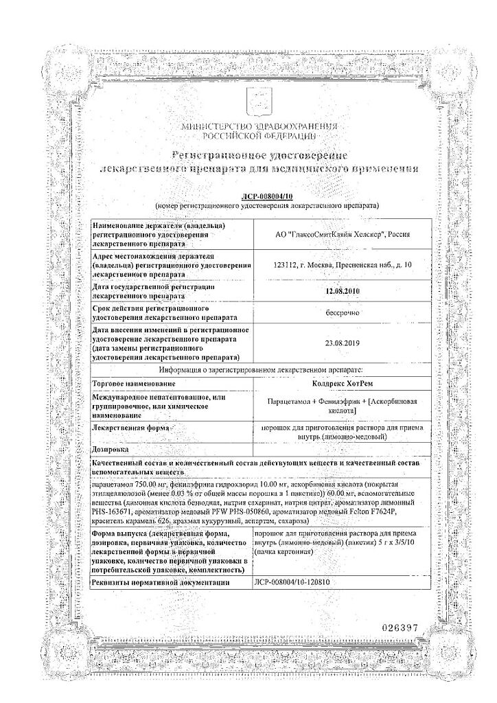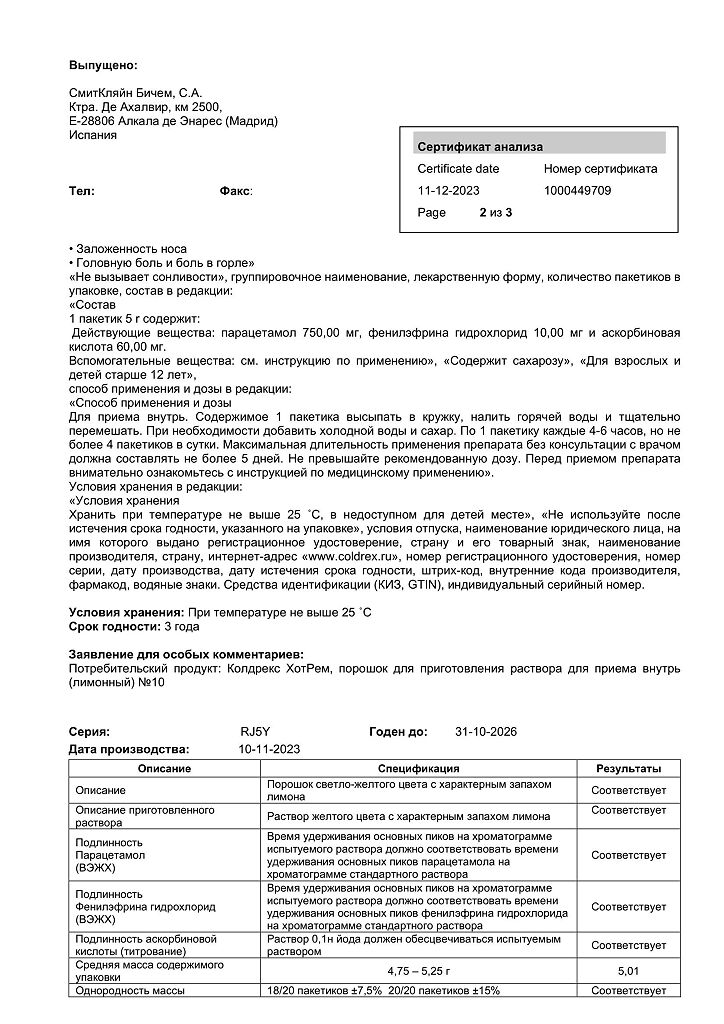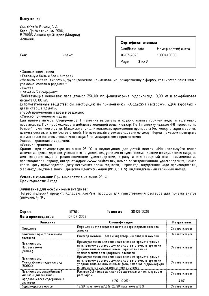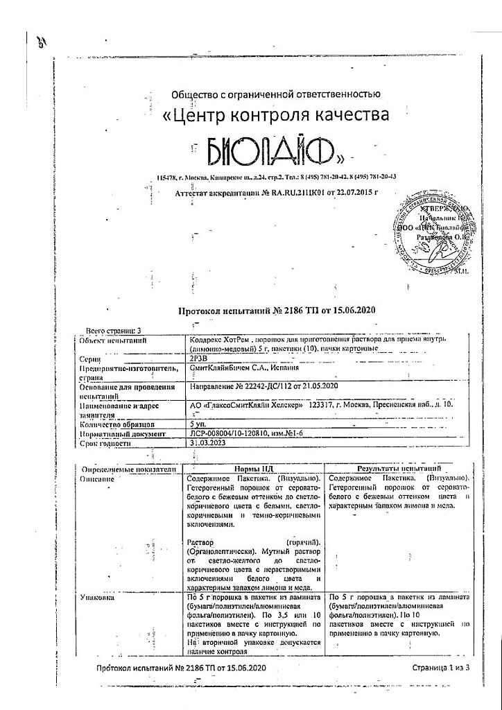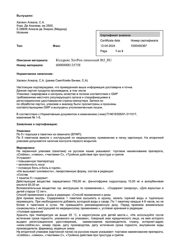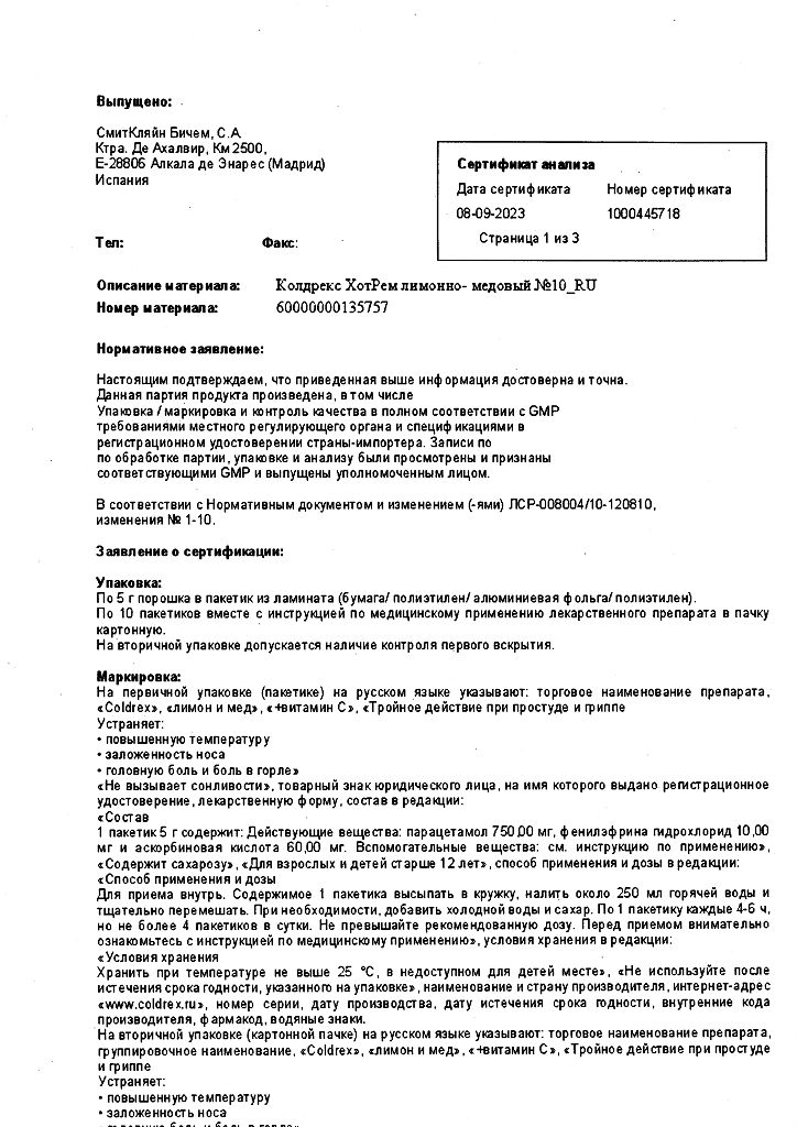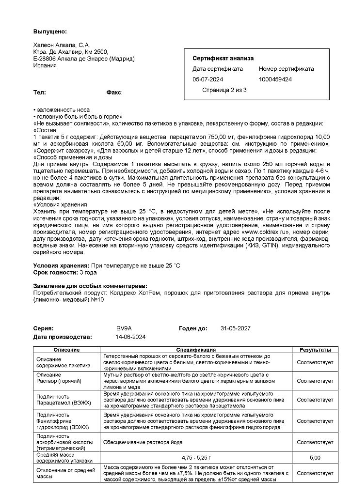 При проведении анализов на определение мочевой кислоты иуровня глюкозы в крови пациент должен сообщить врачу о применении препарата Колдрекс ХотРем, т.к. препарат может искажать результаты лабораторных тестов, оценивающих концентрацию глюкозы и мочевой кислоты.