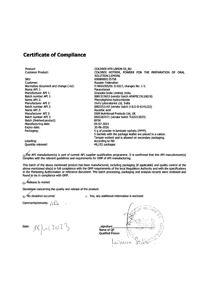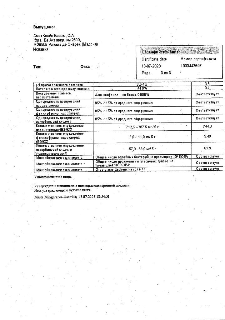 Препарат не следует принимать одновременно с другими препаратами, содержащими парацетамол, а также другими ненаркотическими анальгетиками (метамизол натрия), НПВП (ацетилсалициловая кислота, ибупрофен), барбитуратами, противосудорожными лекарственными средствами, рифампицином и хлорамфениколом, симпатомиметиками (такими как деконгестанты, средства, подавляющие аппетит, амфетаминоподобные психостимулирующие средства), с другими средствами для облегчения симптомов простуды и гриппа.