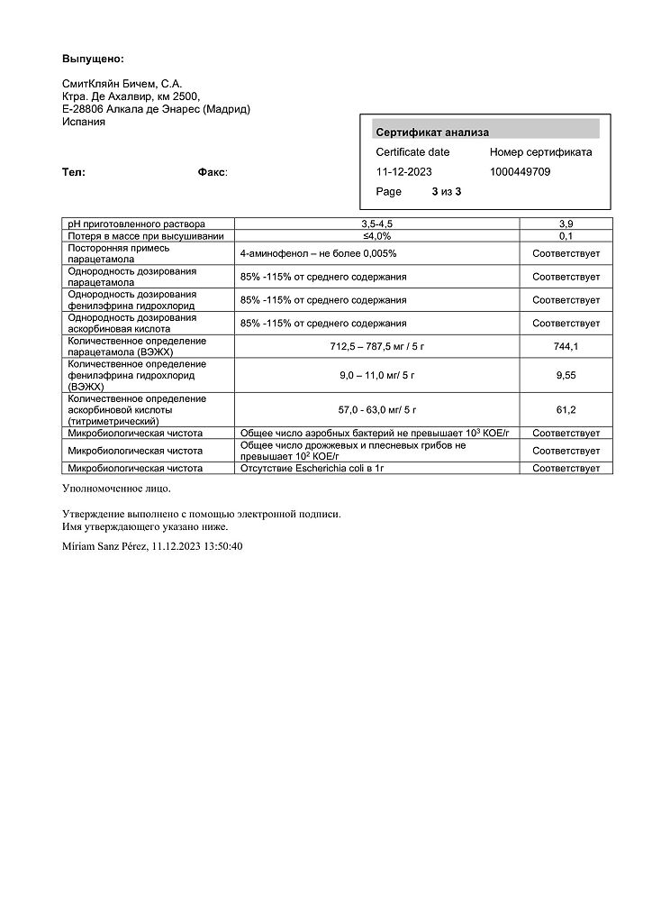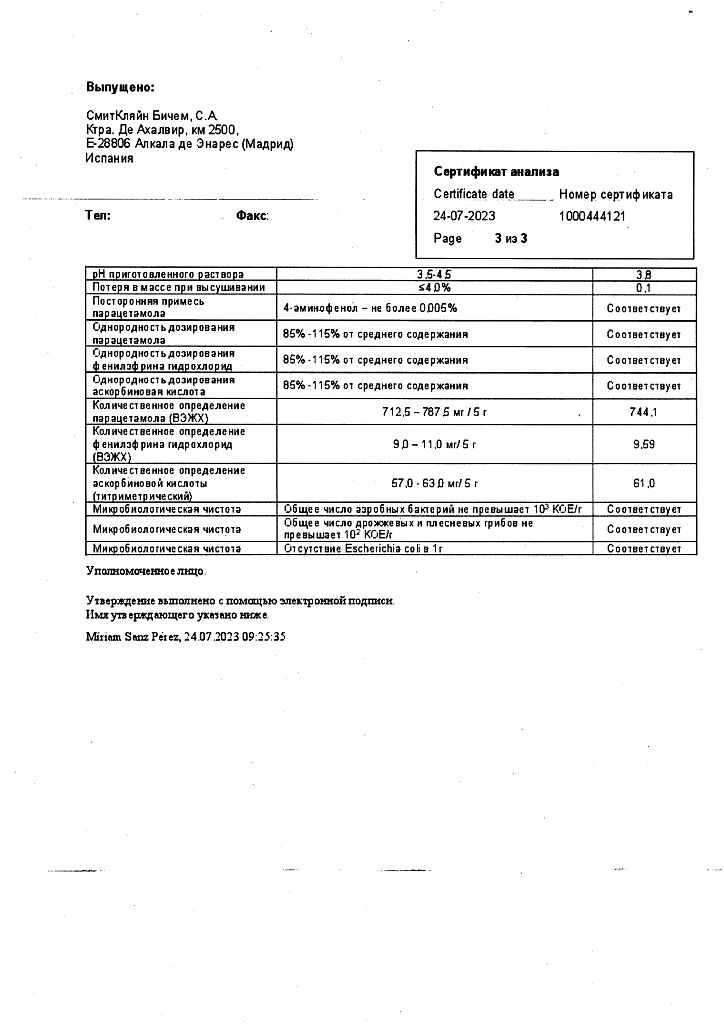 Вспомогательные вещества: лимонная кислота - 600 мг, натрия сахарин - 40 мг, натрия цитрат - 500 мг, лимонный тетраром 100% P05.51 - 50 мг, ароматизатор лимонный 52293/TP.05.51 - 83.33 мг, хинолиновый желтый 14031 (E104) - 0.75 мг, сахароза - 2904.42 мг.