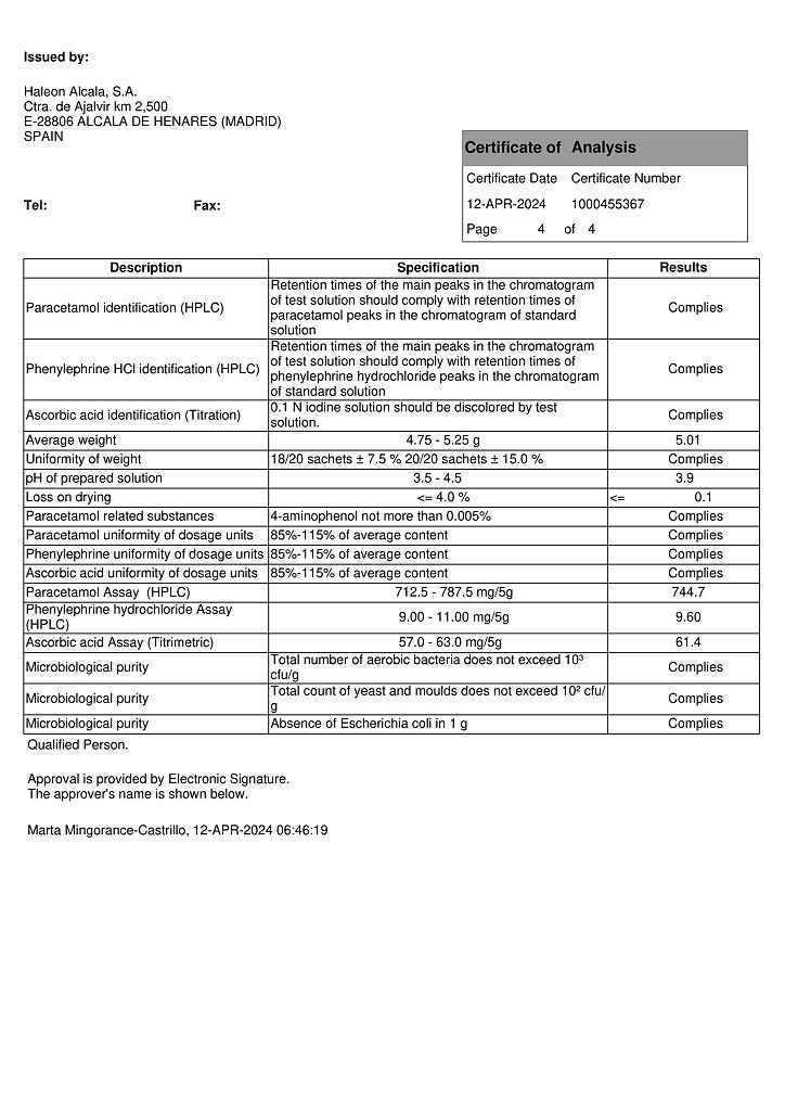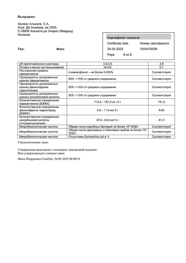 Вспомогательные вещества: лимонная кислота - 600 мг, натрия сахаринат - 10 мг, натрия цитрат - 500 мг, ароматизатор лимонный PHS-163671 - 100 мг, ароматизатор медовый PFW PHS-050860 - 75 мг, ароматизатор медовый Felton F7624P - 125 мг, краситель карамель 626 - 50 мг, крахмал кукурузный - 200 мг, аспартам - 50 мг, сахароза - 2468.5 мг.