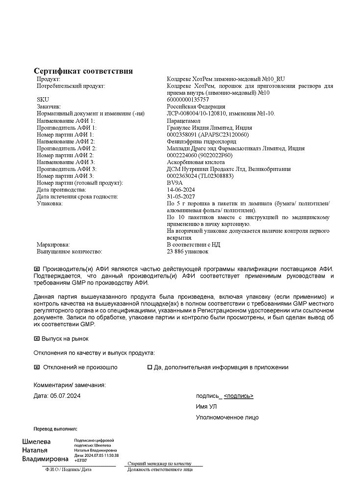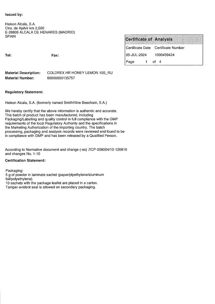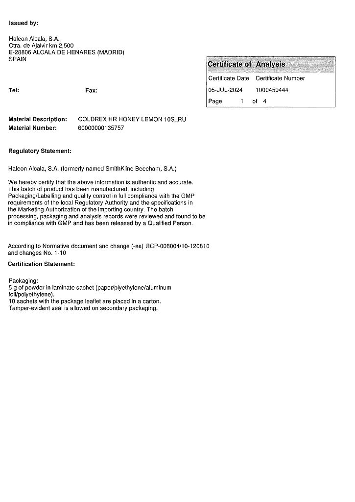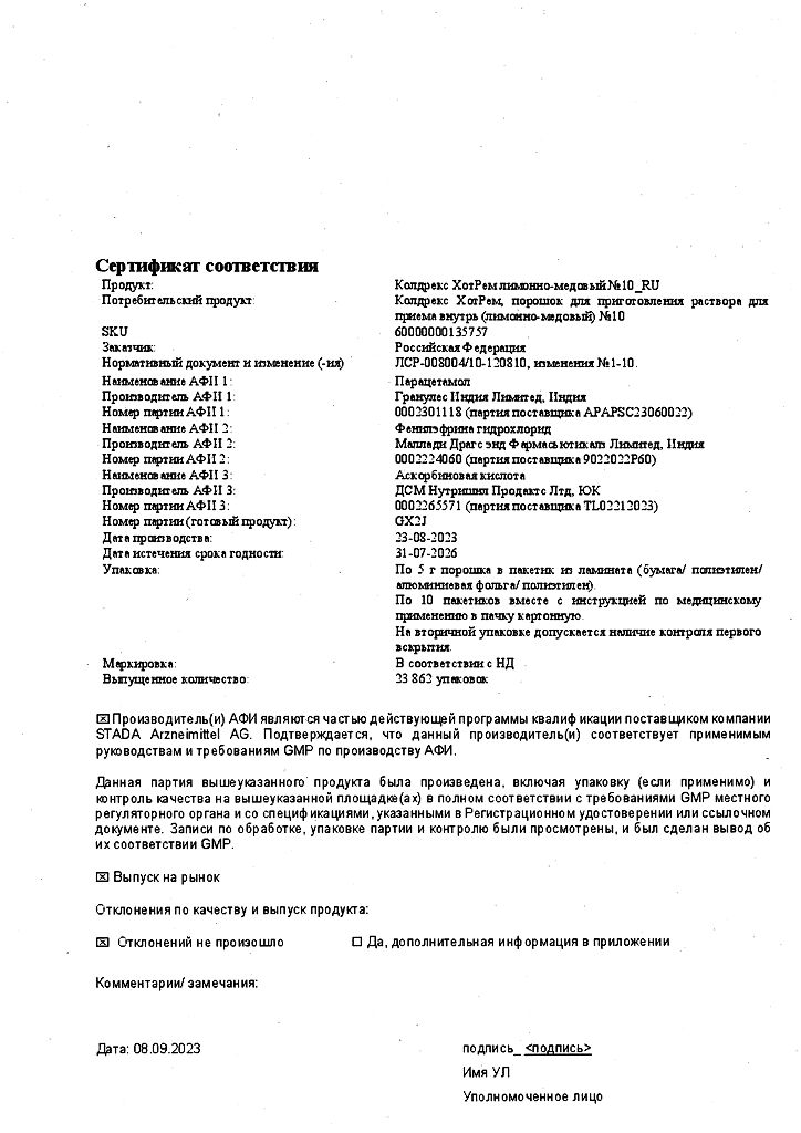 ◊ Порошок для приготовления раствора для приема внутрь (лимонно-медовый) гетерогенный, от серовато-белого с бежевым оттенком до светло-коричневого цвета с белыми, светло-коричневыми и темно-коричневыми включениями; приготовленный раствор - от светло-желтого до светло-коричневого цвета с нерастворимыми включениями белого цвета и характерным запахом лимона и меда.