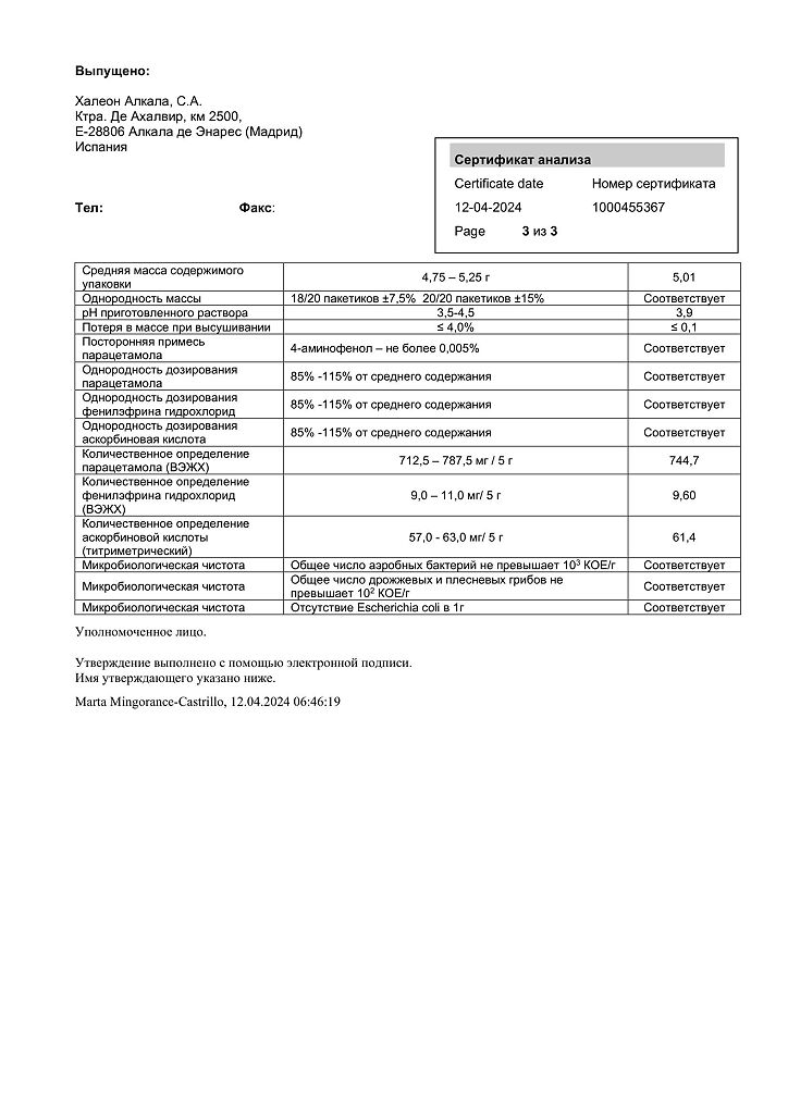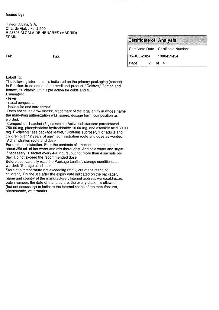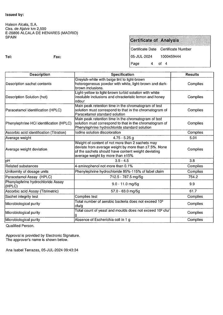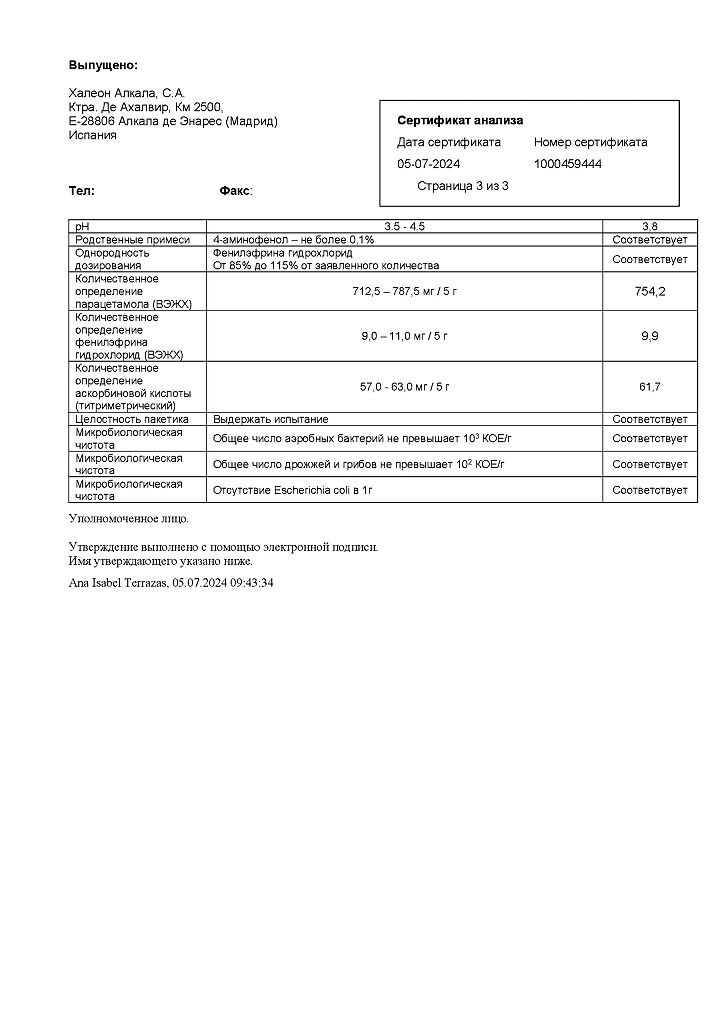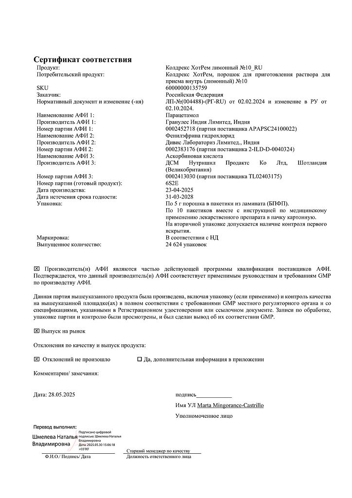 ◊ Порошок для приготовления раствора для приема внутрь (лимонно-медовый) гетерогенный, от серовато-белого с бежевым оттенком до светло-коричневого цвета с белыми, светло-коричневыми и темно-коричневыми включениями; приготовленный раствор - от светло-желтого до светло-коричневого цвета с нерастворимыми включениями белого цвета и характерным запахом лимона и меда.
