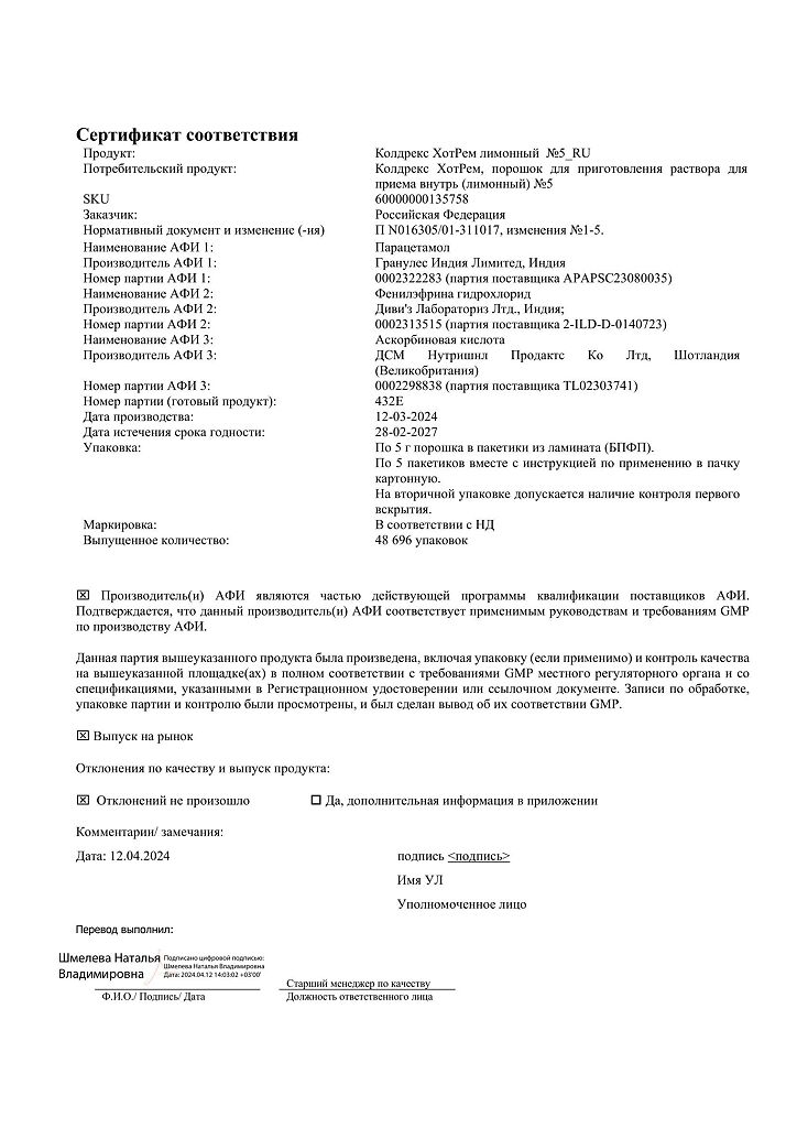 ◊ Порошок для приготовления раствора для приема внутрь (лимонный) кристаллический, от бледно-желтого до желтого цвета, с характерным запахом лимона; приготовленный раствор - желтого цвета, с характерным запахом лимона.