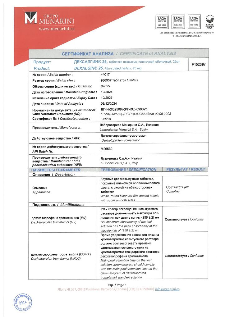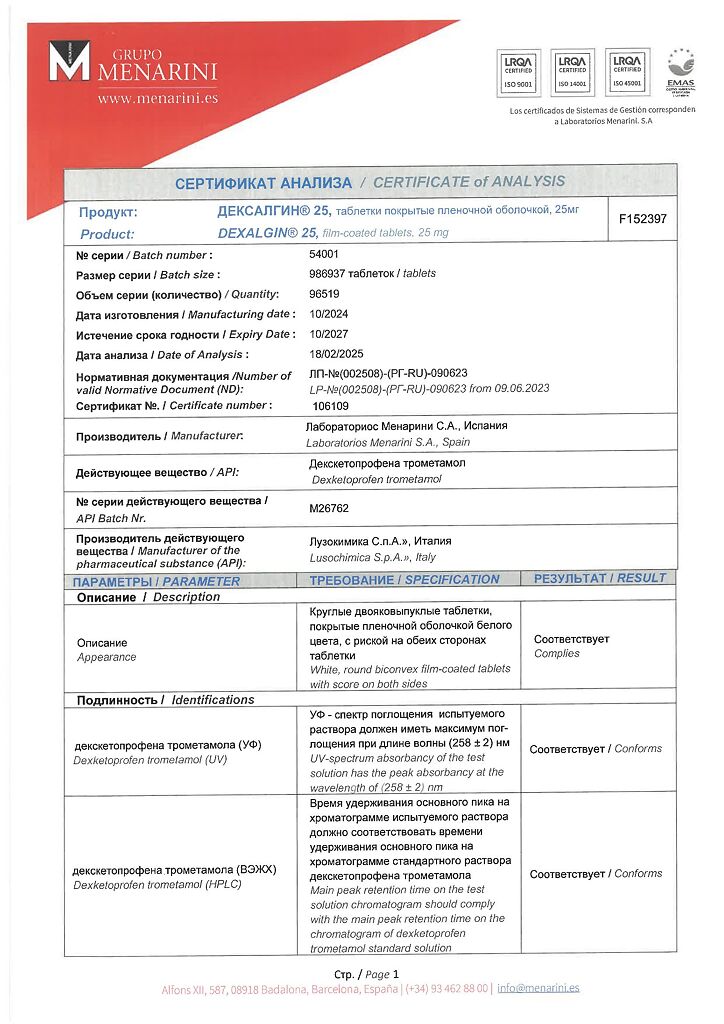 Декскетопрофена трометамол, трометаминовая соль S-(+) энантиомера пропионовой кислоты, относится к нестероидным противовоспалительным препаратам (НПВП) и обладает обезболивающим. противовоспалительным и жаропонижающим действием. Механизм действия декскетопрофена связан с уменьшением синтеза простагландинов за счет подавления активности циклооксигеназ (ЦОГ-1 и ЦОГ-2). Препарат ингибирует превращение арахидоновой кислоты в циклические эндопероксиды PGG2 и PGH2, которые продуцируют простагландины PGE1, PGE2, PGE2α и PGD2, а также простациклин PG12 и тромбоксаны (ТхА2 и ТхВ2). Кроме того, ингибирование синтеза простагландинов может влиять на другие медиаторы воспаления, такие как кинины, обеспечивая не только прямое, но и опосредованное действие.