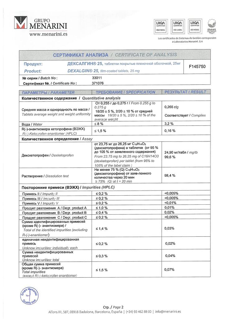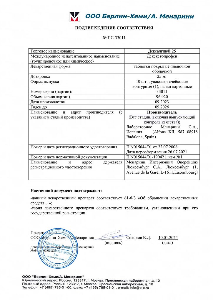 В зависимости от происхождения и тяжести болевого синдрома, рекомендуемая доза для взрослых составляет 25 мг декскетопрофена через каждые 8 ч. Максимальная суточная доза – 75 мг.
