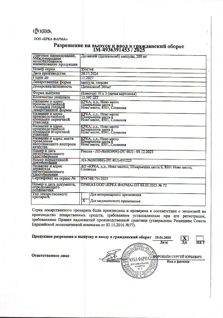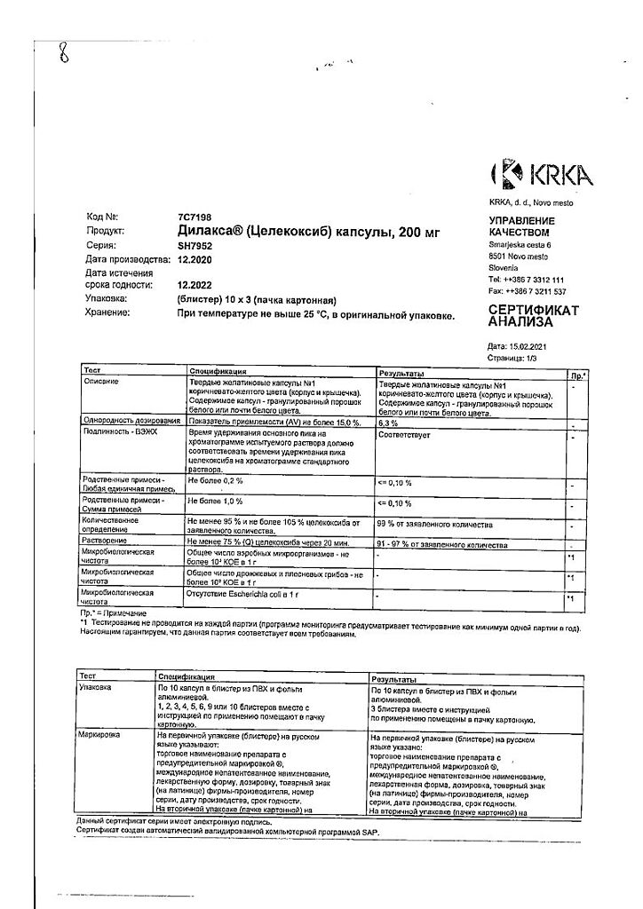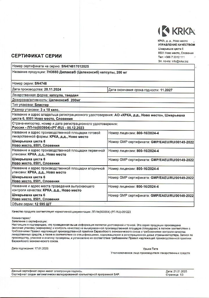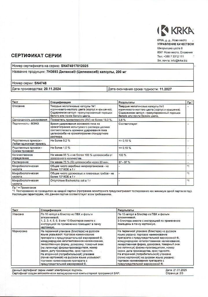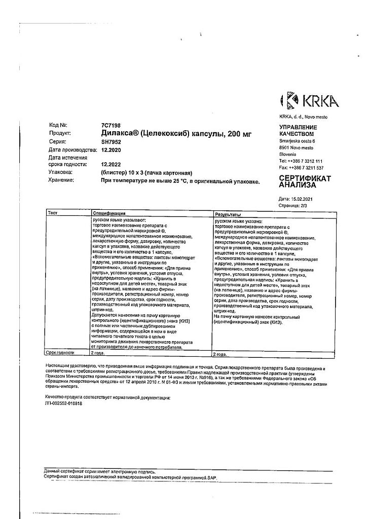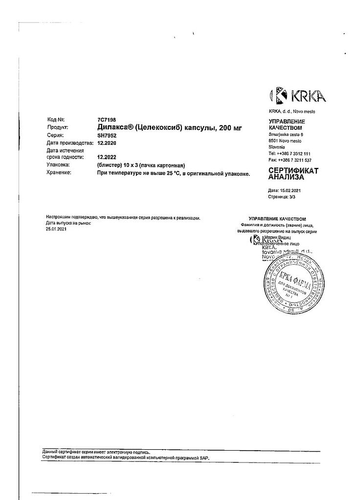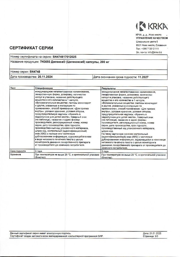 Влияние на ССС. Целекоксиб, как и все коксибы, может увеличивать риск развития серьезных осложнений со стороны ССС, таких как тромбообразование, инфаркт миокарда и инсульт, которые могут привести к летальному исходу. Риск развития этих реакций возрастает с увеличением дозы, длительности приема препарата, а также у пациентов с заболеваниями или факторами риска развития ССС. С целью снижения риска развития этих реакций препарат Дилакса® следует применять в минимальных эффективных дозах и минимально возможным коротким курсом (на усмотрение лечащего врача). Лечащий врач и пациент должны учитывать возможность развития таких осложнений даже при отсутствии ранее известных симптомов нарушения функции ССС. Пациенты должны быть информированы о симптомах серьезных нежелательных эффектов со стороны ССС и мерах, которые следует предпринять в случае их возникновения.