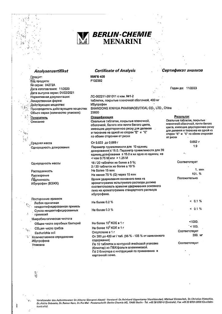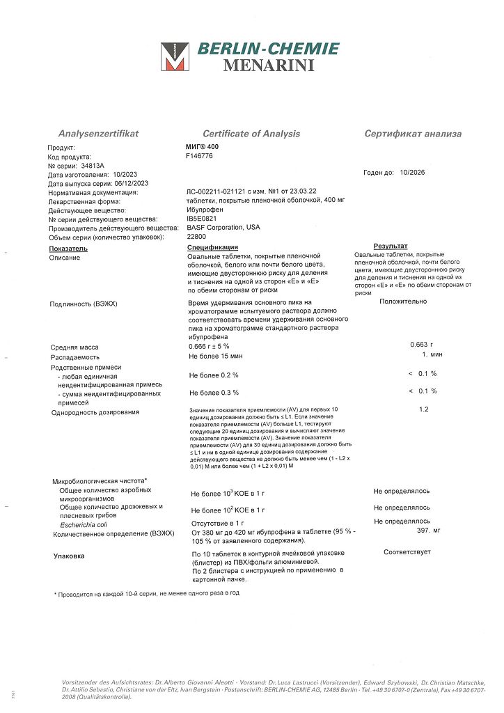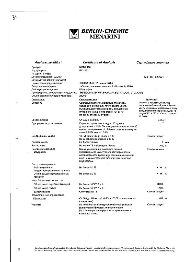 Для достижения быстрого терапевтического эффекта у взрослых разовая доза может быть увеличена до 1 таблетки (400 мг) 3 раза в сутки. При приеме 400 мг (1 таблетка) интервал между приемами препарата должен составлять не менее 6 часов.