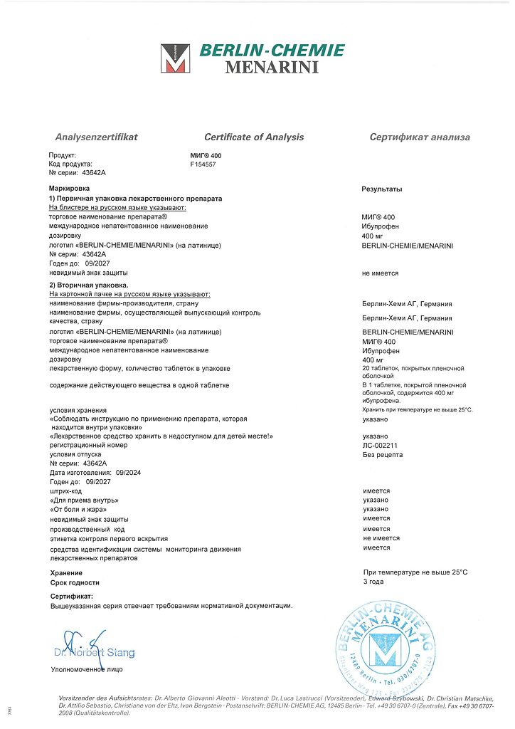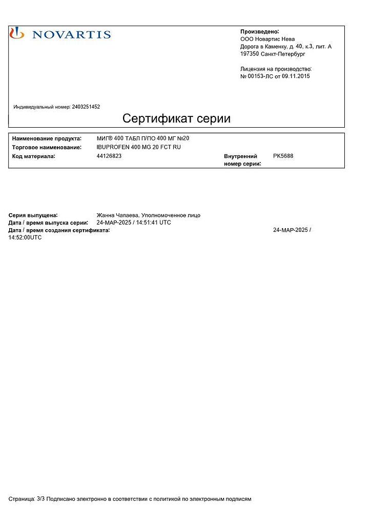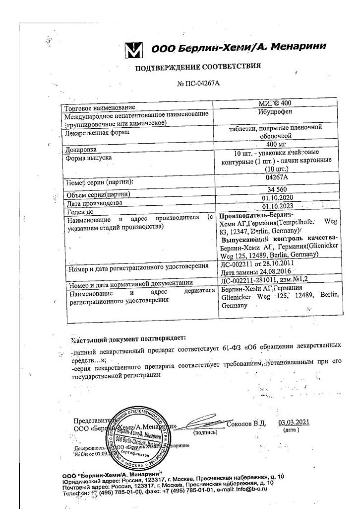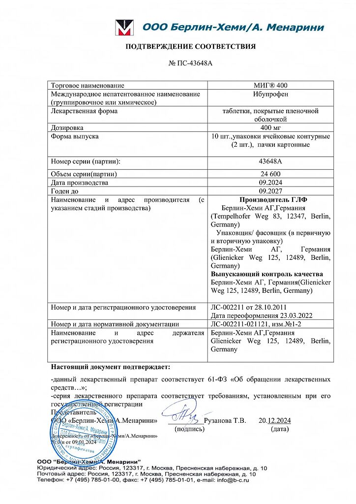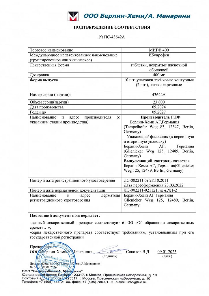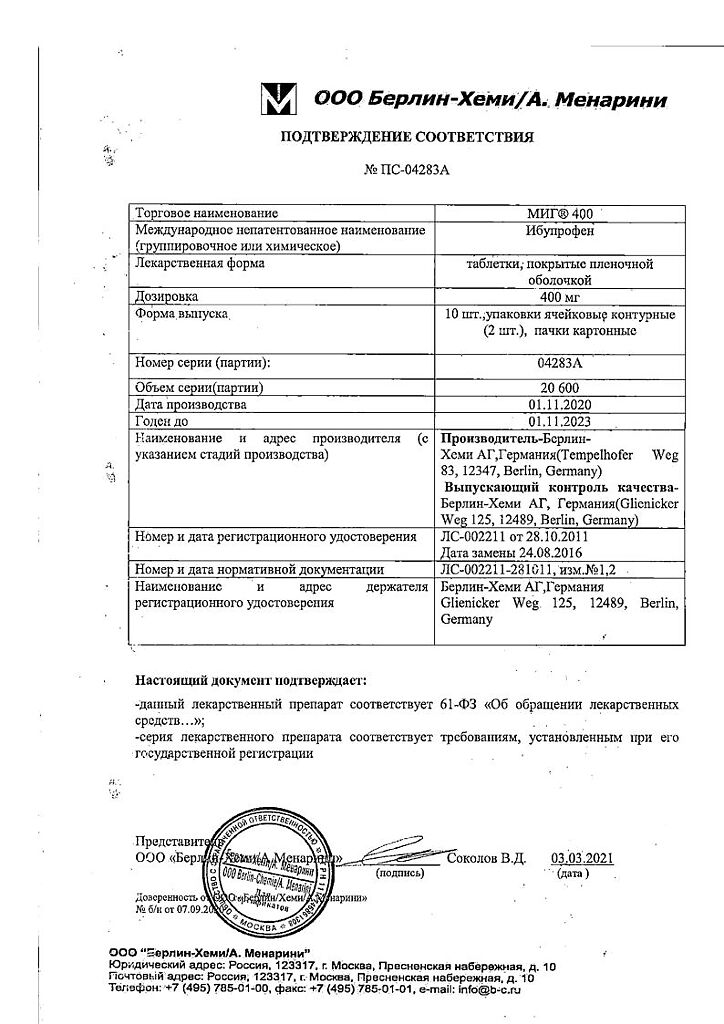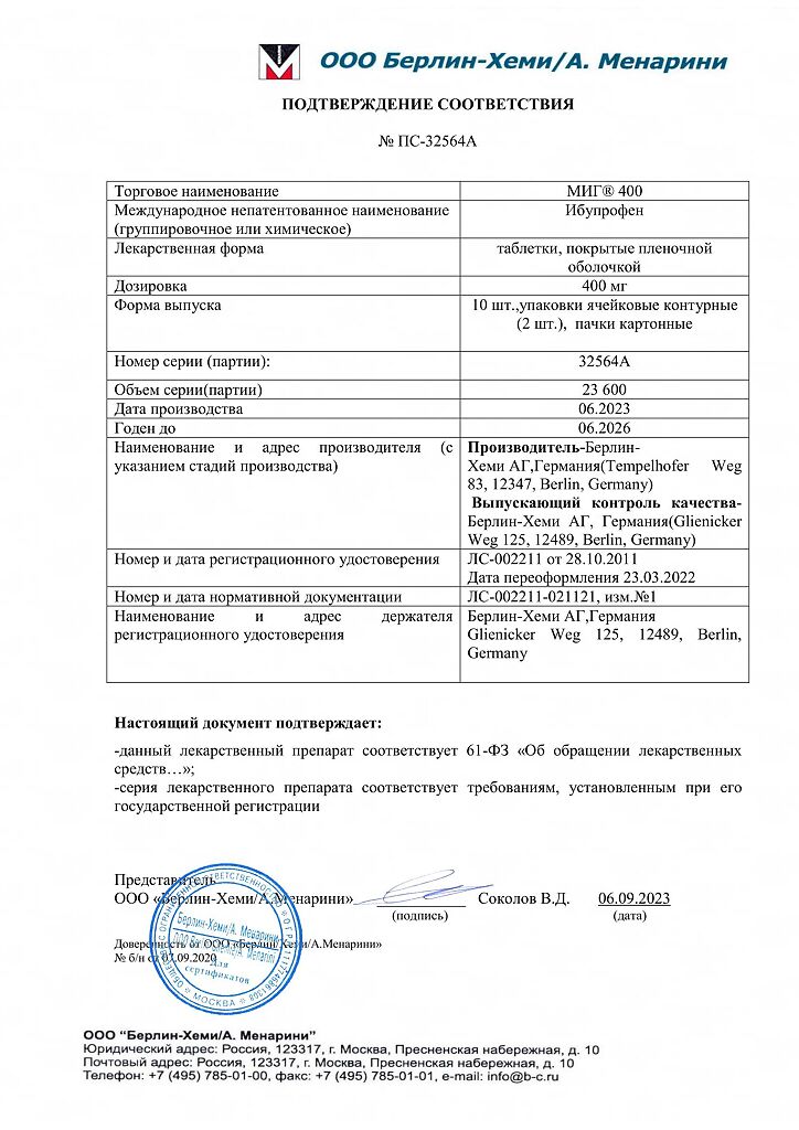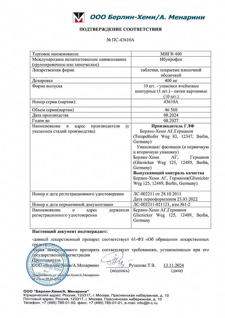 В редких случаях на фоне применения НПВП наблюдались серьезные кожные реакции (некоторые из которых закончились летальным исходом), включая эксфолиативный дерматит, синдром Стивенса - Джонсона, а также токсический эпидермальный некролиз. По-видимому, наибольшему риску пациенты подвержены в начале лечения, т.к. у большинства пациентов указанные реакции развивались в первый месяц терапии. Имеются сообщения о случаях острого генерализованного экзантематозного пустулеза (AGEP), связанных с применением препаратов, содержащих ибупрофен. При первом появлении кожной сыпи, поражении слизистых оболочек или любых других признаков гиперчувствительности применение препарата МИГ® 400 следует прекратить.