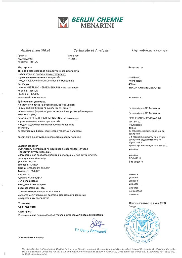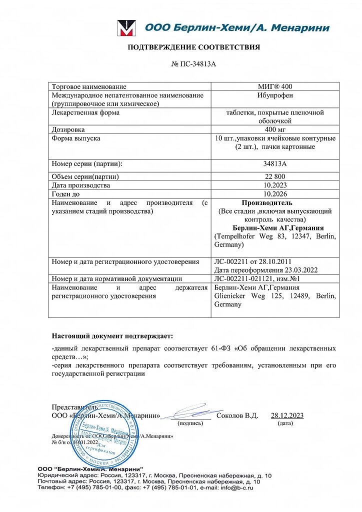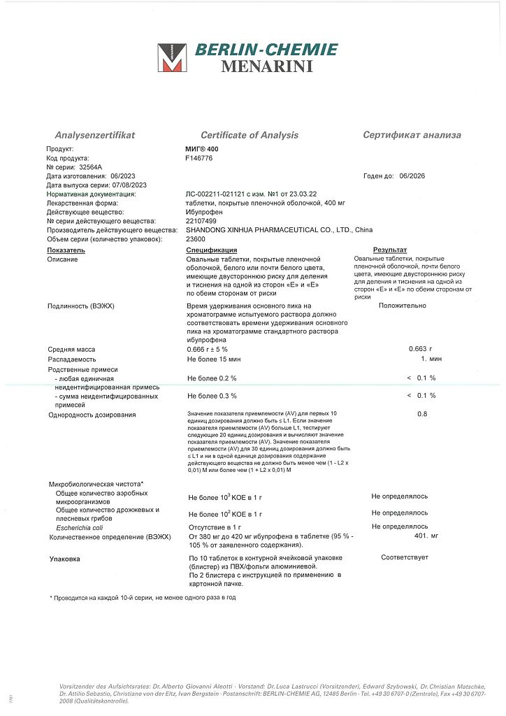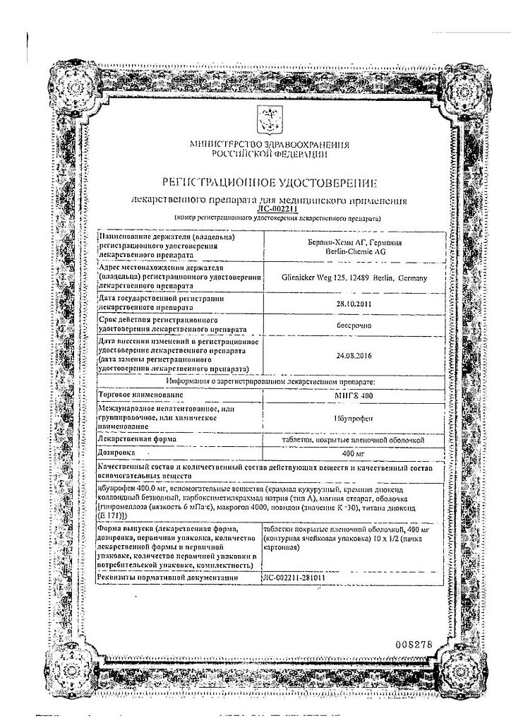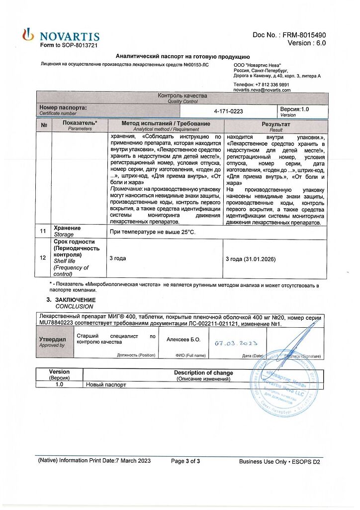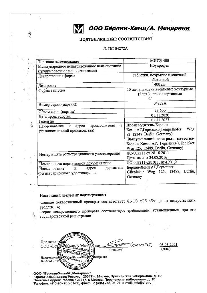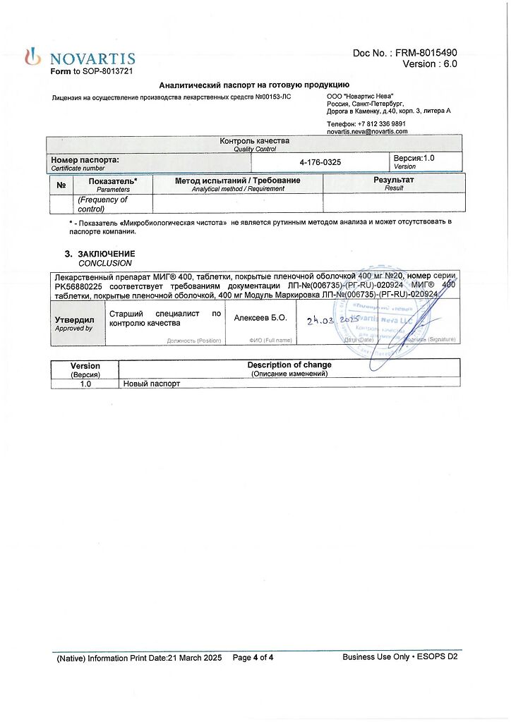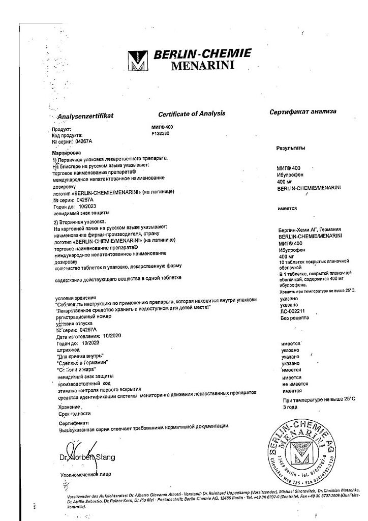 В редких случаях на фоне применения НПВП наблюдались серьезные кожные реакции (некоторые из которых закончились летальным исходом), включая эксфолиативный дерматит, синдром Стивенса - Джонсона, а также токсический эпидермальный некролиз. По-видимому, наибольшему риску пациенты подвержены в начале лечения, т.к. у большинства пациентов указанные реакции развивались в первый месяц терапии. Имеются сообщения о случаях острого генерализованного экзантематозного пустулеза (AGEP), связанных с применением препаратов, содержащих ибупрофен. При первом появлении кожной сыпи, поражении слизистых оболочек или любых других признаков гиперчувствительности применение препарата МИГ® 400 следует прекратить.