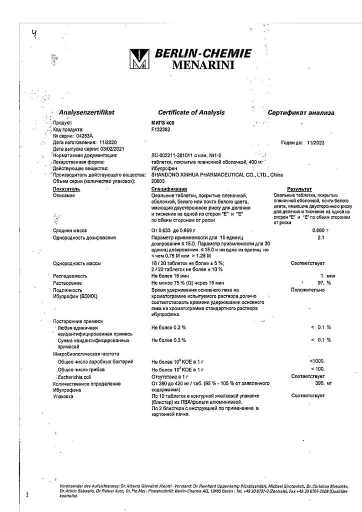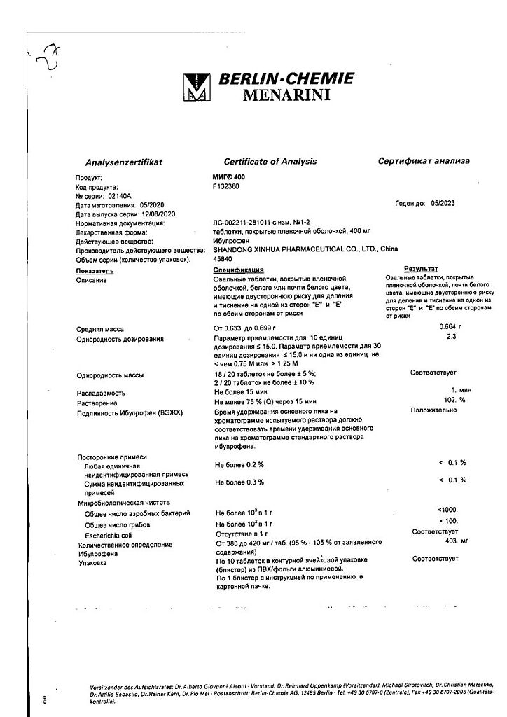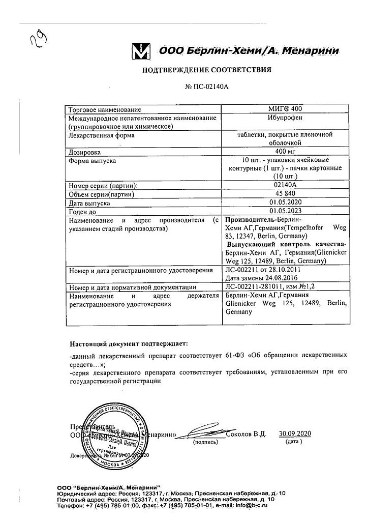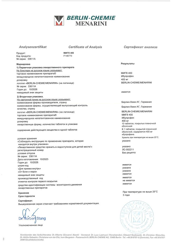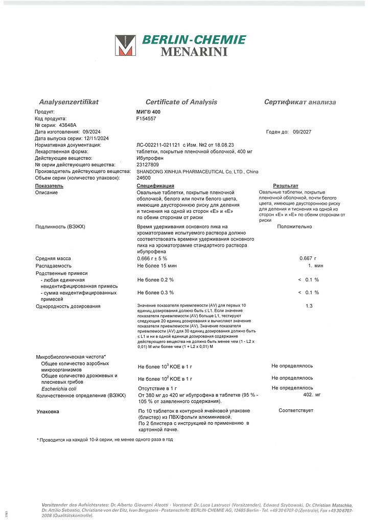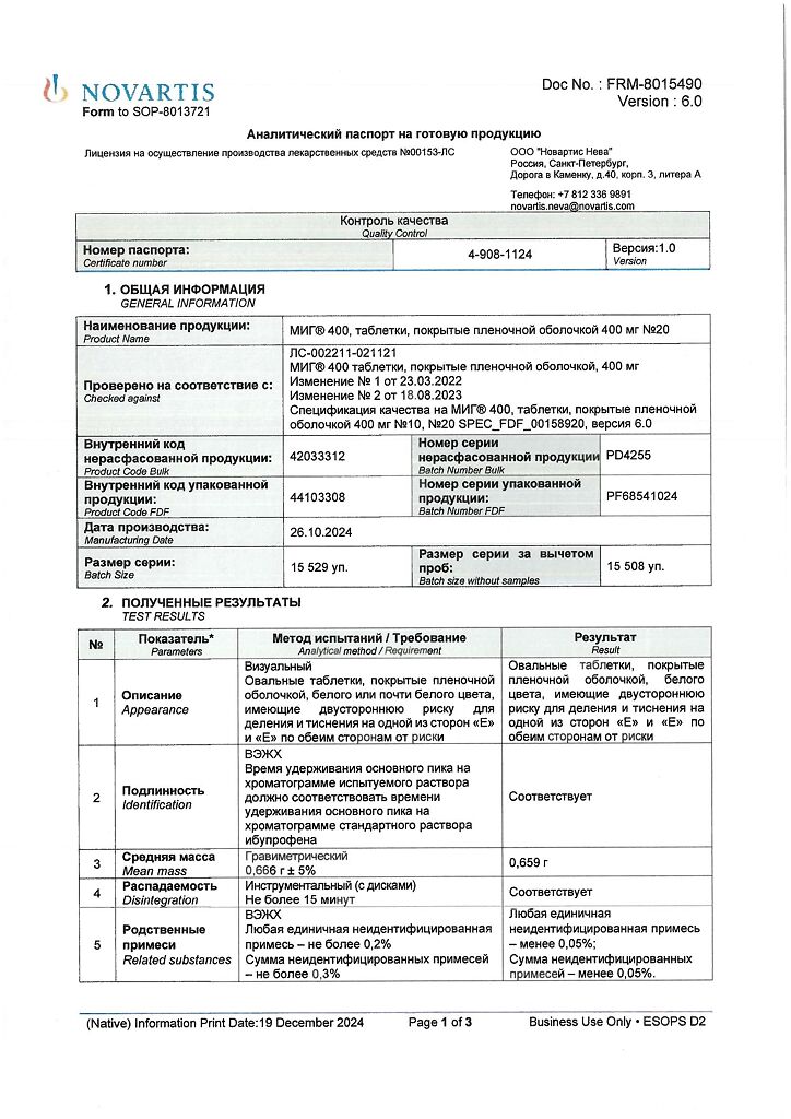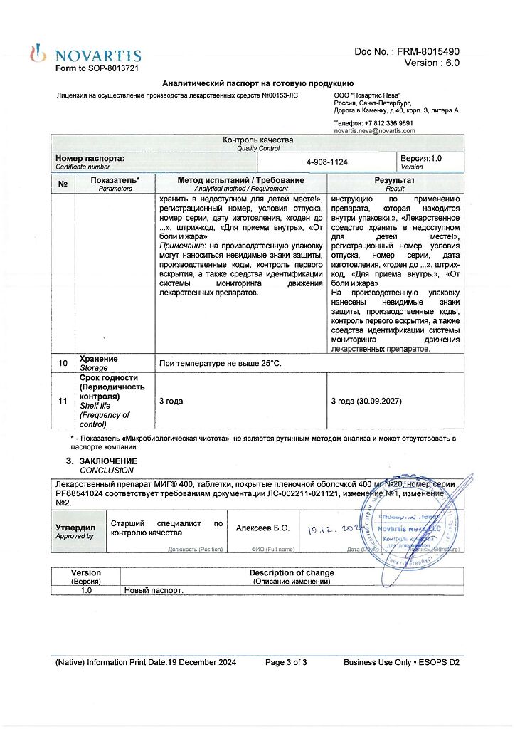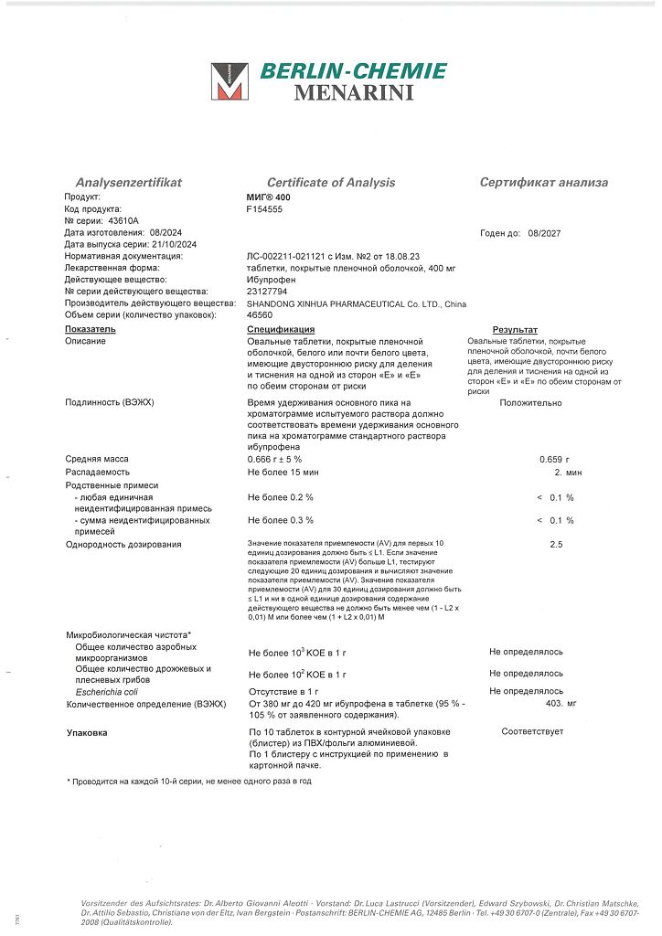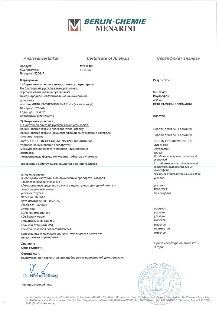 В редких случаях на фоне применения НПВП наблюдались серьезные кожные реакции (некоторые из которых закончились летальным исходом), включая эксфолиативный дерматит, синдром Стивенса - Джонсона, а также токсический эпидермальный некролиз. По-видимому, наибольшему риску пациенты подвержены в начале лечения, т.к. у большинства пациентов указанные реакции развивались в первый месяц терапии. Имеются сообщения о случаях острого генерализованного экзантематозного пустулеза (AGEP), связанных с применением препаратов, содержащих ибупрофен. При первом появлении кожной сыпи, поражении слизистых оболочек или любых других признаков гиперчувствительности применение препарата МИГ® 400 следует прекратить.