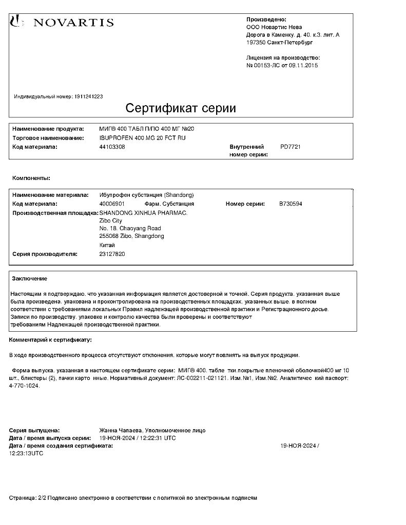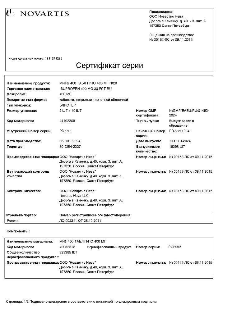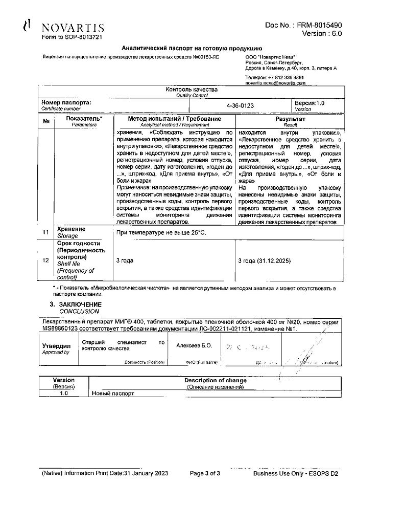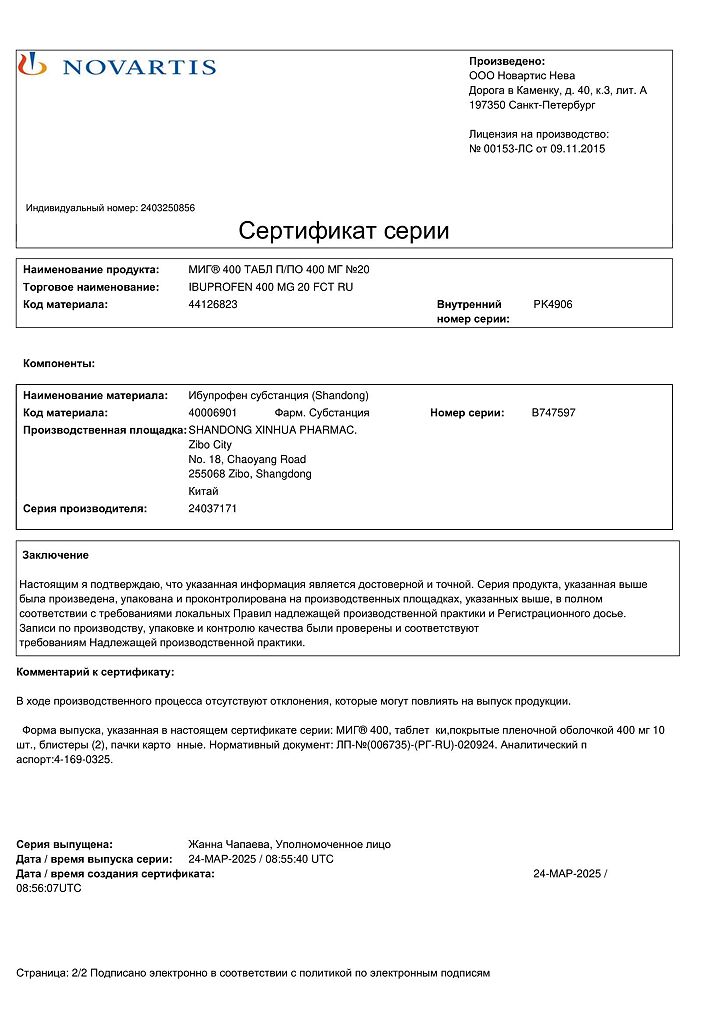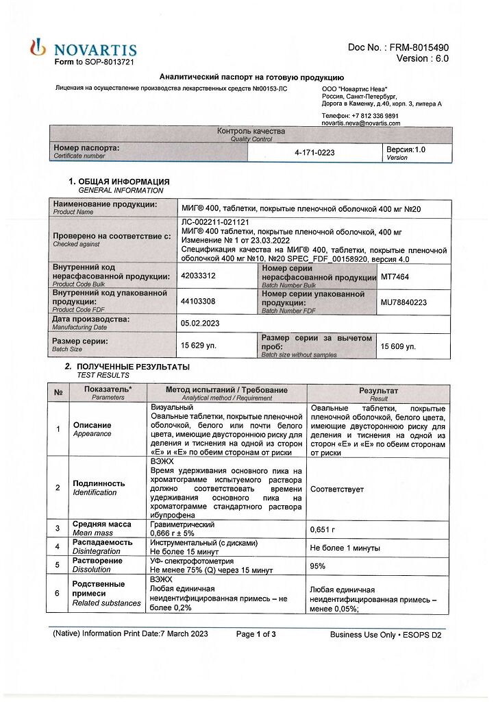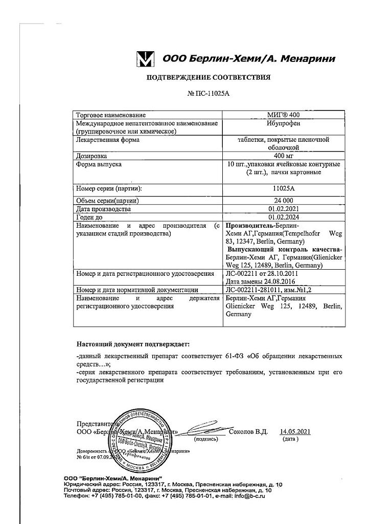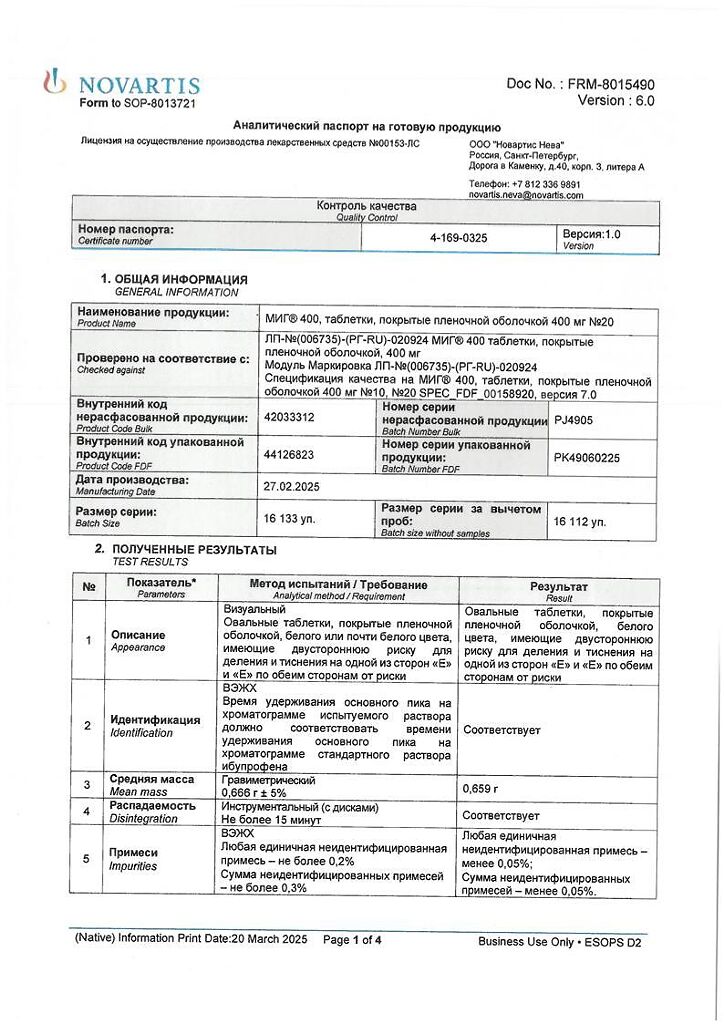 В редких случаях на фоне применения НПВП наблюдались серьезные кожные реакции (некоторые из которых закончились летальным исходом), включая эксфолиативный дерматит, синдром Стивенса - Джонсона, а также токсический эпидермальный некролиз. По-видимому, наибольшему риску пациенты подвержены в начале лечения, т.к. у большинства пациентов указанные реакции развивались в первый месяц терапии. Имеются сообщения о случаях острого генерализованного экзантематозного пустулеза (AGEP), связанных с применением препаратов, содержащих ибупрофен. При первом появлении кожной сыпи, поражении слизистых оболочек или любых других признаков гиперчувствительности применение препарата МИГ® 400 следует прекратить.