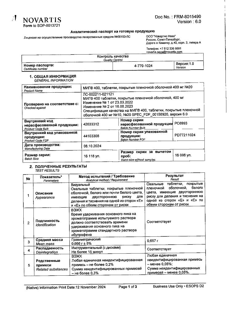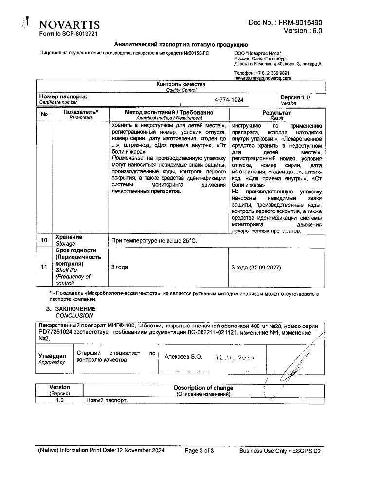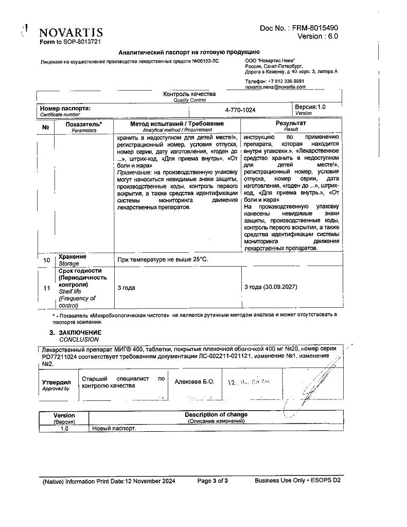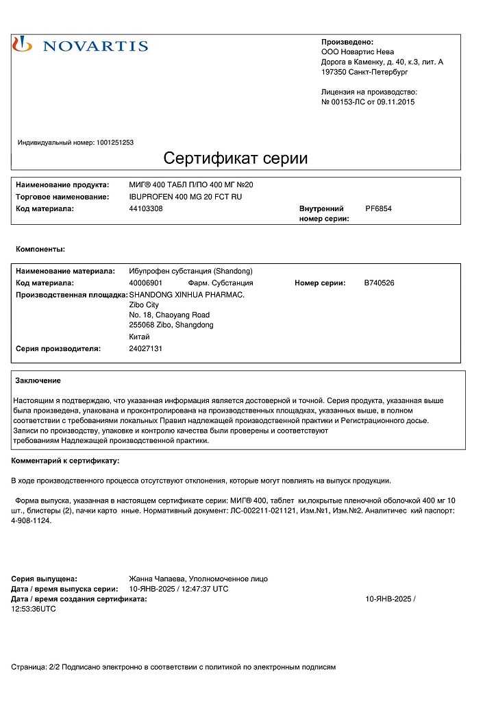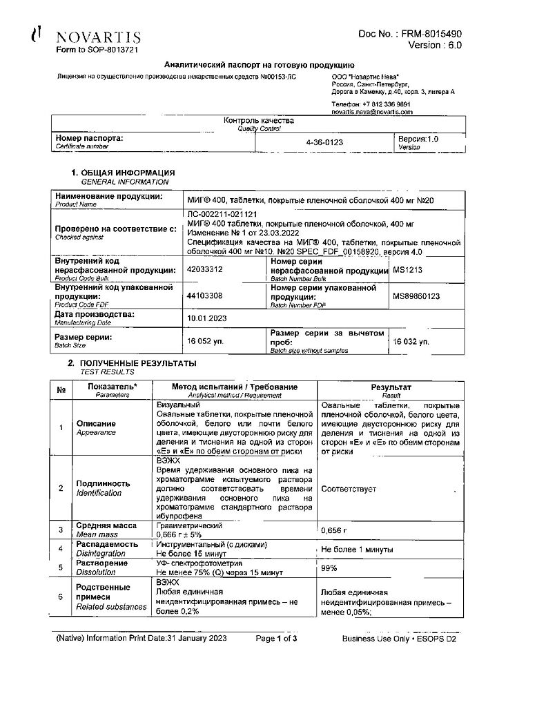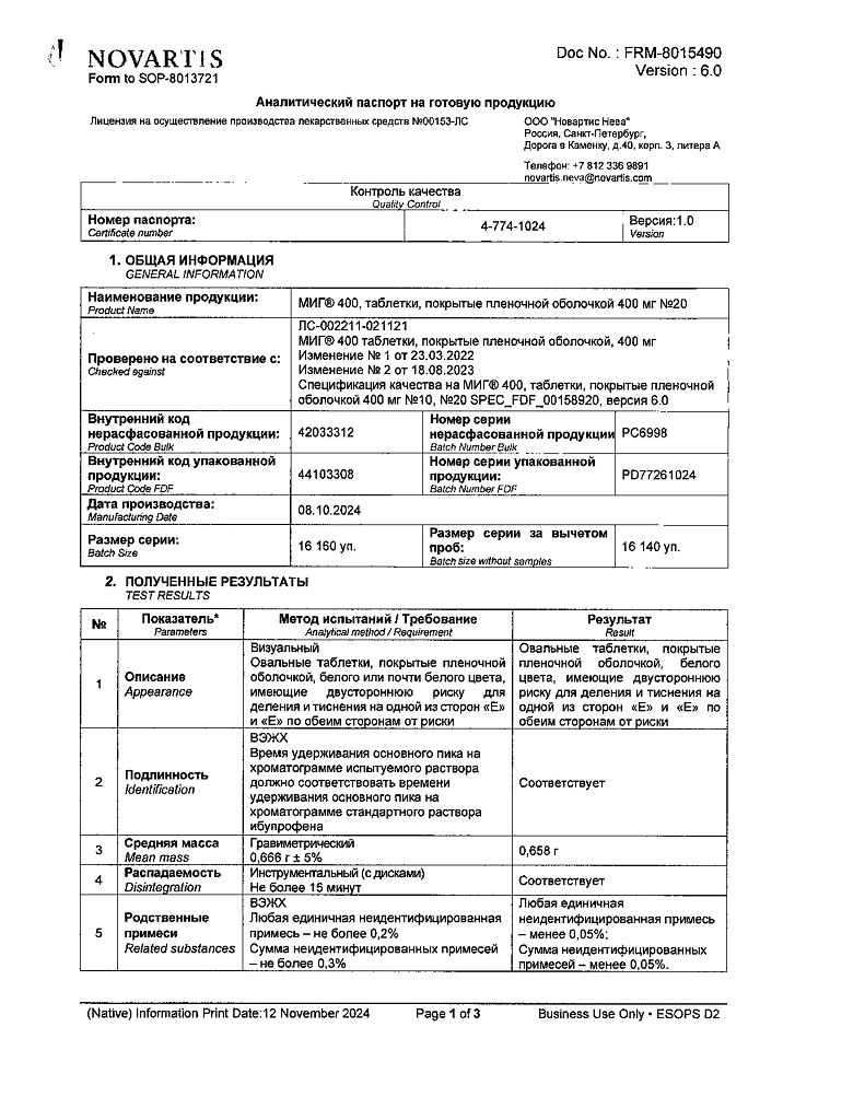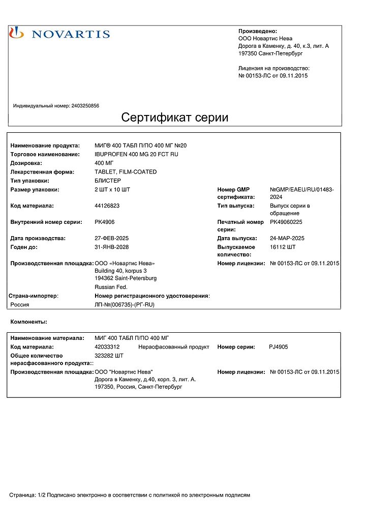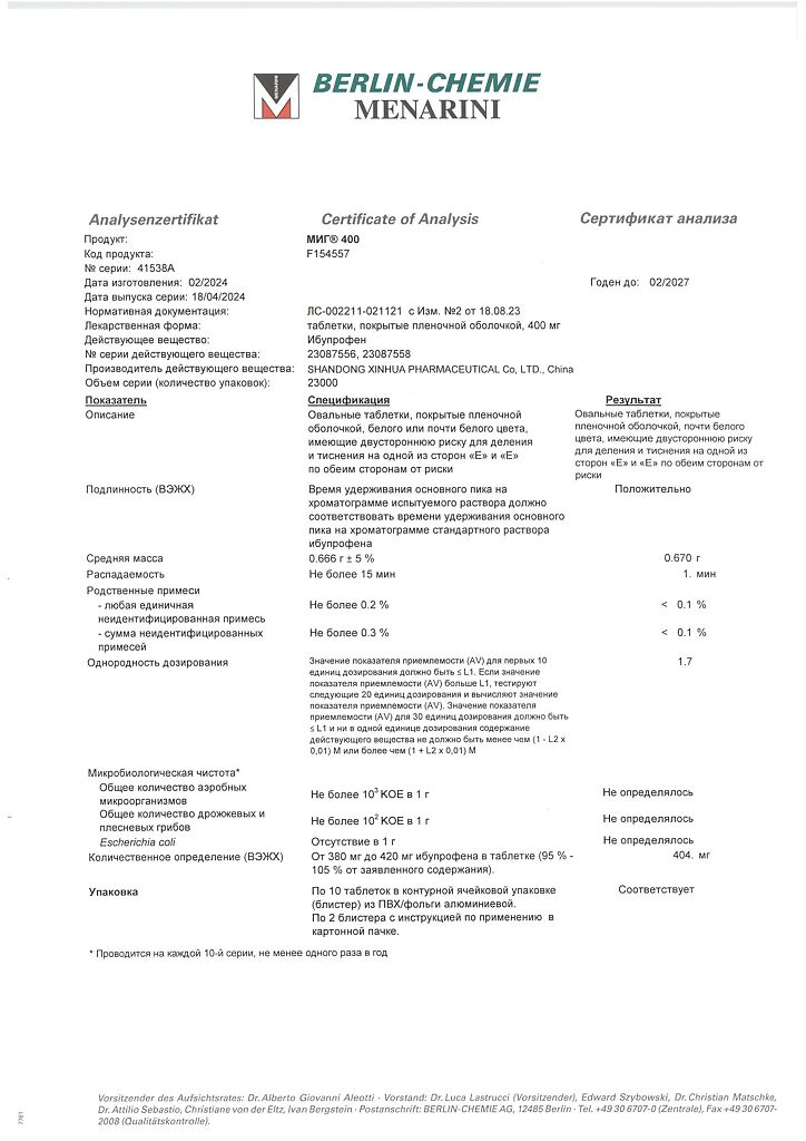 В редких случаях на фоне применения НПВП наблюдались серьезные кожные реакции (некоторые из которых закончились летальным исходом), включая эксфолиативный дерматит, синдром Стивенса - Джонсона, а также токсический эпидермальный некролиз. По-видимому, наибольшему риску пациенты подвержены в начале лечения, т.к. у большинства пациентов указанные реакции развивались в первый месяц терапии. Имеются сообщения о случаях острого генерализованного экзантематозного пустулеза (AGEP), связанных с применением препаратов, содержащих ибупрофен. При первом появлении кожной сыпи, поражении слизистых оболочек или любых других признаков гиперчувствительности применение препарата МИГ® 400 следует прекратить.