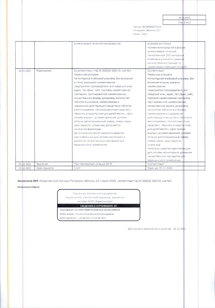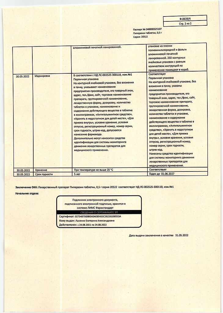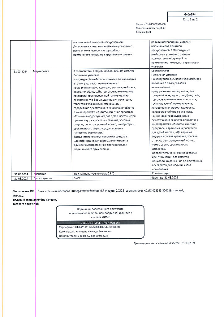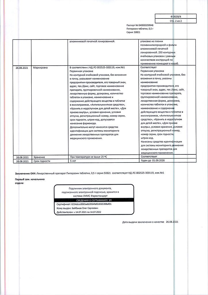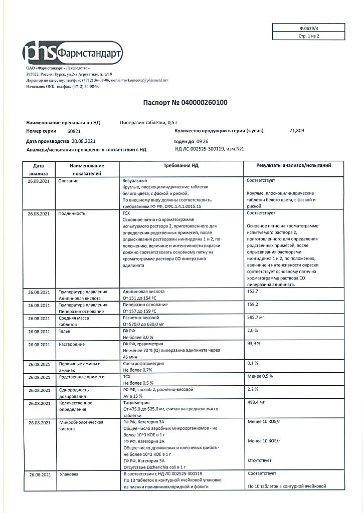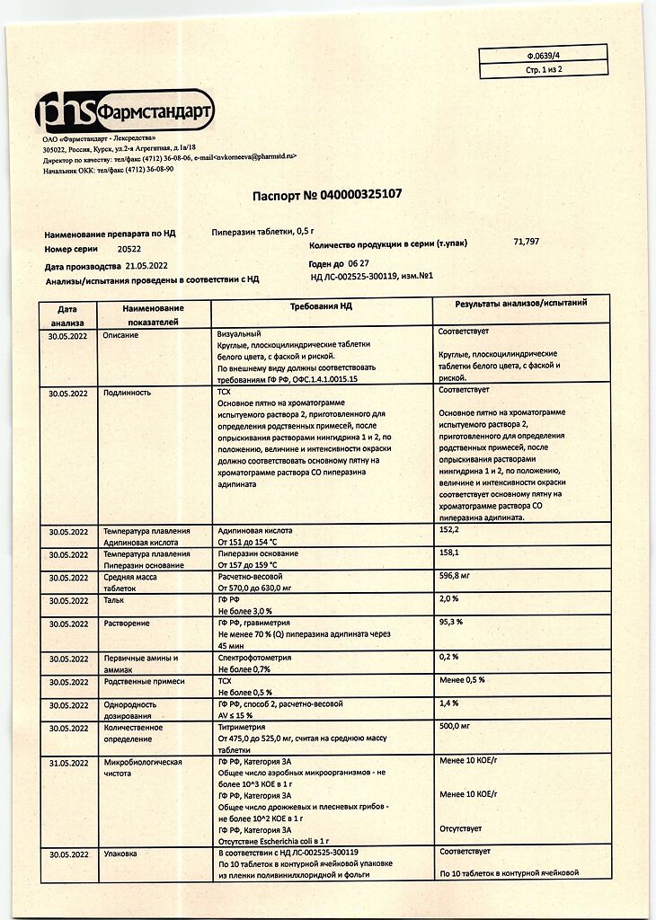 Выраженность дегельминтизации препаратом находится на уровне 90-95%, а при повторном применении может составить около 100%. Ввиду того что пиперазин не уничтожает аскарид, отсутствует опасность всасывания биологических токсичных продуктов их распада. Малотоксичен.