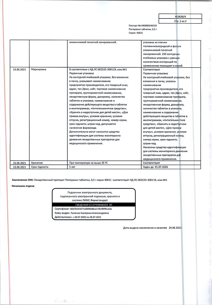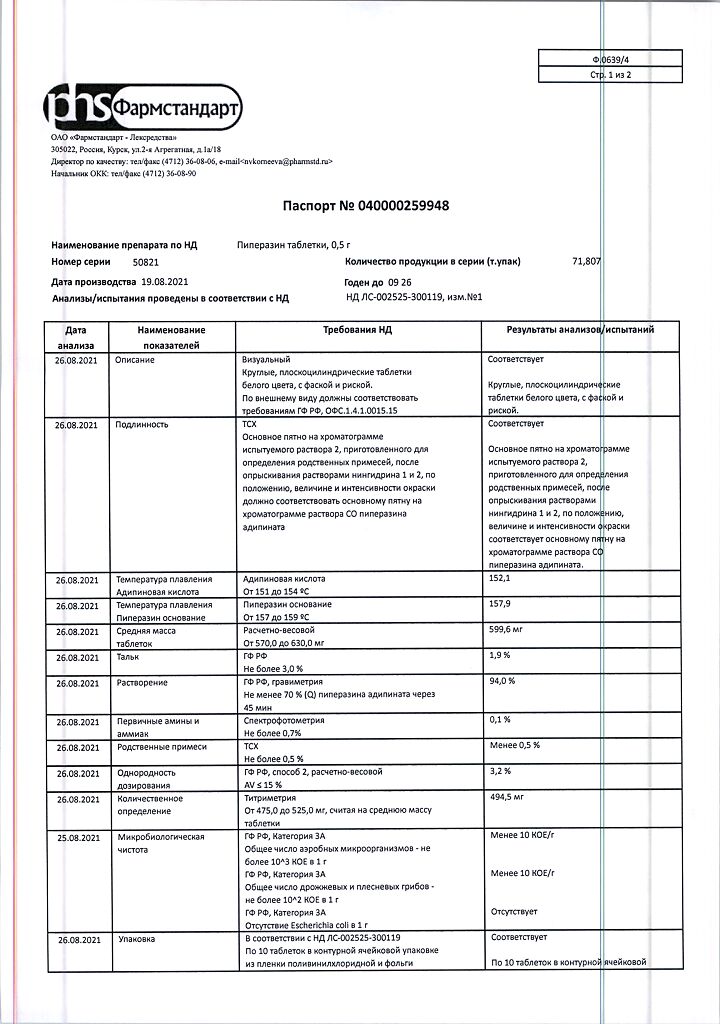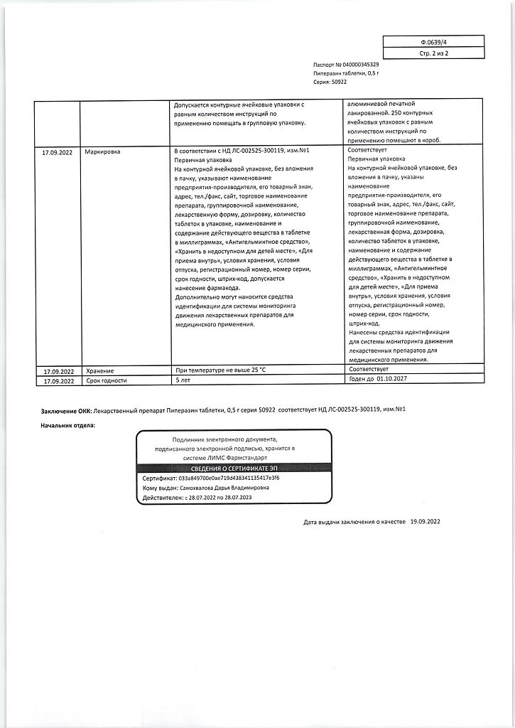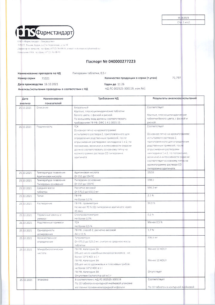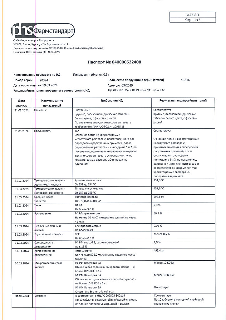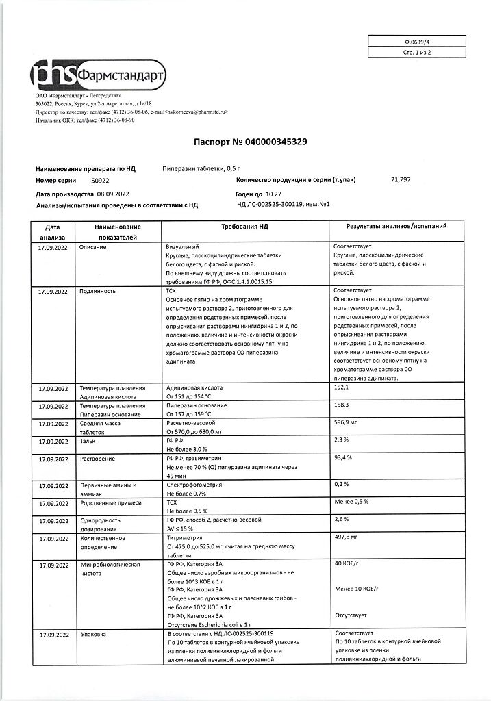 Действующее вещество: пиперазина адипат (пиперазина адипинат) - 200 и 500 мг;