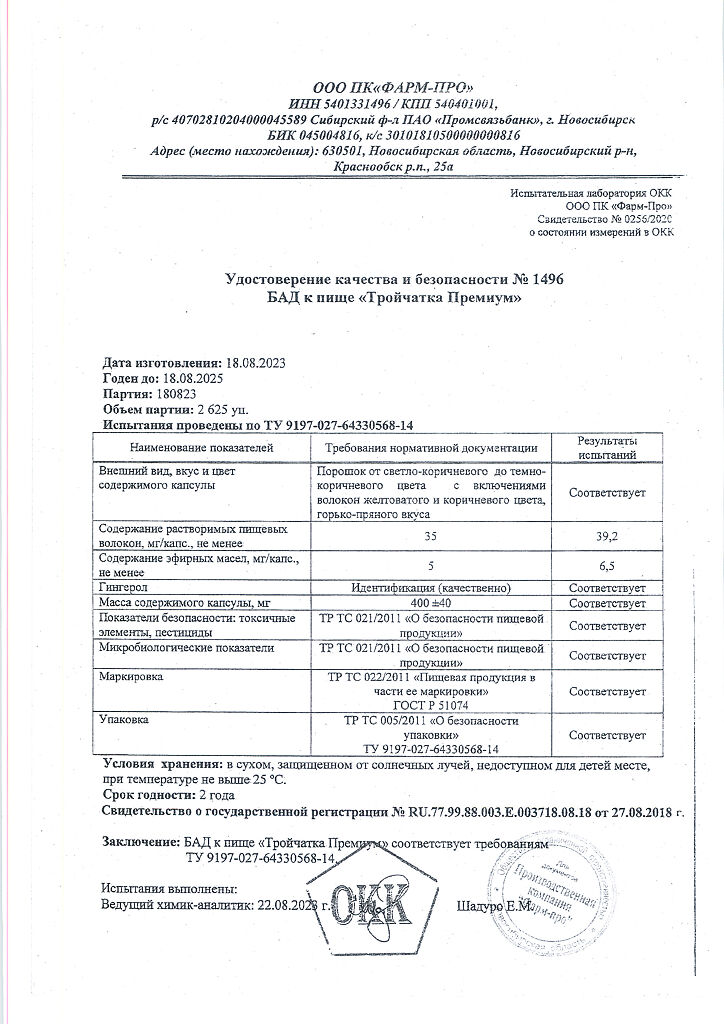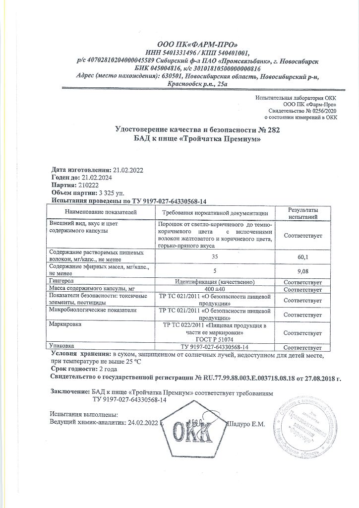 Структура состава Тройчатка Премиум построена по принципу синергизма:во-первых, каждый из ингредиентов формулы максимально проявляет свои биологически активные свойства в отношении ЖКТ и борьбы с паразитами; во-вторых, компоненты формулы взаимно усиливают действие друг друга, повышая эффективность (при более коротком курсе приема по сравнению с конкурентами).