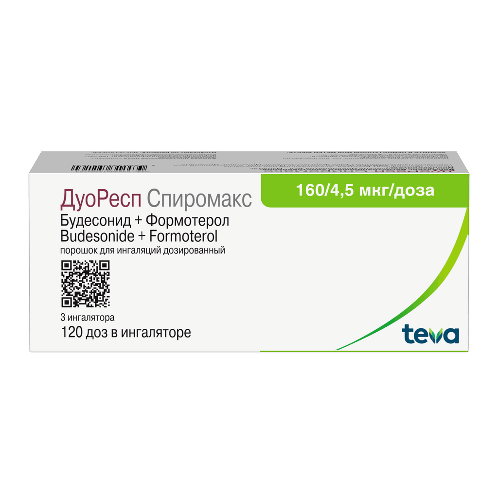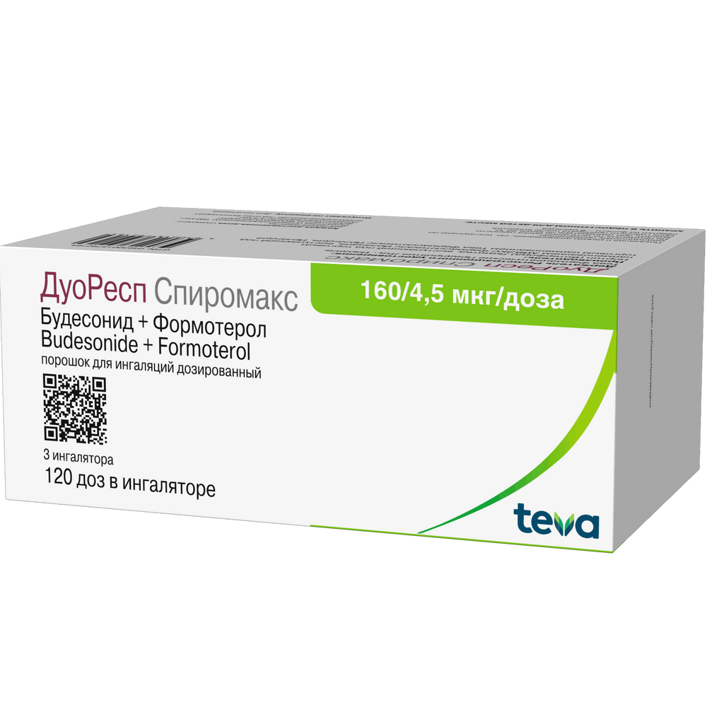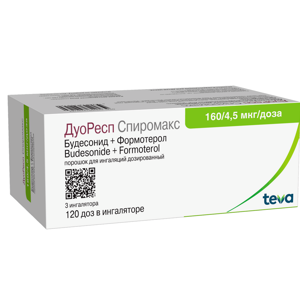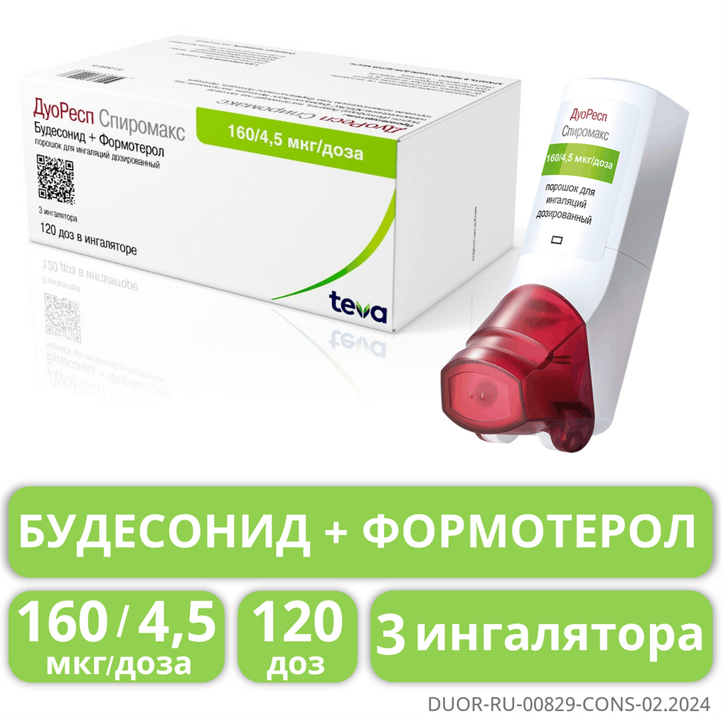 Препарат ДуоРесп Спиромакс содержит формотерол и будесонид, которые имеют разные механизмы действия и проявляют аддитивный эффект в отношении снижения частоты обострений бронхиальной астмы и ХОБЛ.