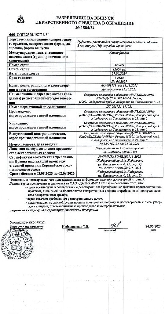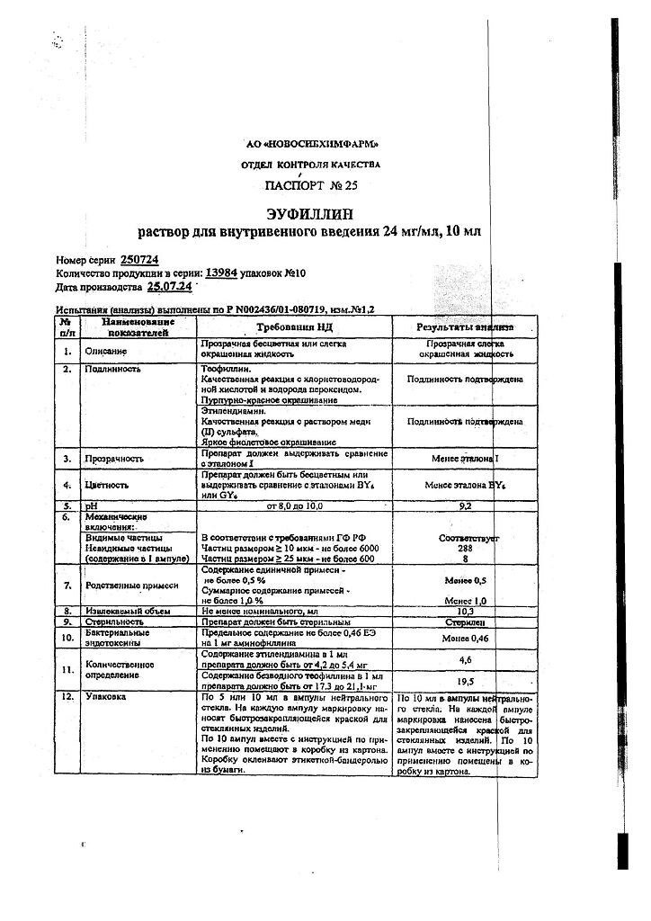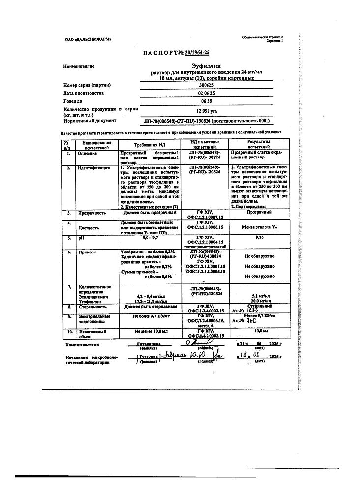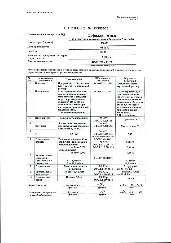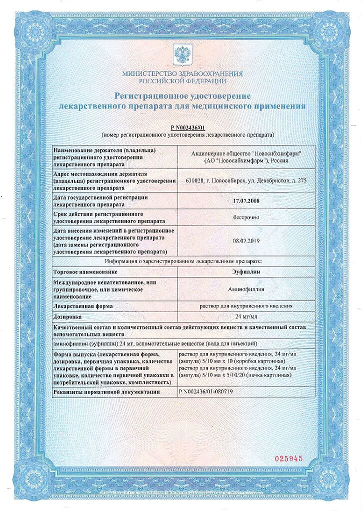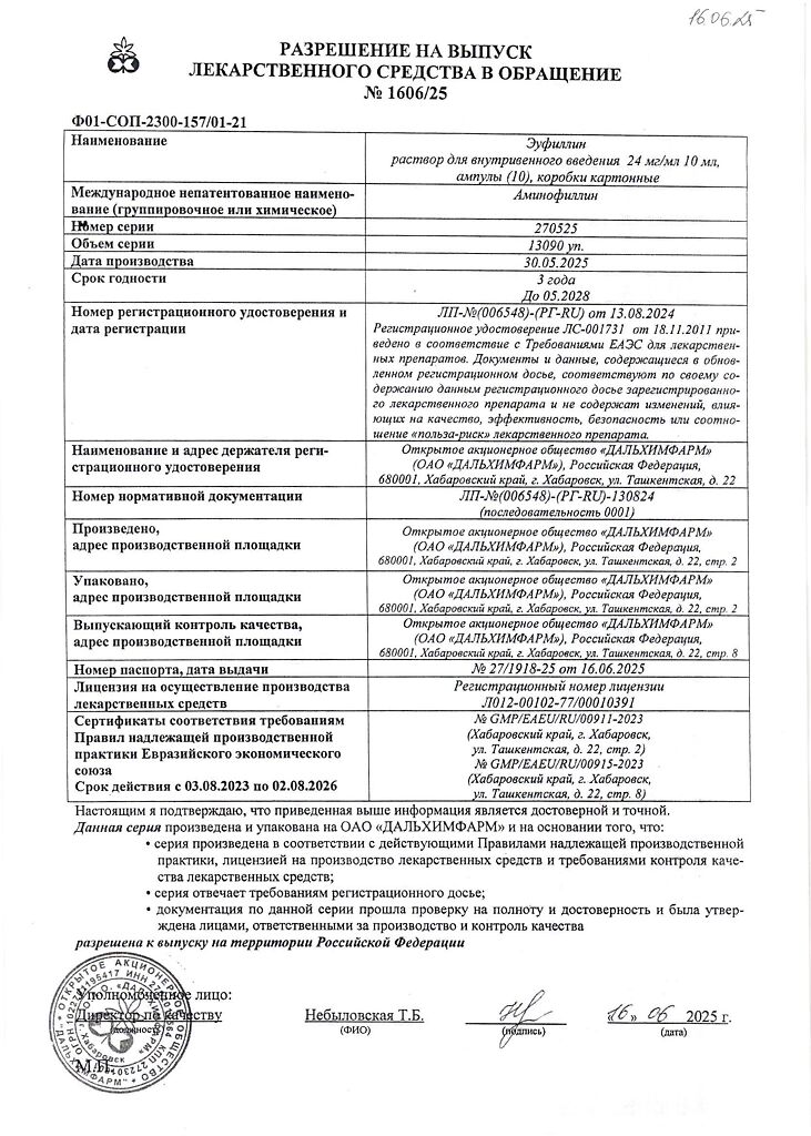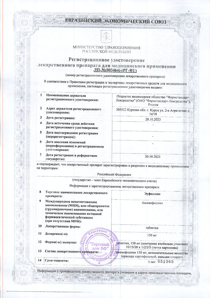 Эуфиллин - бронхолитическое средство, ингибитор ФДЭ. Представляет собой этилендиаминовую соль теофиллина (что облегчает растворимость и увеличивает абсорбцию). Оказывает бронхорасширяющее действие, обусловленное, по-видимому, прямым расслабляющим влиянием на гладкую мускулатуру дыхательных путей и кровеносных сосудов легких. Полагают, что это действие вызвано избирательным подавлением активности специфических ФДЭ, что приводит к повышению внутриклеточной концентрации цАМФ. Результаты экспериментальных исследований in vitro показывают, что основную роль, по-видимому, играют изоферменты III и IV типов. Подавление активности этих изоферментов может также вызывать некоторые побочные эффекты аминофиллина (теофиллина), в т.ч. рвоту, артериальную гипотензию и тахикардию. Блокирует аденозиновые (пуриновые) рецепторы, что может быть одним из факторов действия на бронхи.