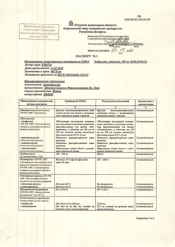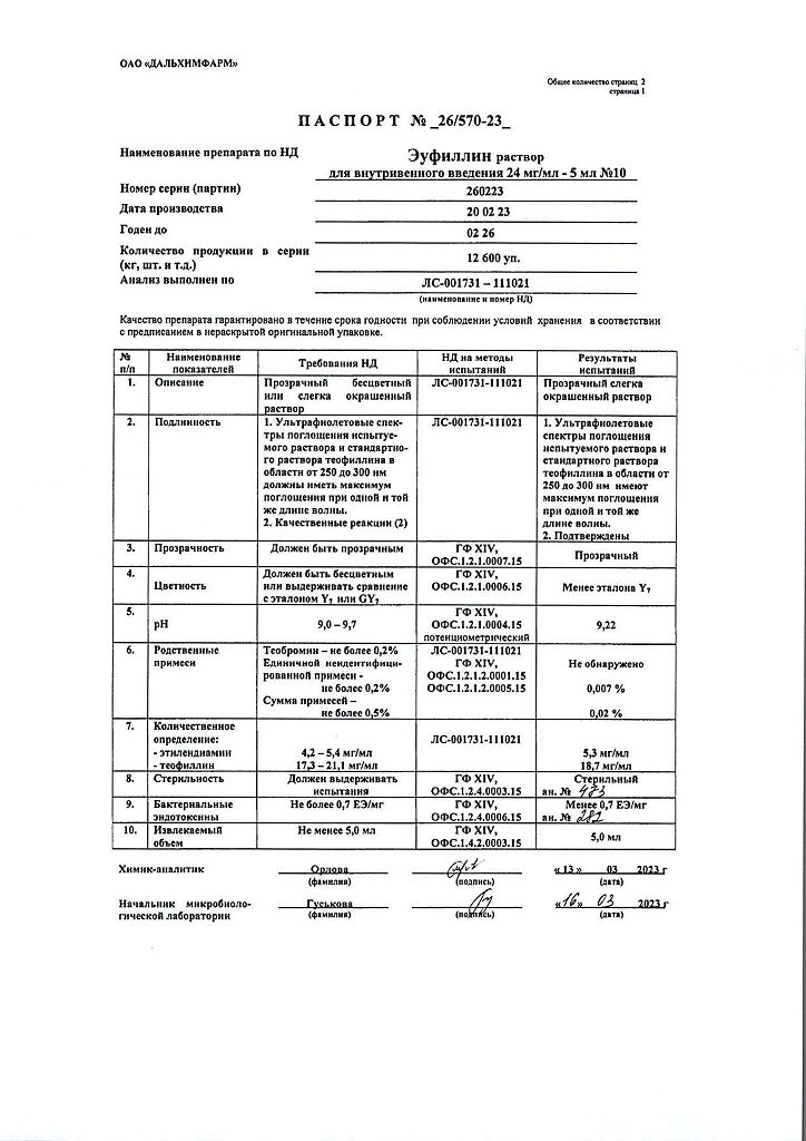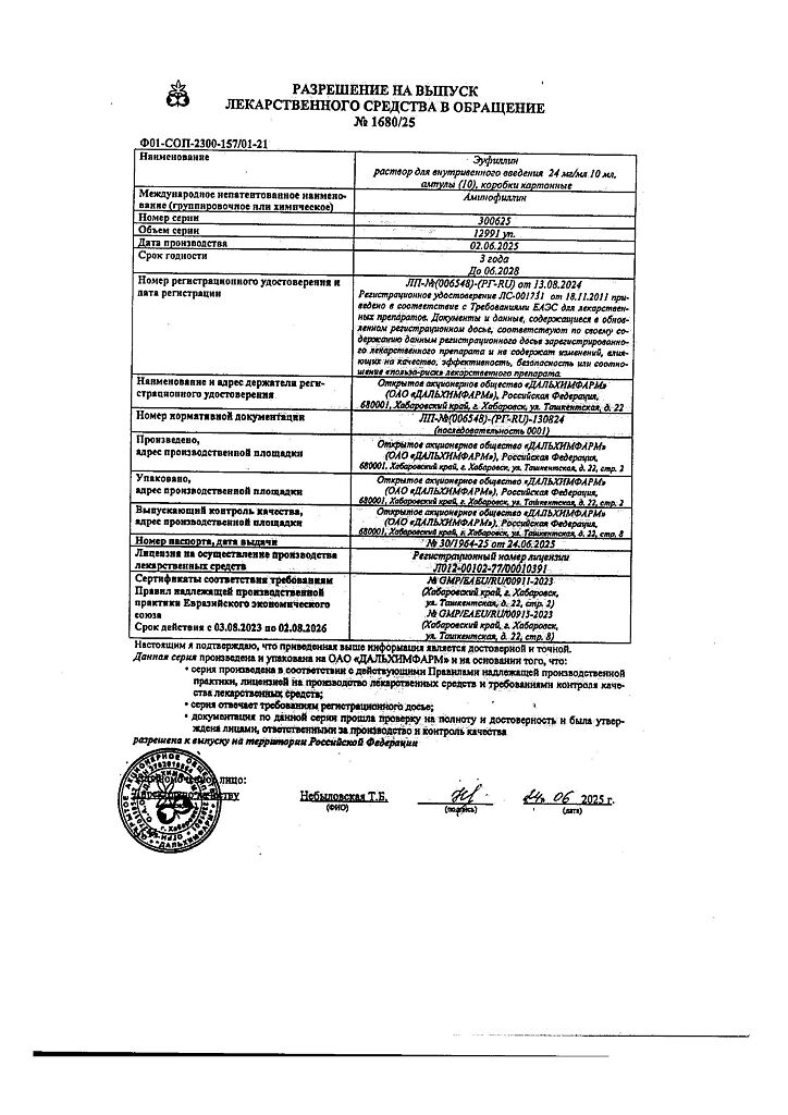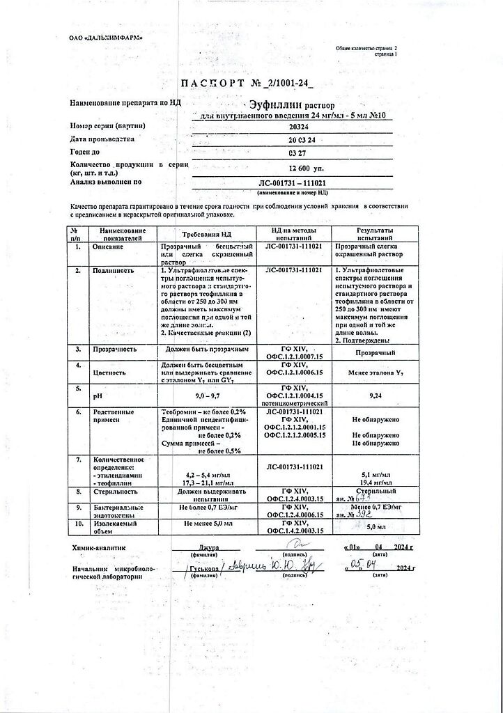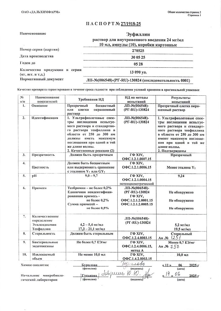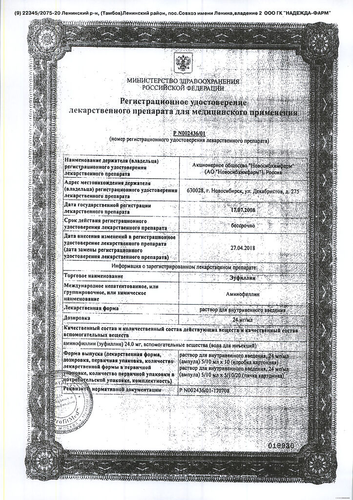 Эуфиллин - бронхолитическое средство, ингибитор ФДЭ. Представляет собой этилендиаминовую соль теофиллина (что облегчает растворимость и увеличивает абсорбцию). Оказывает бронхорасширяющее действие, обусловленное, по-видимому, прямым расслабляющим влиянием на гладкую мускулатуру дыхательных путей и кровеносных сосудов легких. Полагают, что это действие вызвано избирательным подавлением активности специфических ФДЭ, что приводит к повышению внутриклеточной концентрации цАМФ. Результаты экспериментальных исследований in vitro показывают, что основную роль, по-видимому, играют изоферменты III и IV типов. Подавление активности этих изоферментов может также вызывать некоторые побочные эффекты аминофиллина (теофиллина), в т.ч. рвоту, артериальную гипотензию и тахикардию. Блокирует аденозиновые (пуриновые) рецепторы, что может быть одним из факторов действия на бронхи.