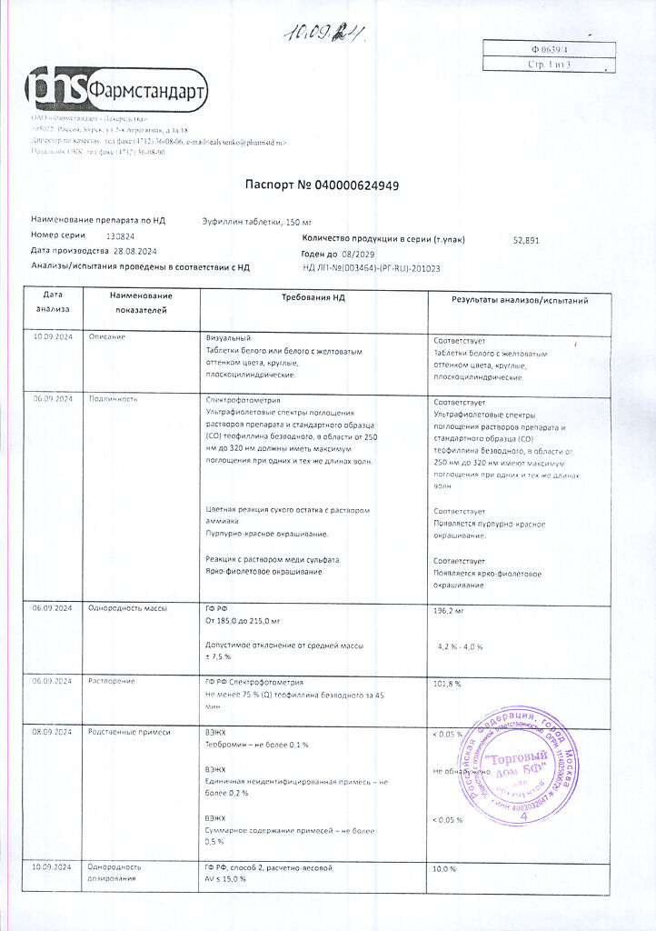 Связывание теофиллина с белками плазмы составляет приблизительно 40%; у новорожденных, а также у взрослых с заболеваниями связывание уменьшается. Связывание с белками плазмы у взрослых составляет около 60%, у новорожденных - 36%, у больных циррозом печени - 36%. Проникает через плацентарный барьер (концентрация в сыворотке крови плода несколько выше, чем в сыворотке матери). Выделяется с грудным молоком.