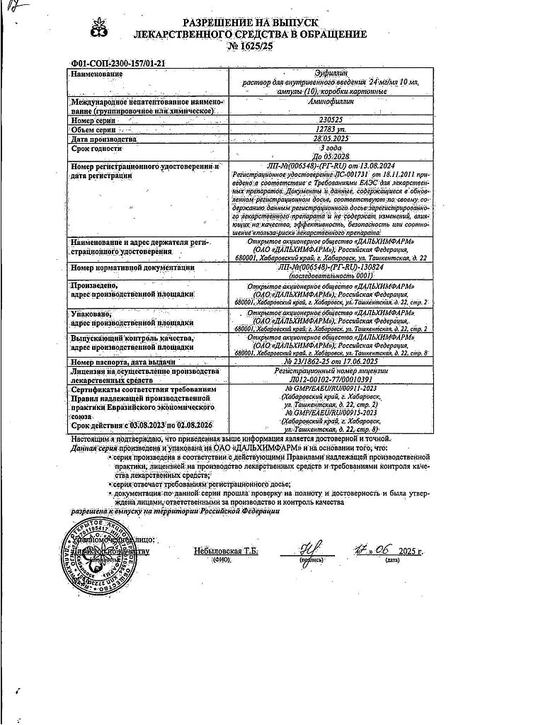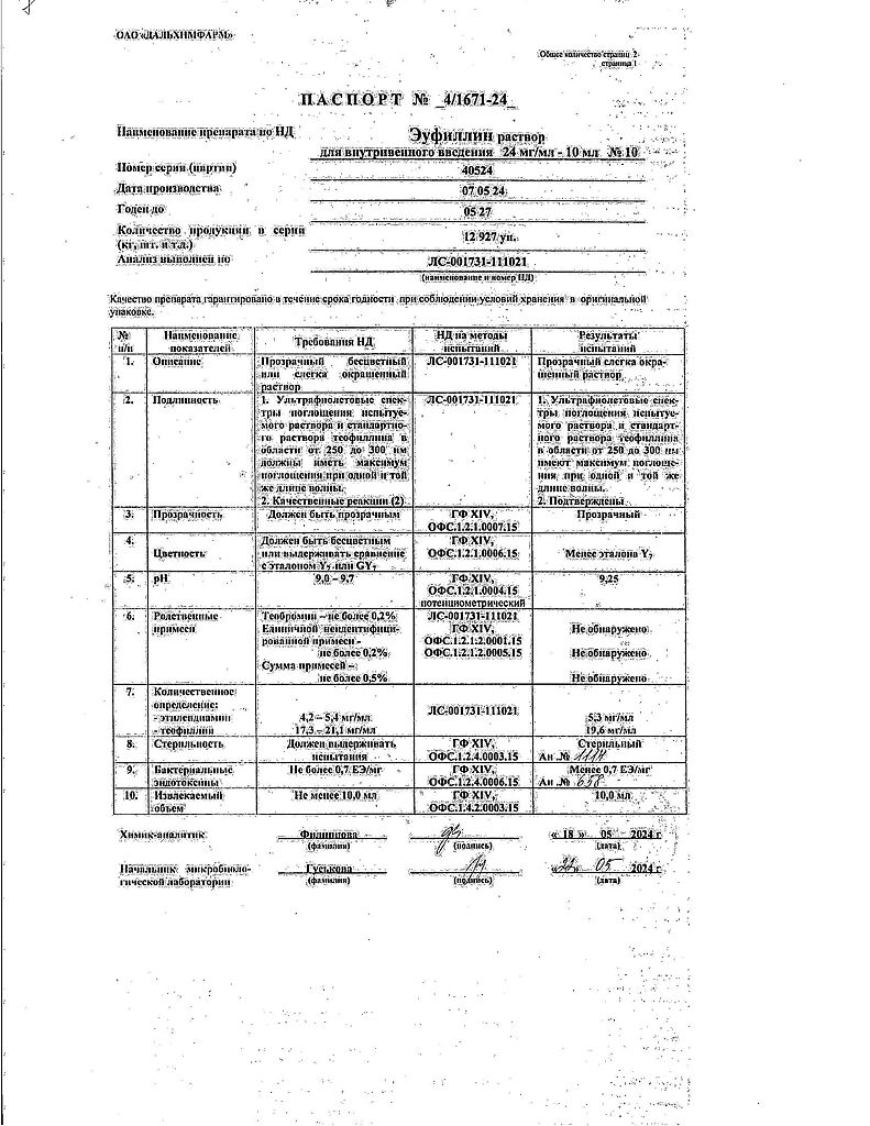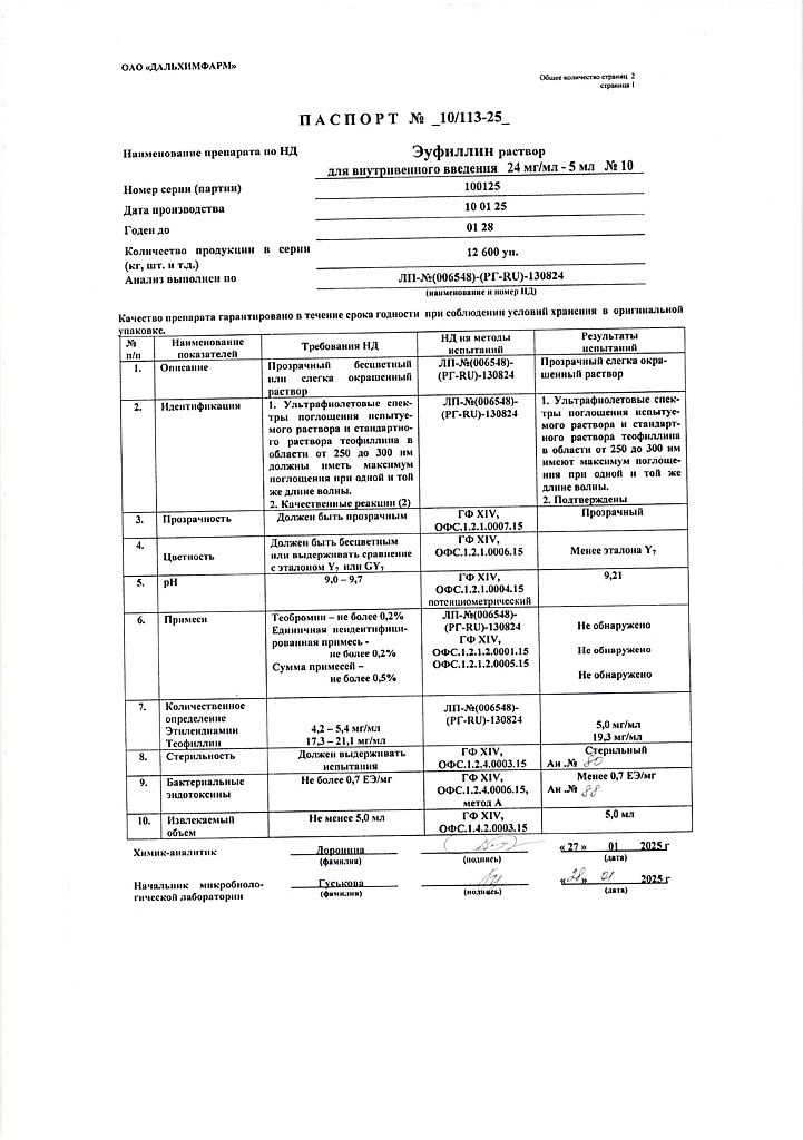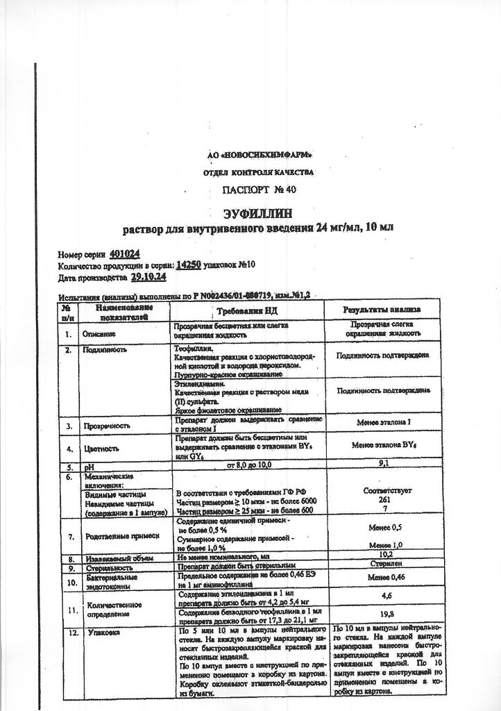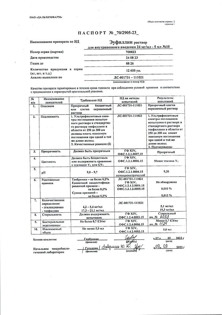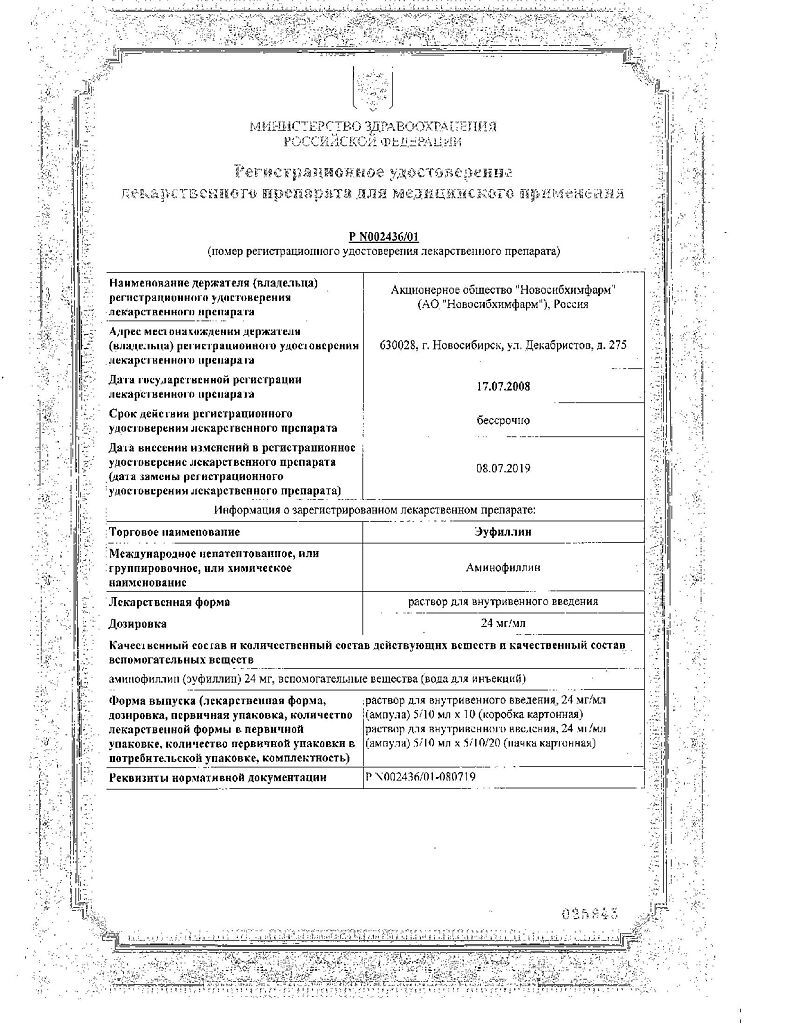 Лечение передозировки зависит от клинической картины, включает отмену препарата, стимуляцию выведения его из организма (форсированный диурез, гемосорбция, плазмосорбция, гемодиализ, перитонеальный диализ) и назначение симптоматических средств. Для купирования судорог применяется диазепам (в инъекциях). Нельзя применять барбитураты. При выраженной интоксикации (содержание эуфиллина более 50 г/л) рекомендован гемодиализ.