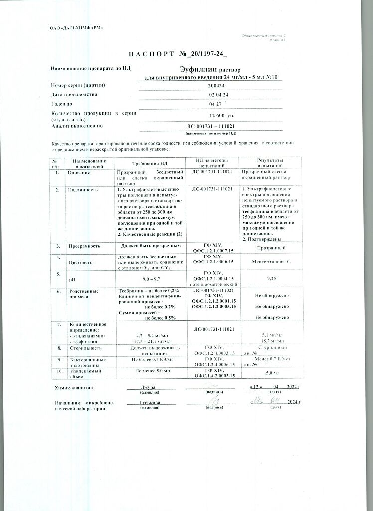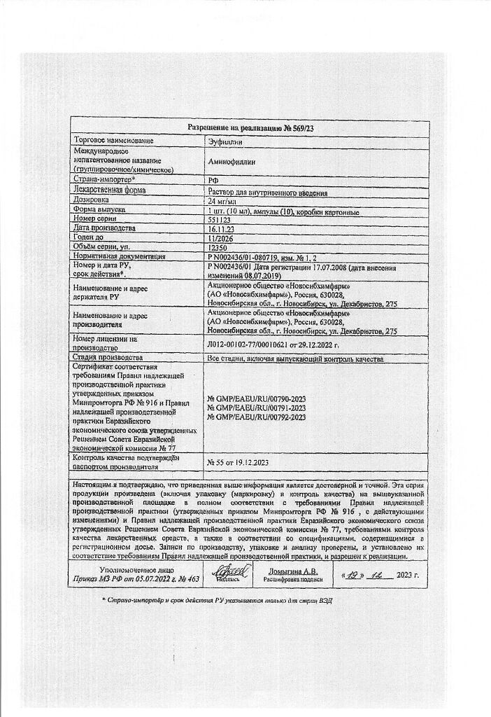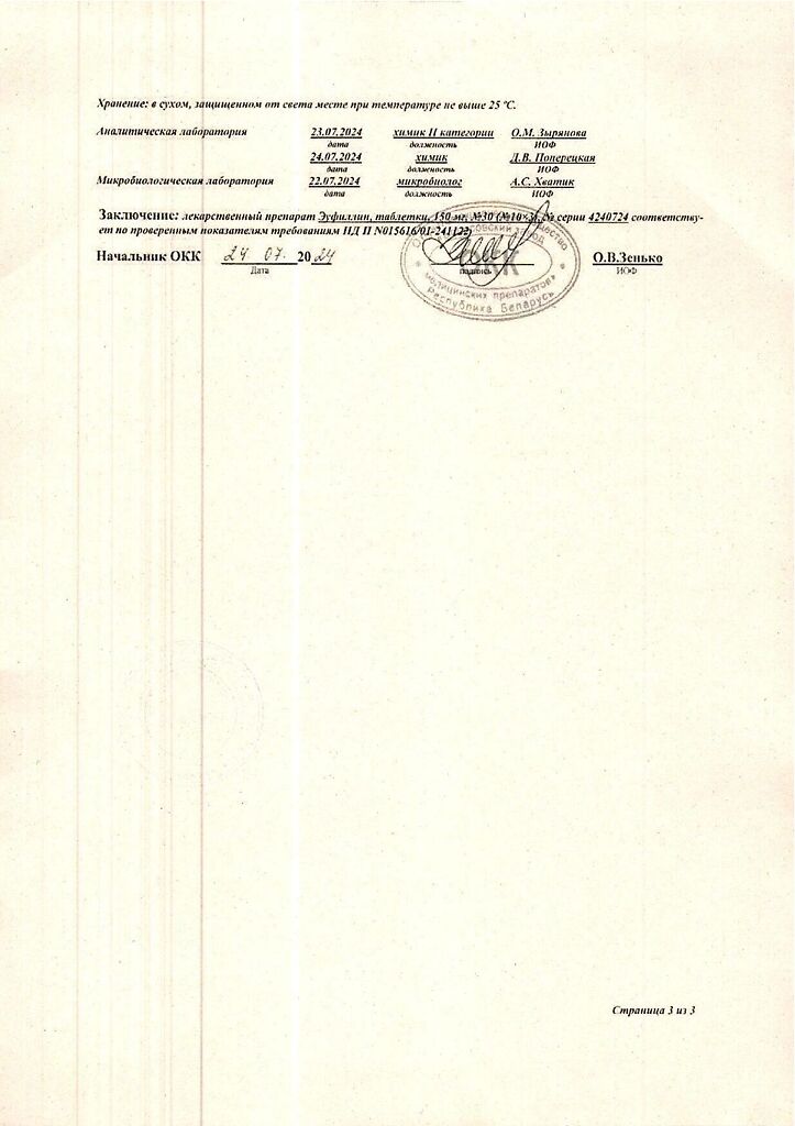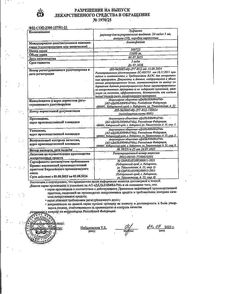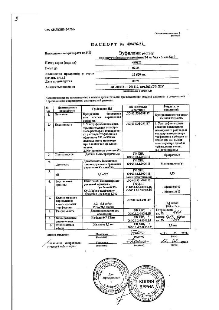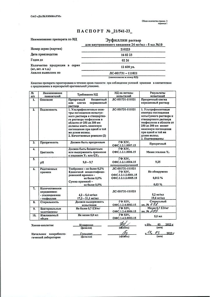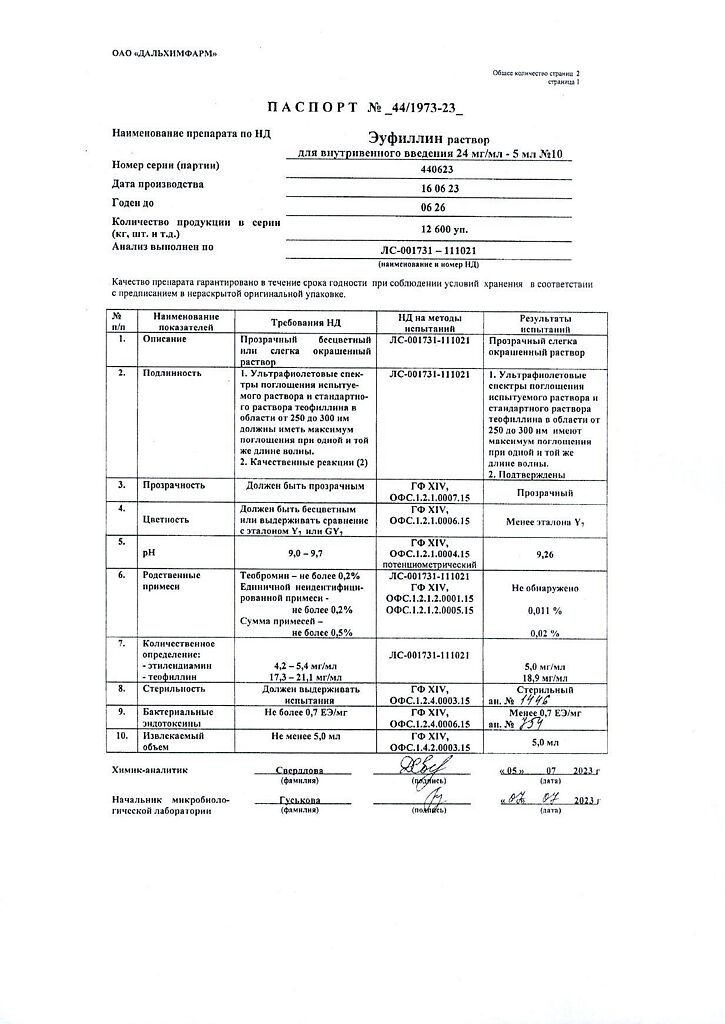 Лечение передозировки зависит от клинической картины, включает отмену препарата, стимуляцию выведения его из организма (форсированный диурез, гемосорбция, плазмосорбция, гемодиализ, перитонеальный диализ) и назначение симптоматических средств. Для купирования судорог применяется диазепам (в инъекциях). Нельзя применять барбитураты. При выраженной интоксикации (содержание эуфиллина более 50 г/л) рекомендован гемодиализ.