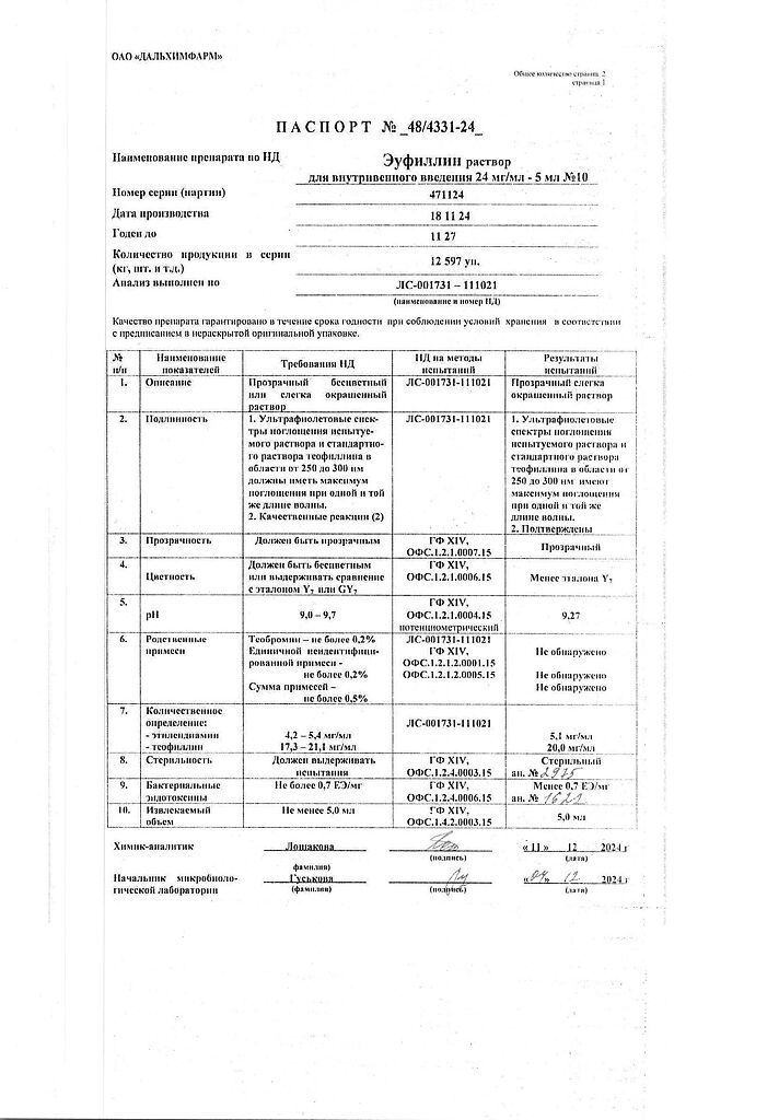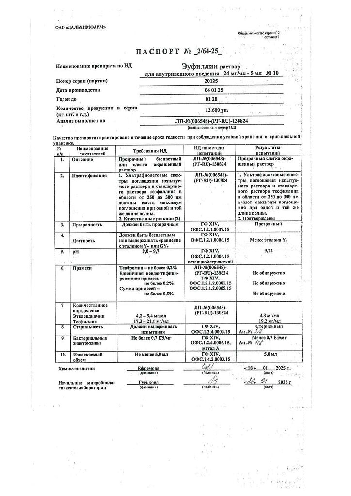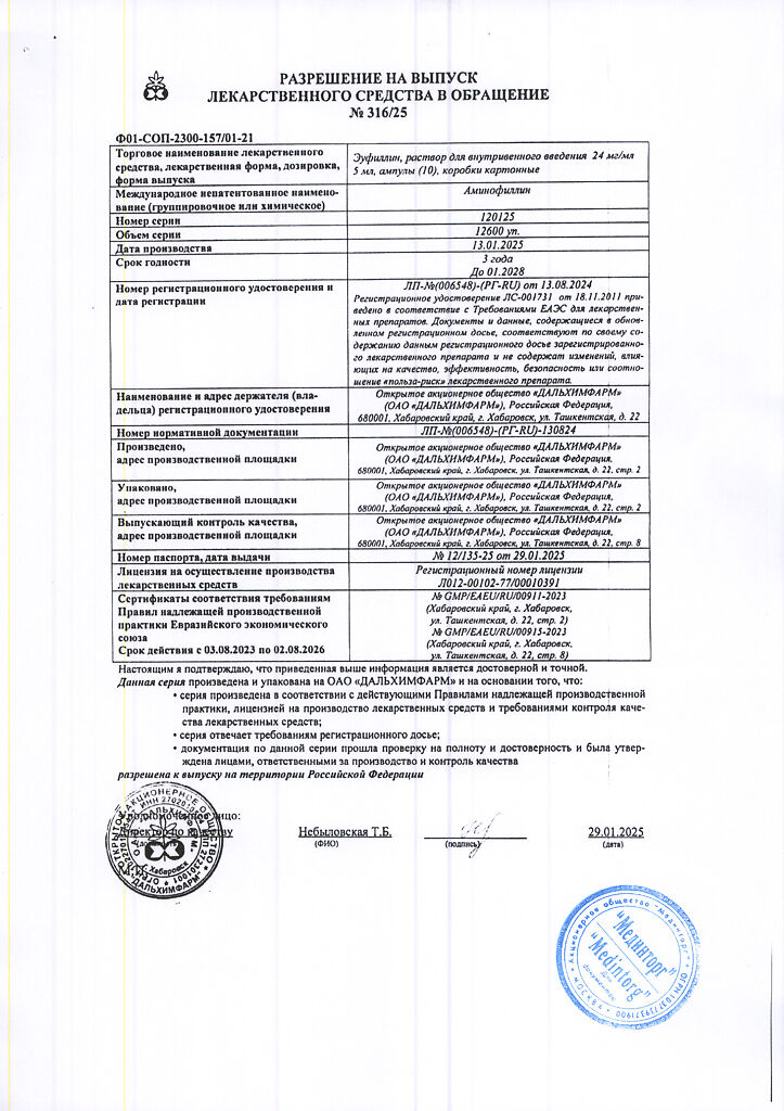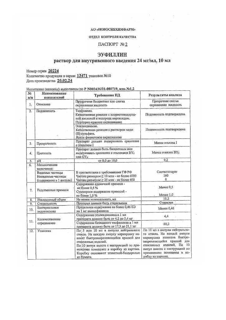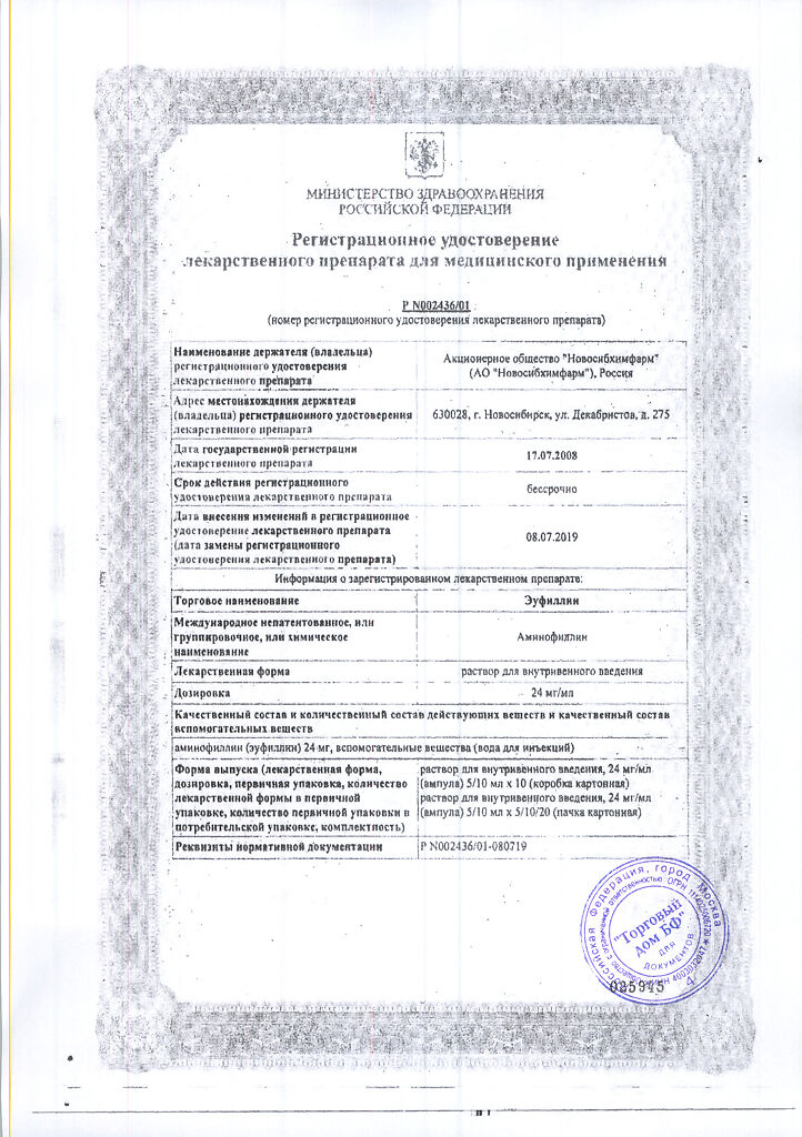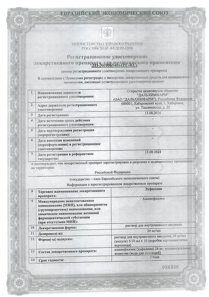 В организме аминофиллин метаболизируется при физиологических значениях pH с высвобождением свободного теофиллина. Бронходилатирующие свойства проявляются при концентрациях теофиллина в плазме крови 10-20 мкг/мл. Концентрация свыше 20 мг/мл является токсической. Возбуждающий эффект на дыхательный центр реализуется при более низкой концентрации - 5-10 мкг/мл.