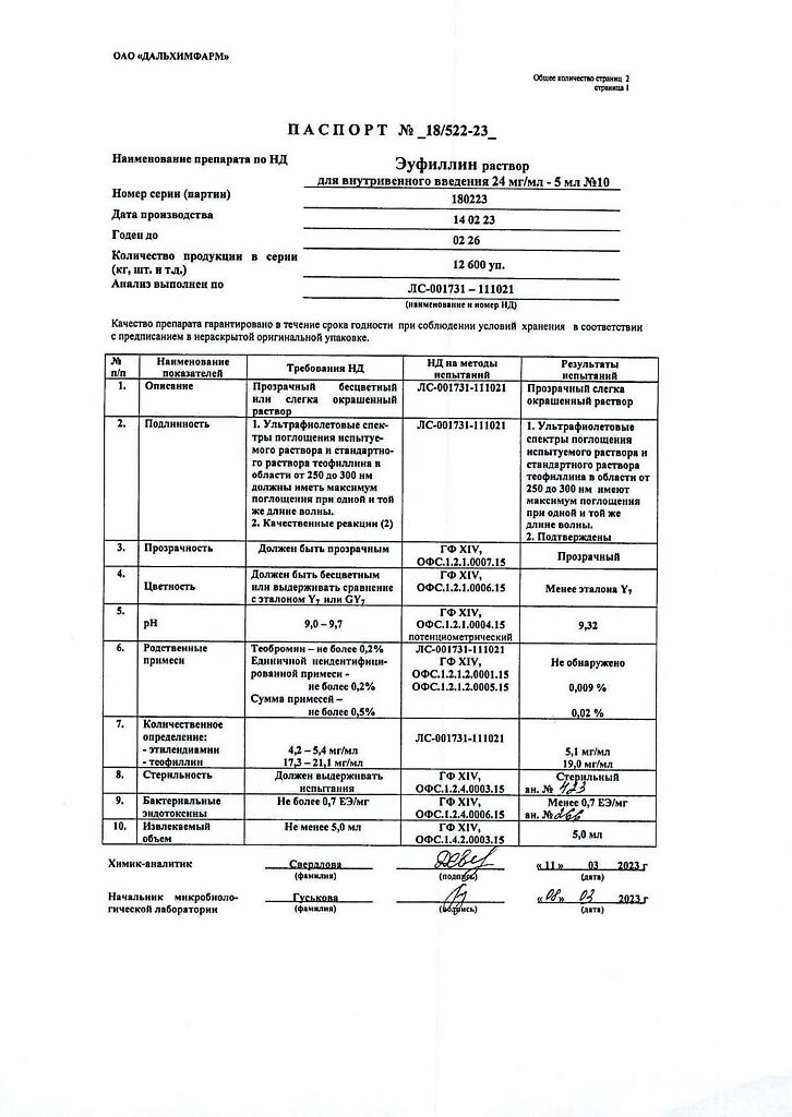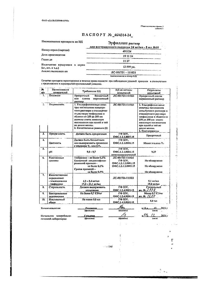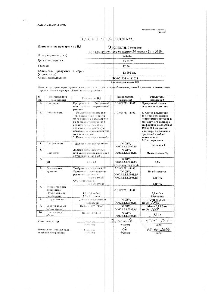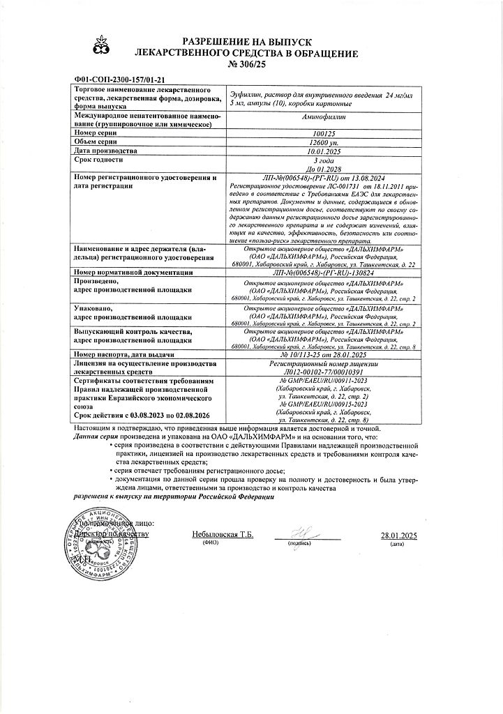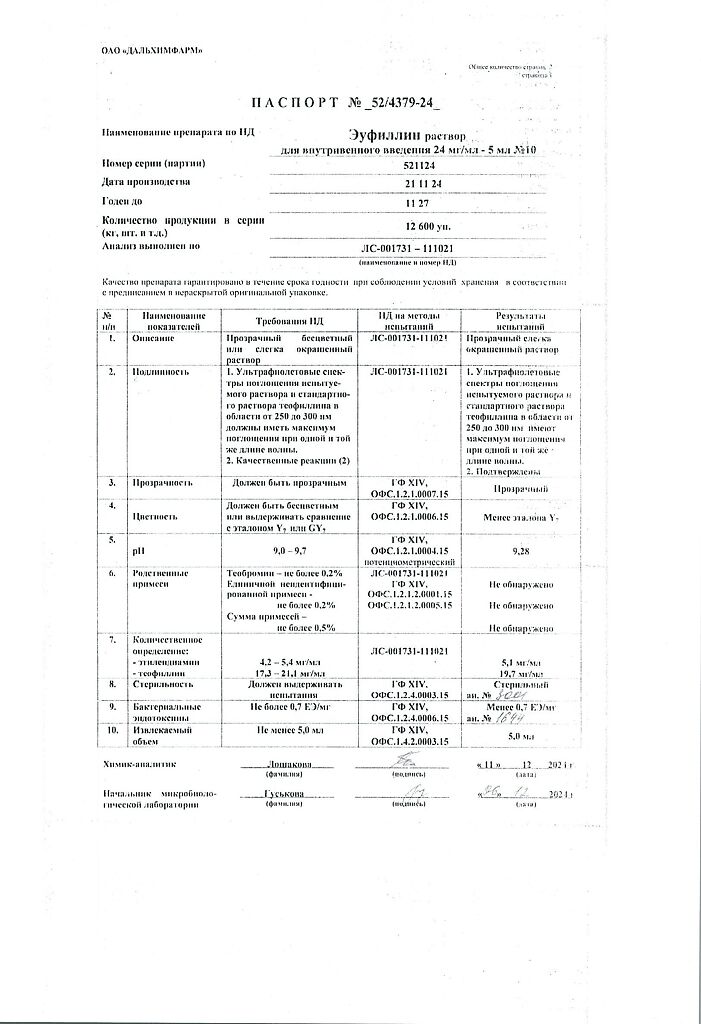В организме аминофиллин метаболизируется при физиологических значениях pH с высвобождением свободного теофиллина. Бронходилатирующие свойства проявляются при концентрациях теофиллина в плазме крови 10-20 мкг/мл. Концентрация свыше 20 мг/мл является токсической. Возбуждающий эффект на дыхательный центр реализуется при более низкой концентрации - 5-10 мкг/мл.
