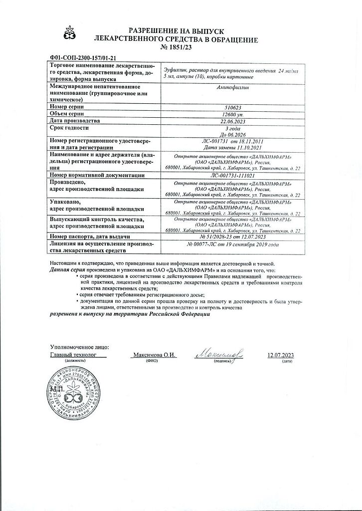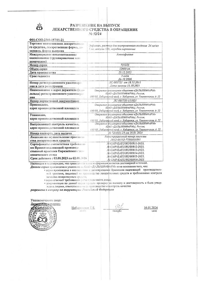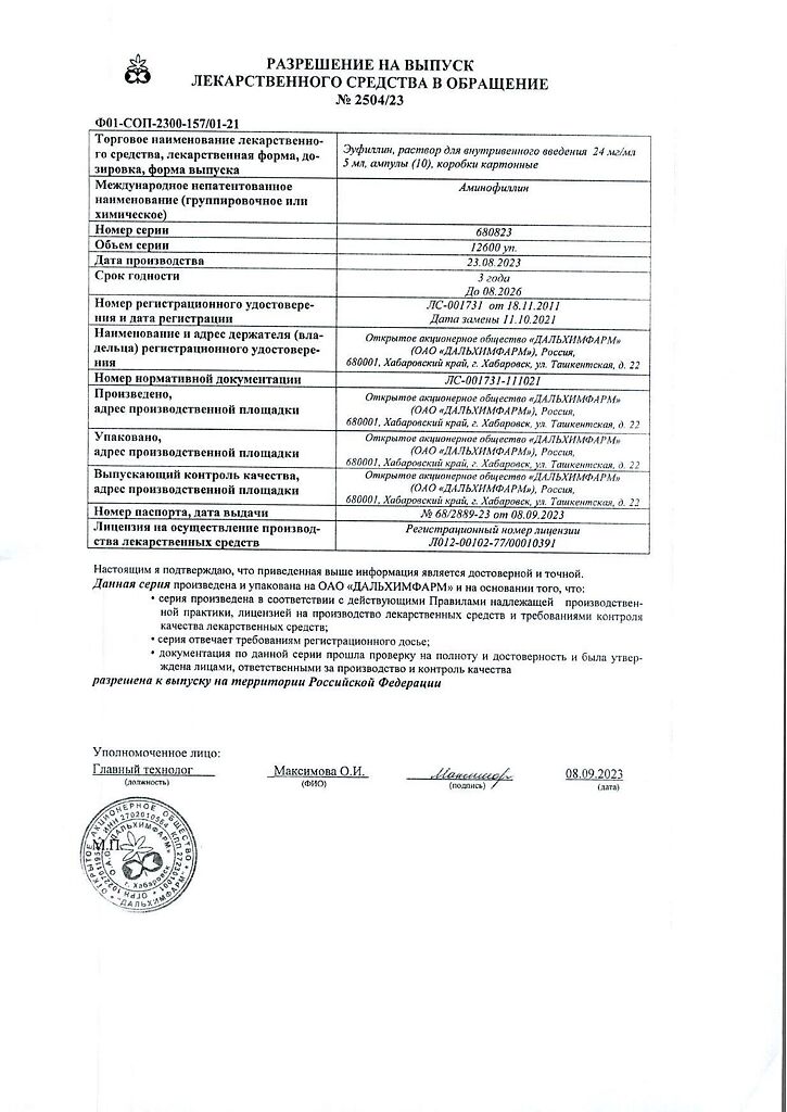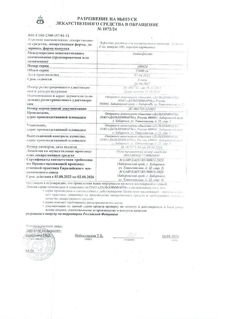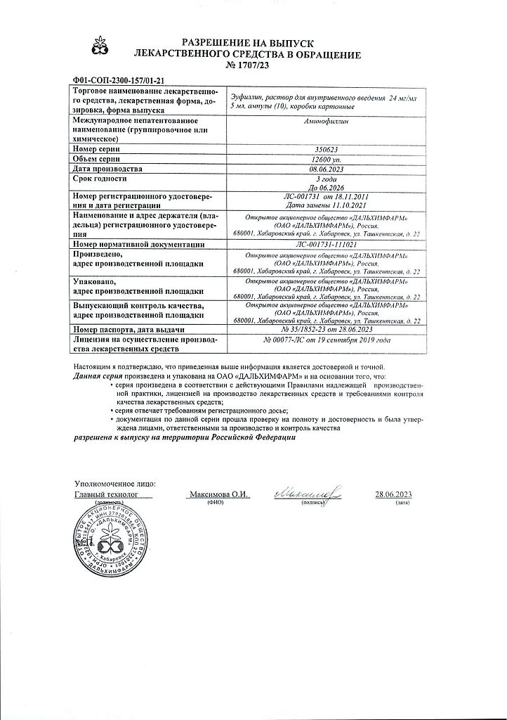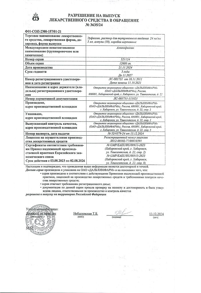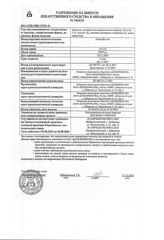 При замене применяемой лекарственной формы аминофиллина на другую необходимо клиническое наблюдение и контроль концентрации теофиллина в плазме крови.