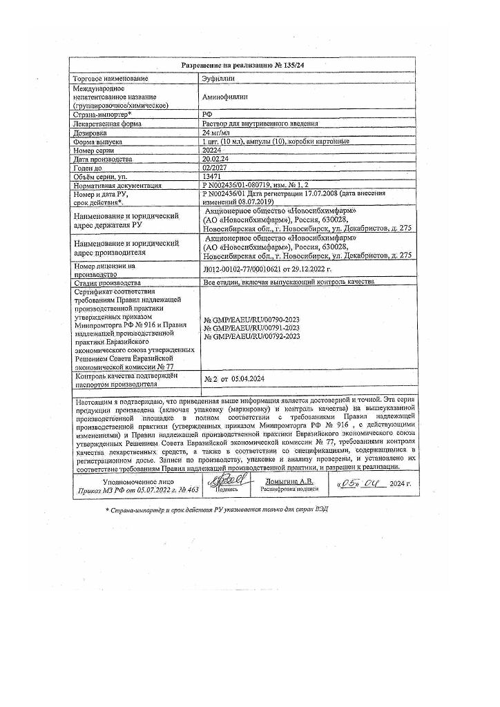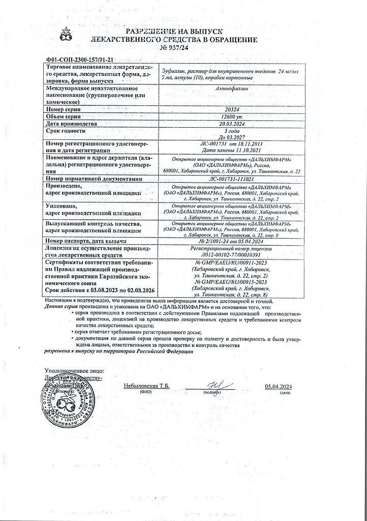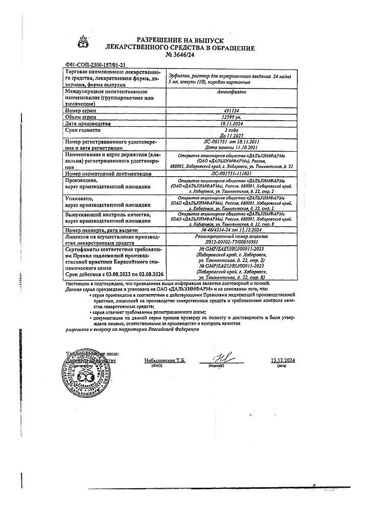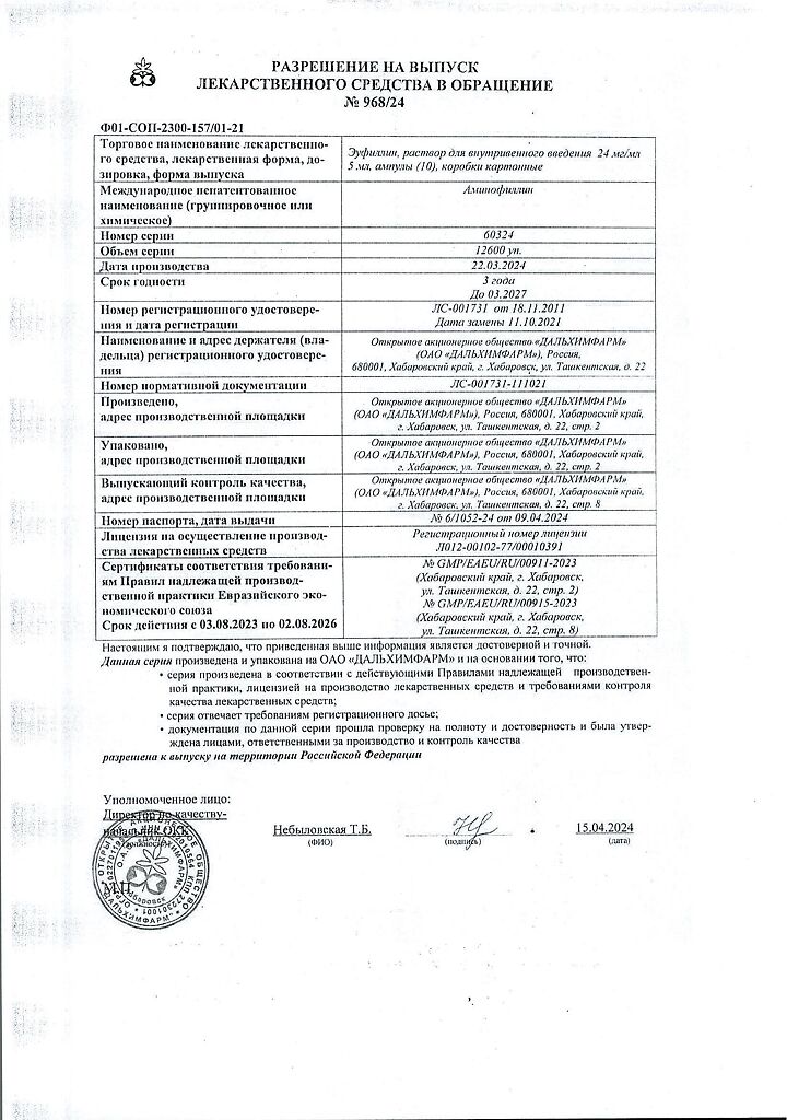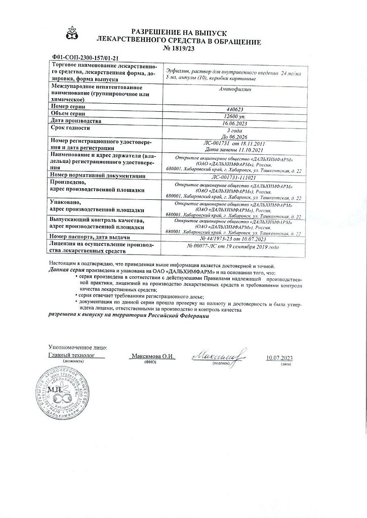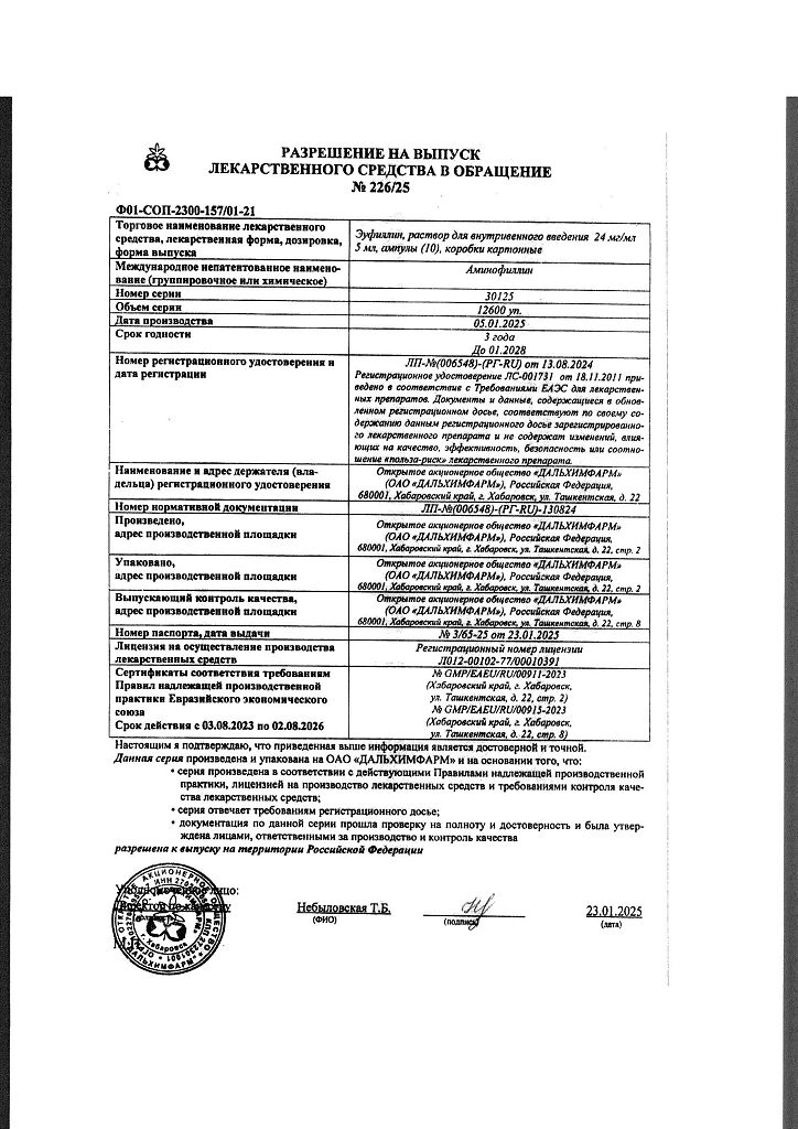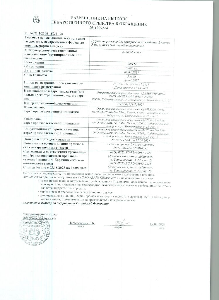 При замене применяемой лекарственной формы аминофиллина на другую необходимо клиническое наблюдение и контроль концентрации теофиллина в плазме крови.