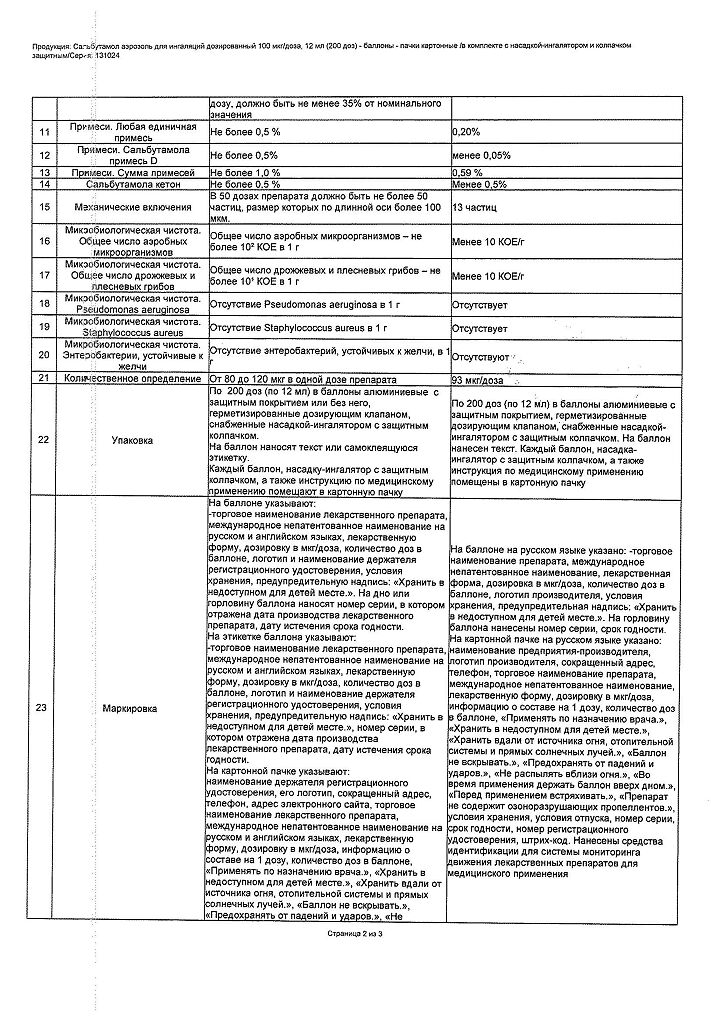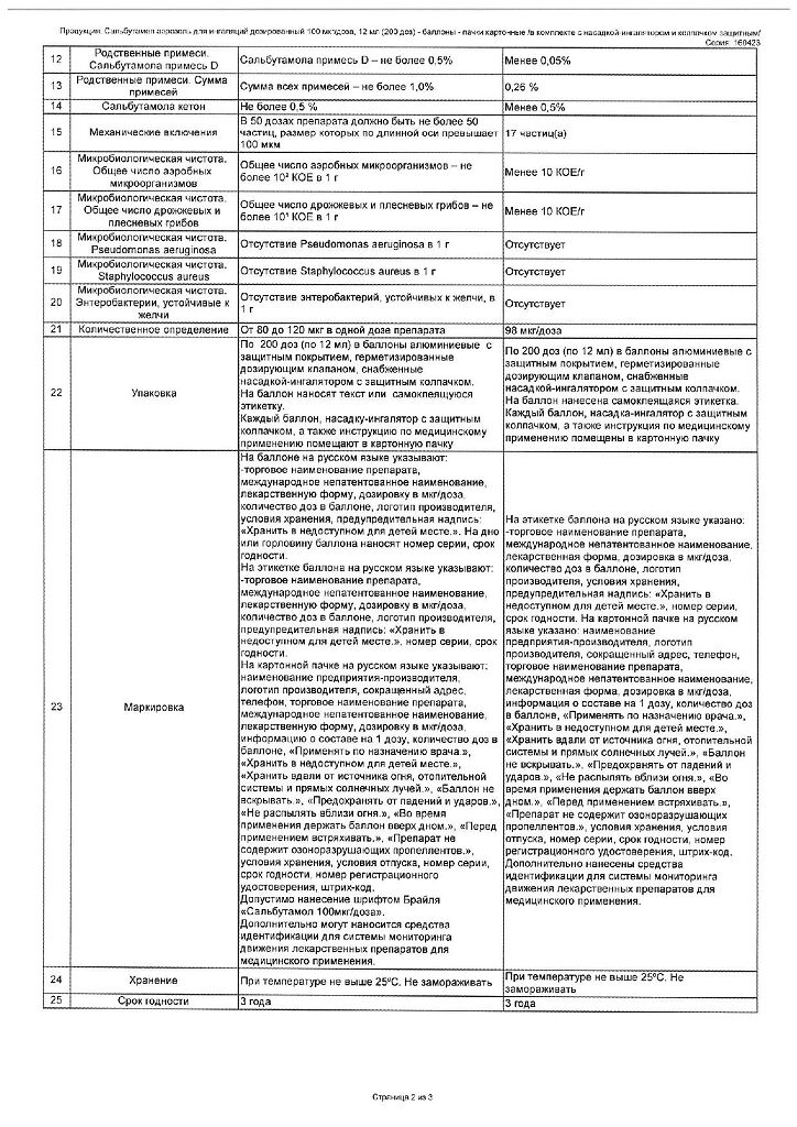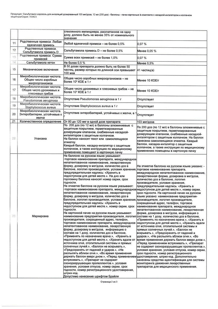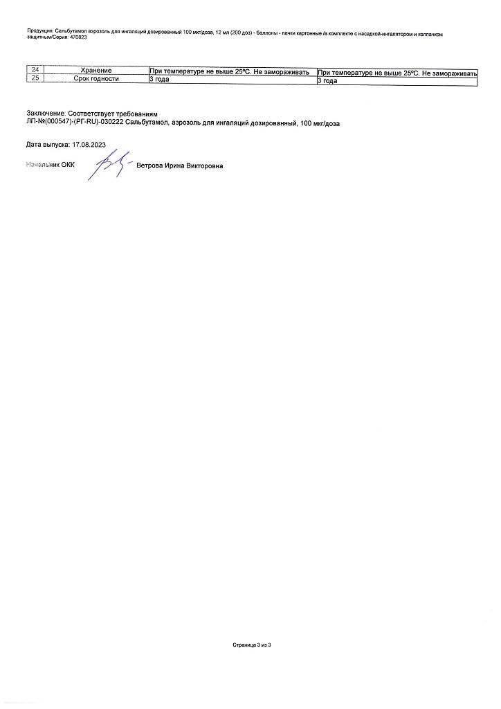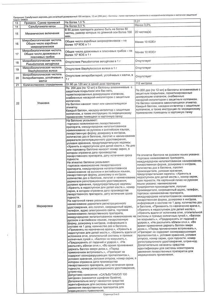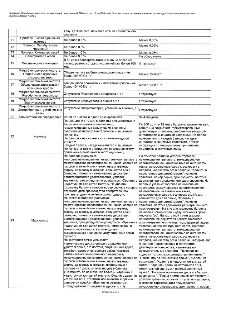 действующие вещества: сальбутамола сульфат 0,1208 мг (эквивалентно 0,1 мг сальбутамола).