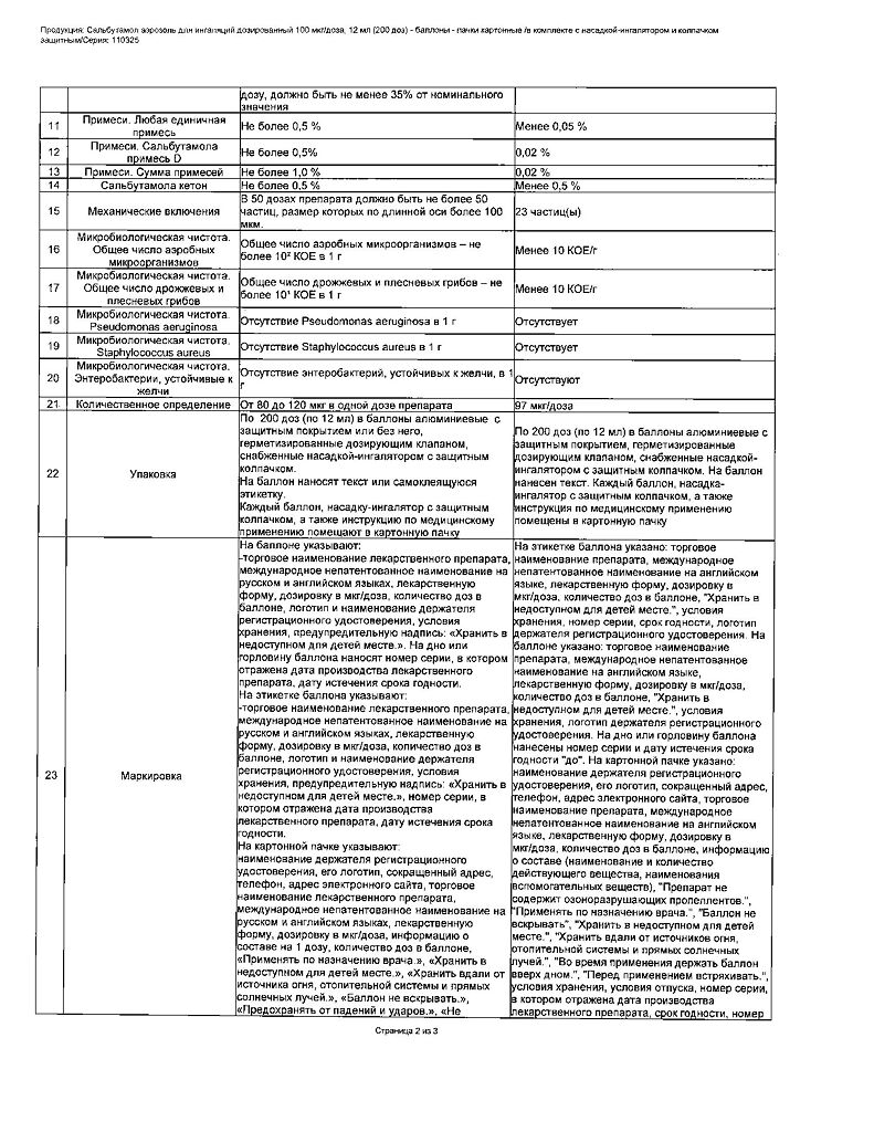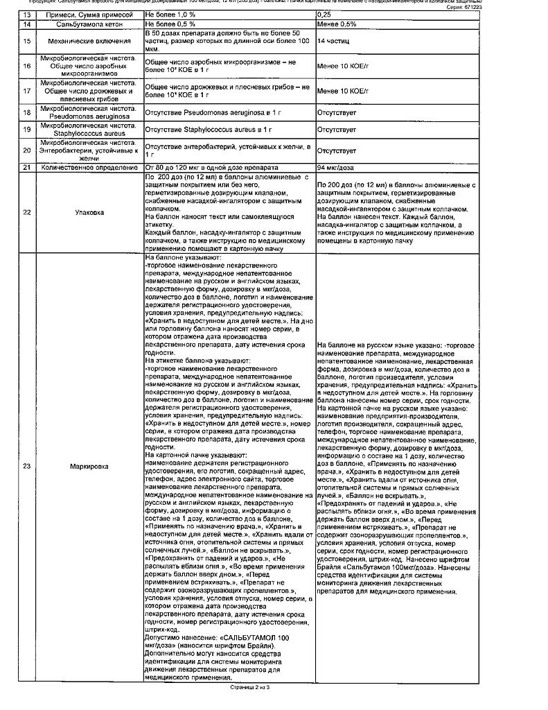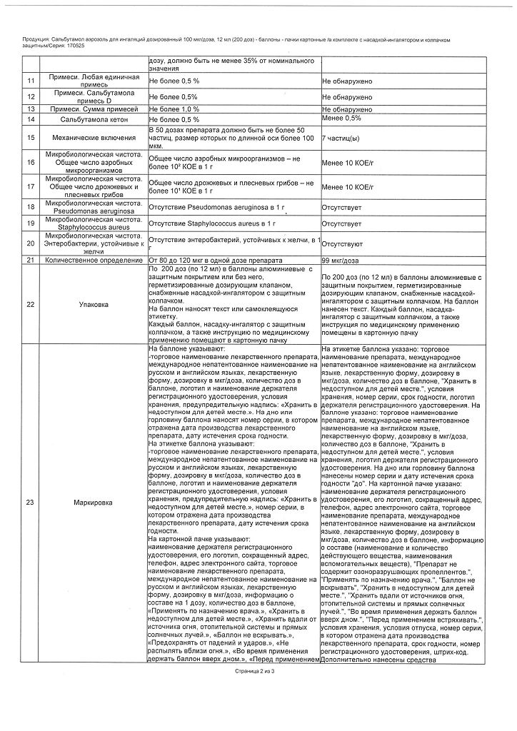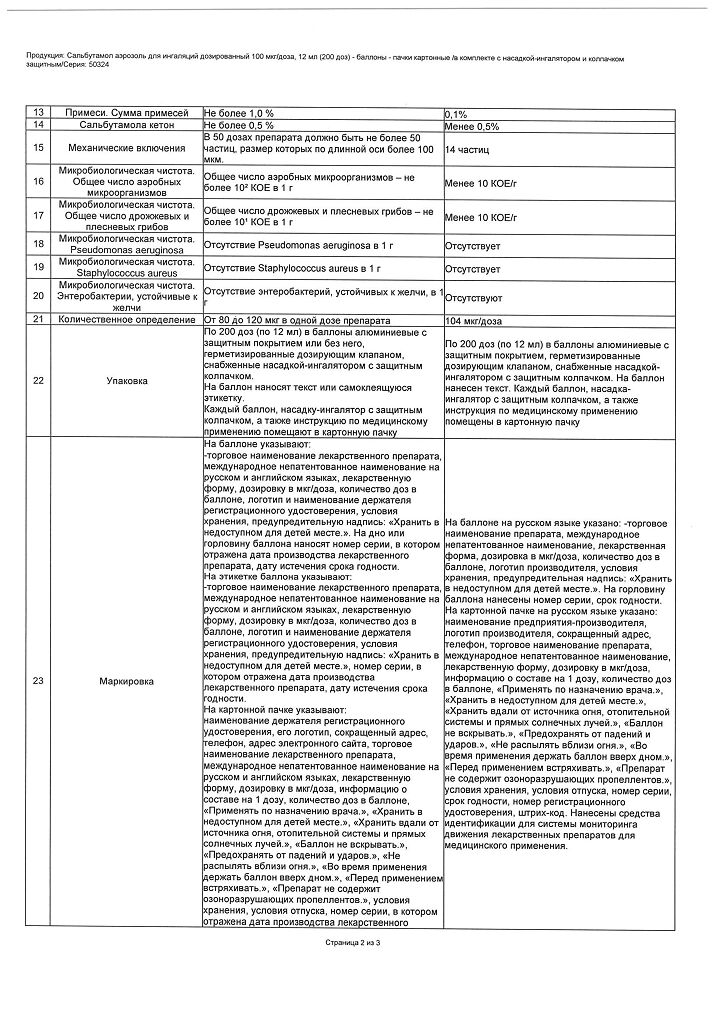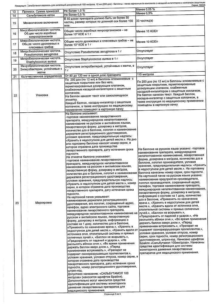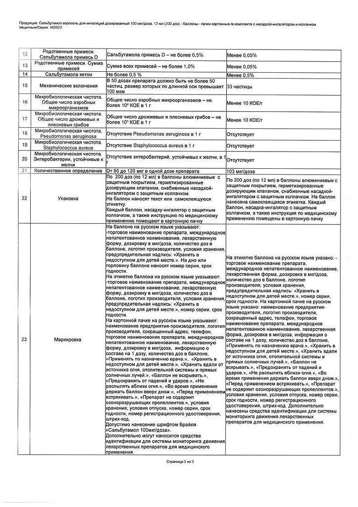 действующие вещества: сальбутамола сульфат 0,1208 мг (эквивалентно 0,1 мг сальбутамола).