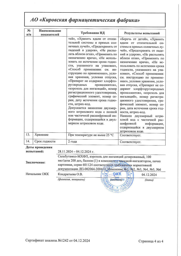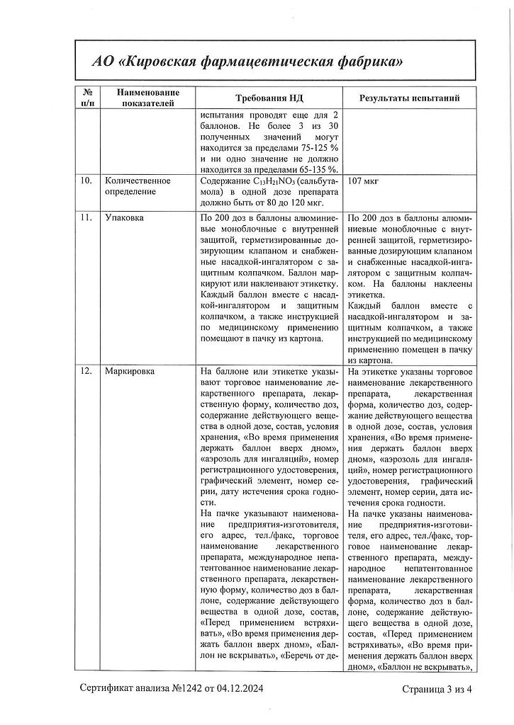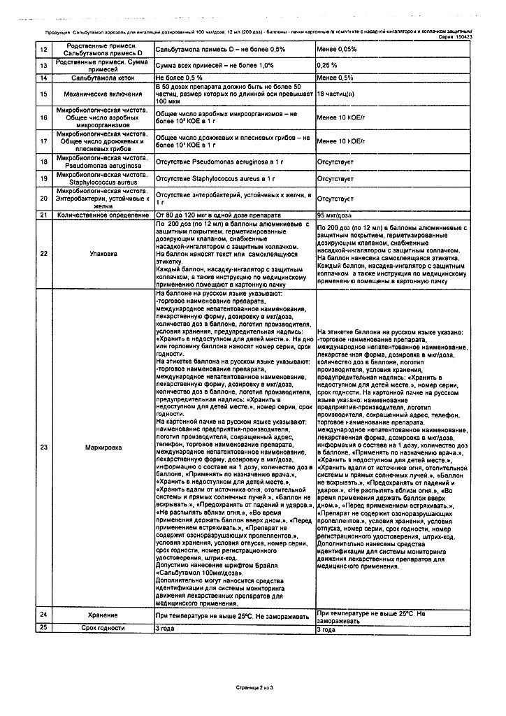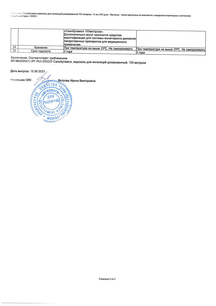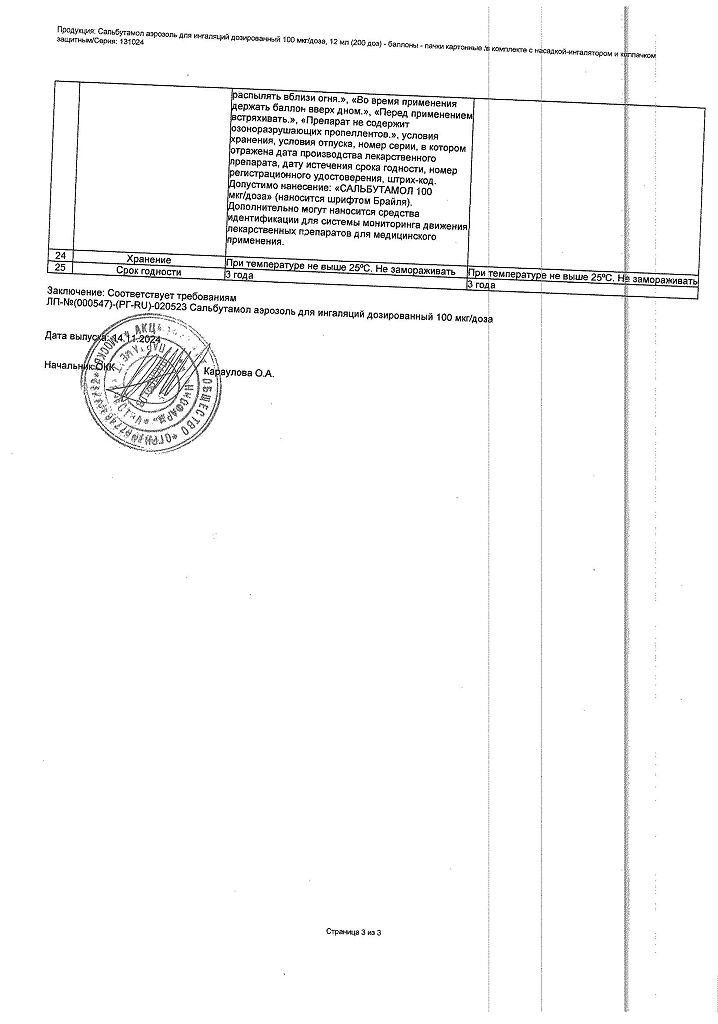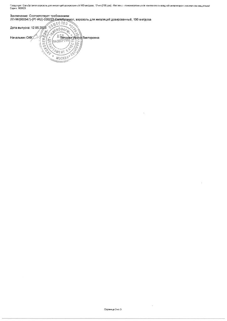 действующие вещества: сальбутамола сульфат 0,1208 мг (эквивалентно 0,1 мг сальбутамола).