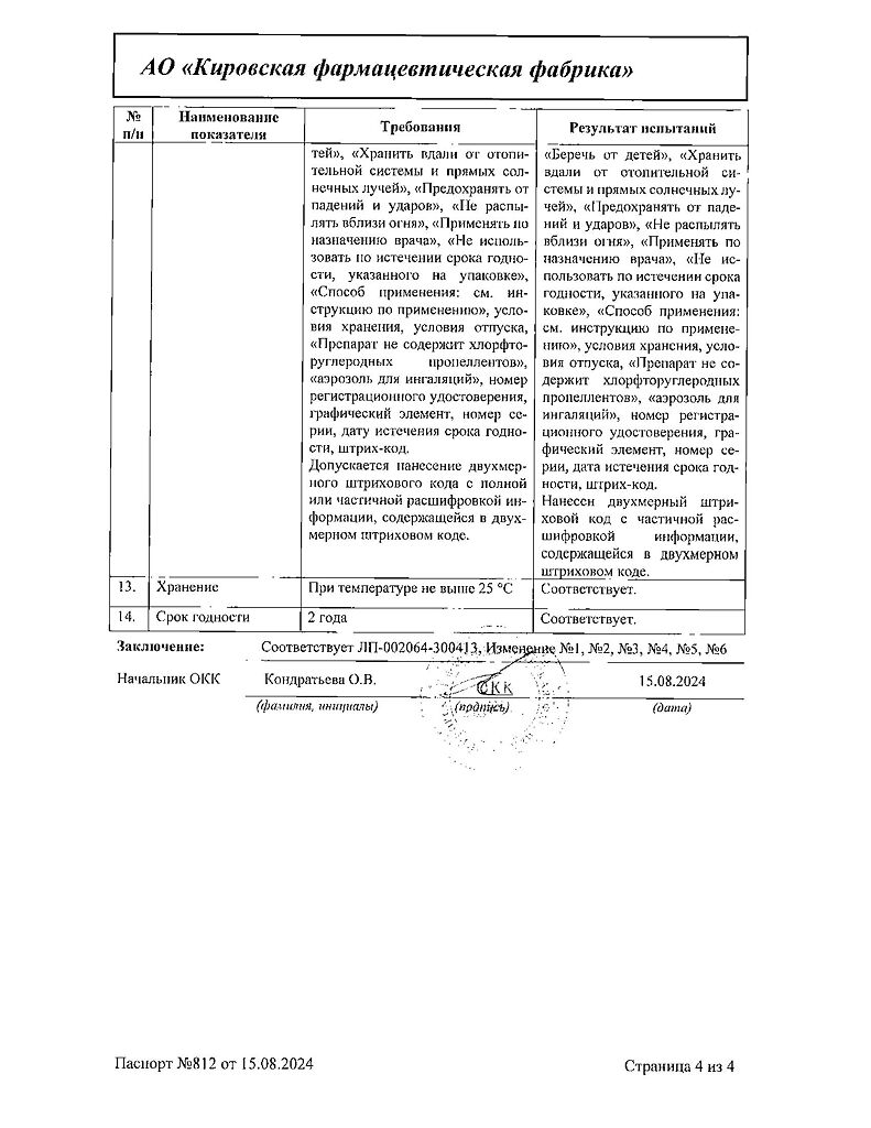 вспомогательные вещества: олеиловый спирт, этанол (спирт этиловый ректификованный), пропеллент  R 134a (1,1,1,2-тетрафторэтан, HFA 134a);
