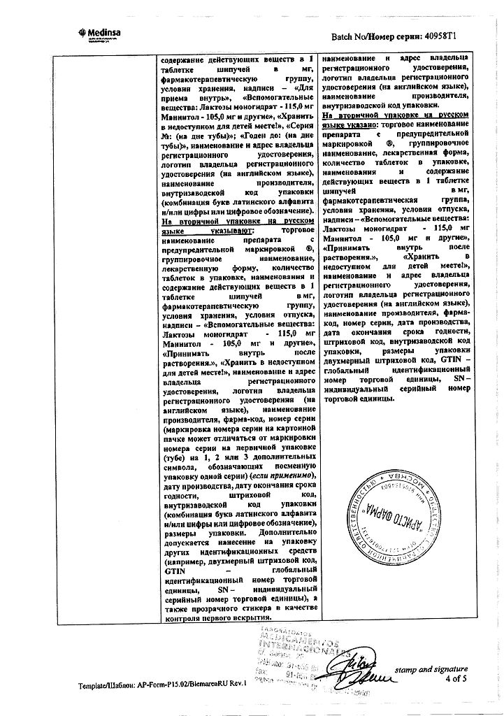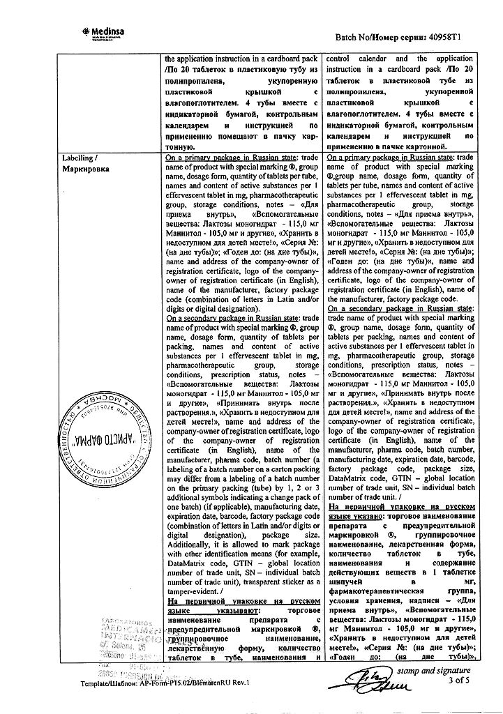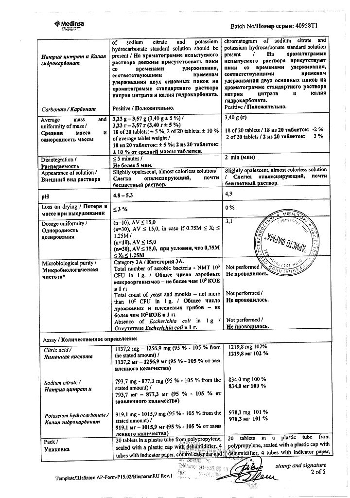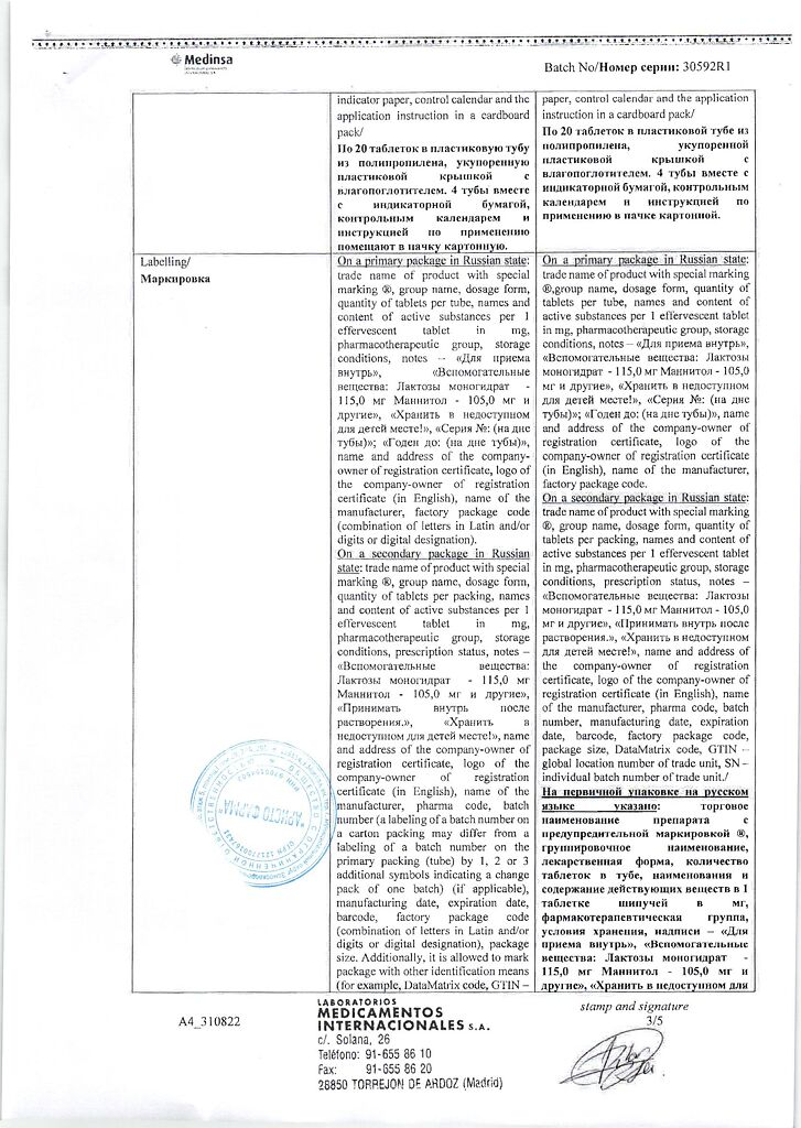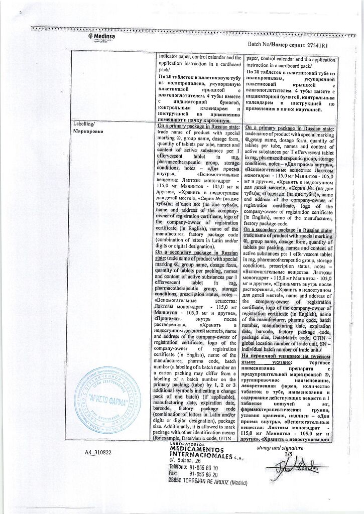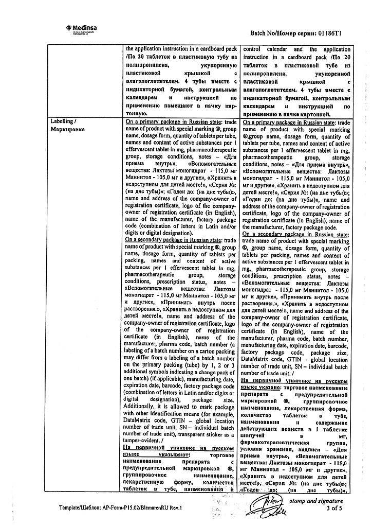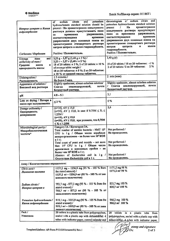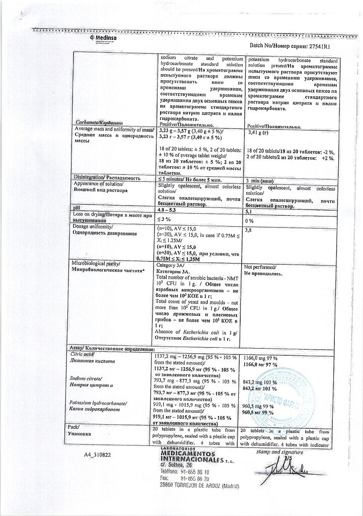 Средняя суточная доза (4 шипучих таблетки) содержит около 1.5 мг калия и 0.9 г натрия, что следует учитывать при назначении препарата пациентам, соблюдающим диету с ограничением потребления поваренной соли.