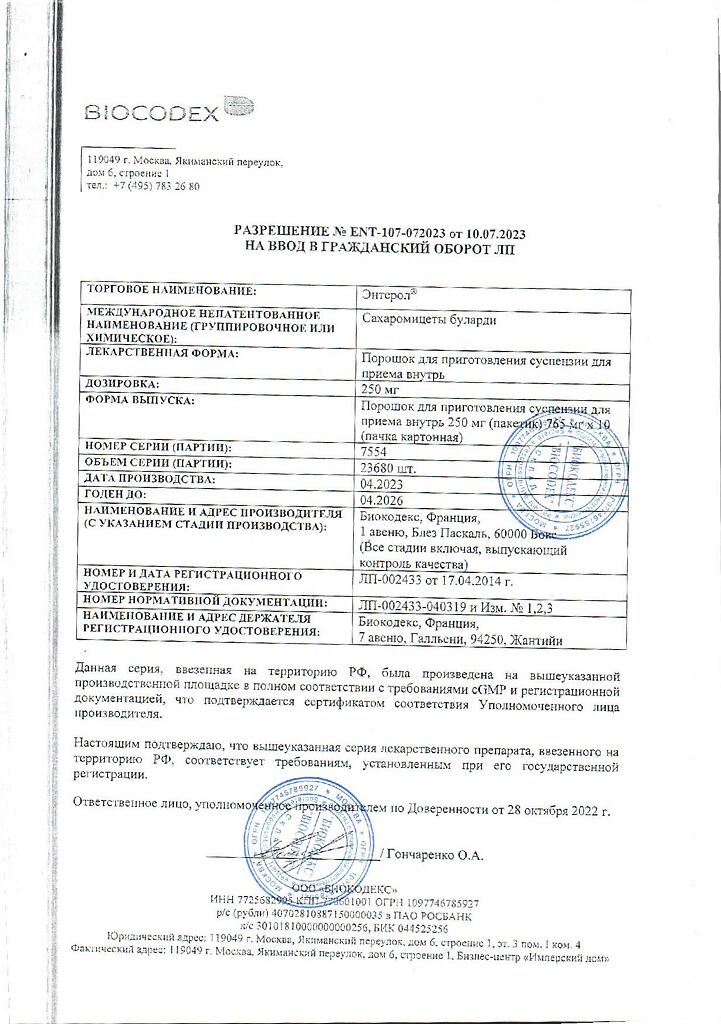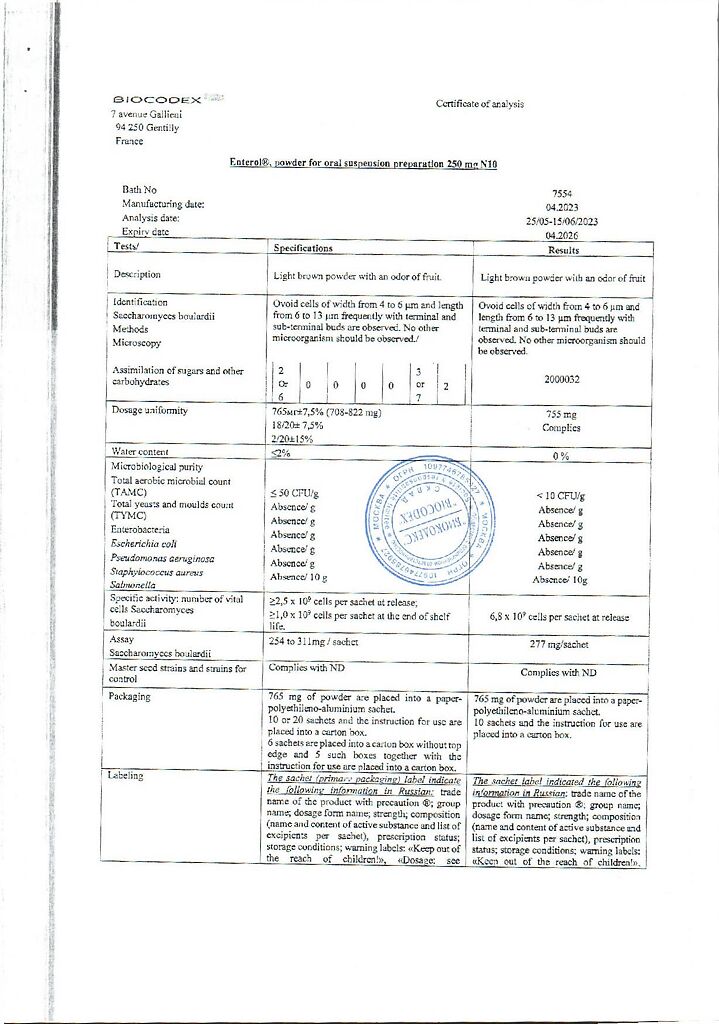 Saccharomyces boulardii CNCM I-745 представляет собой живые непатогенные дрожжи (депонирование - Национальная коллекция культур и микроорганизмов (CNCM), Международный депозитарий, Институт Пастера, Париж).