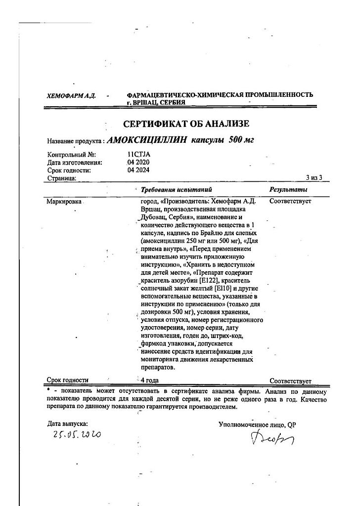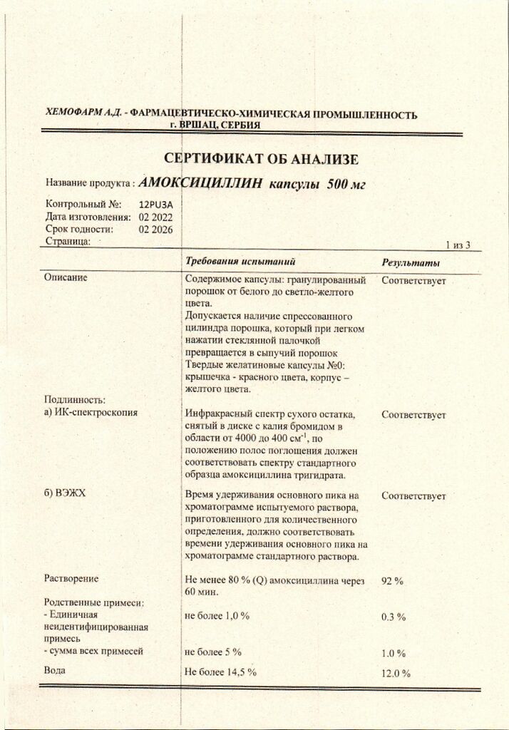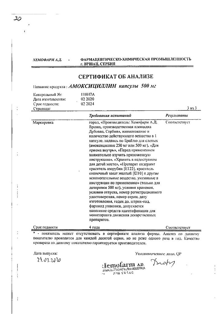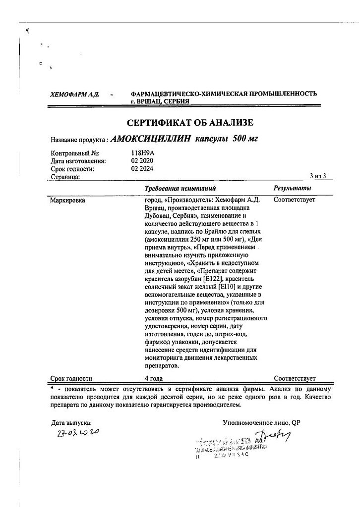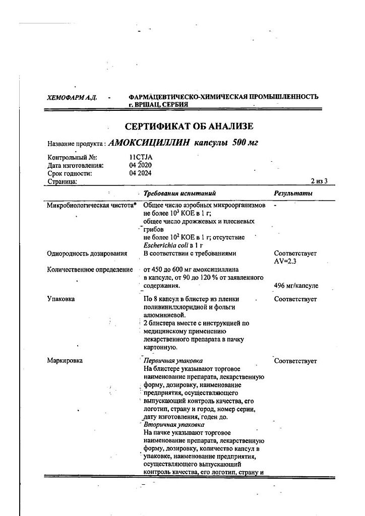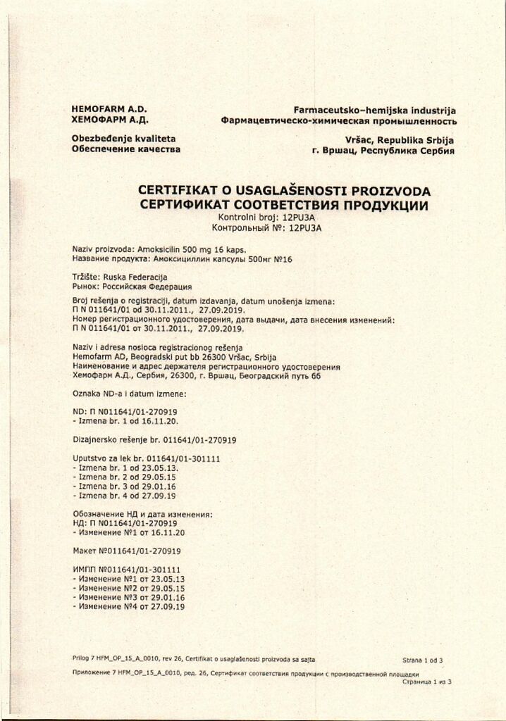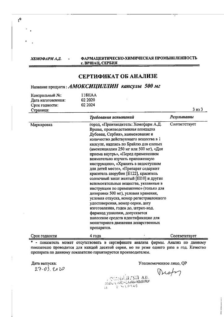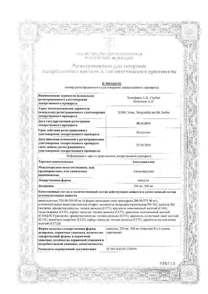 амоксициллин 500.00 мг (в форме амоксициллина тригидрата 573,9 мг);