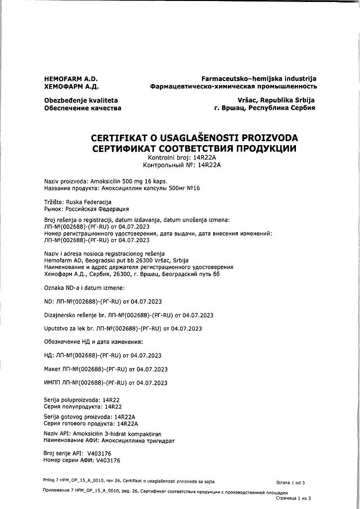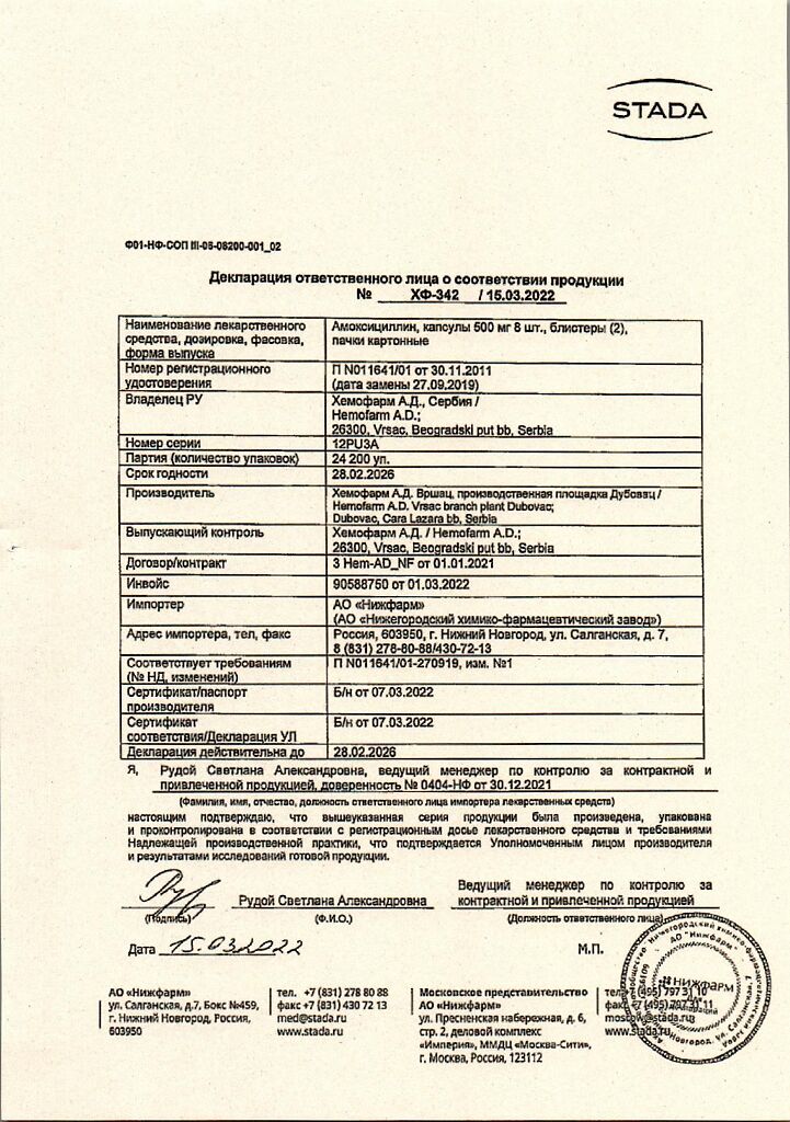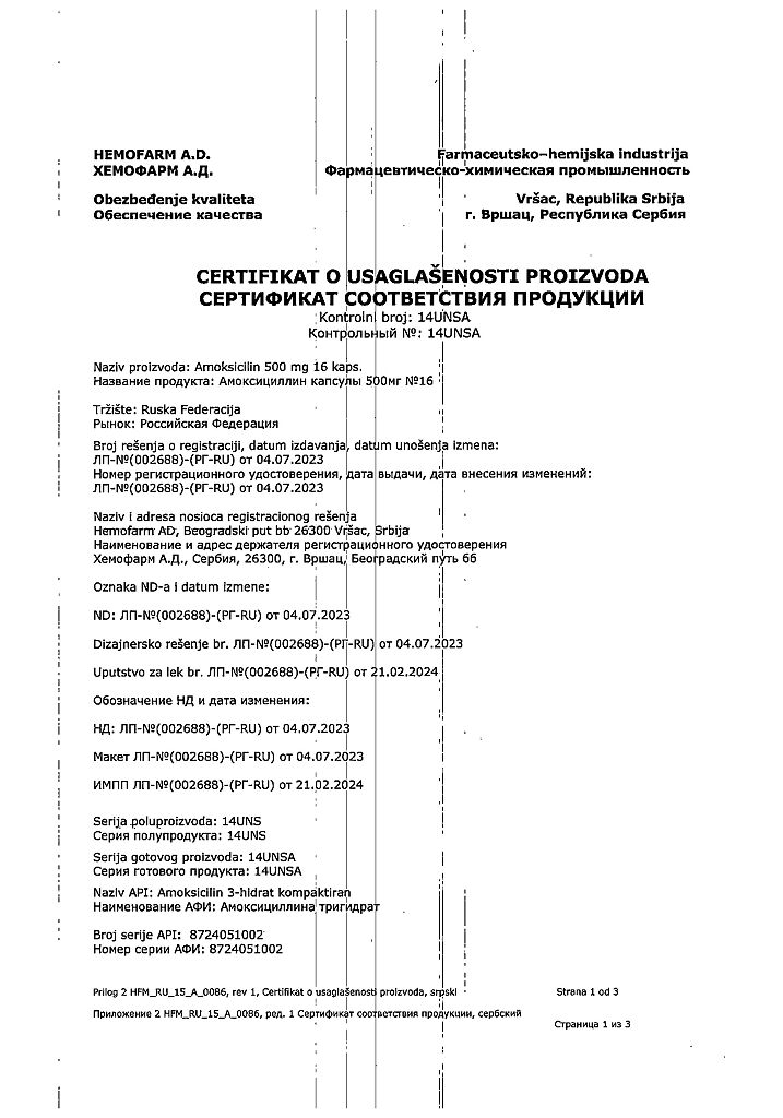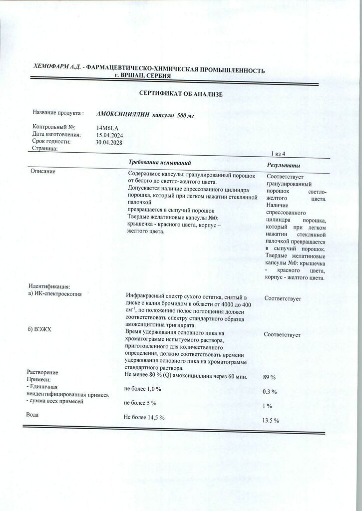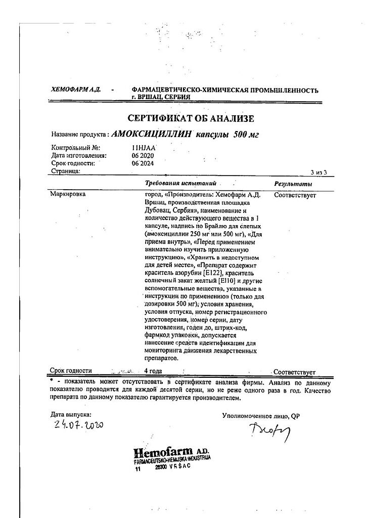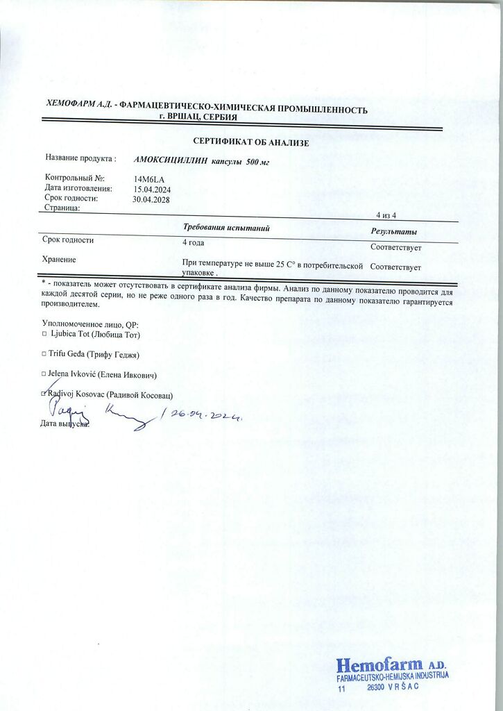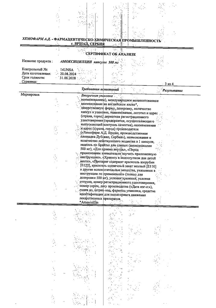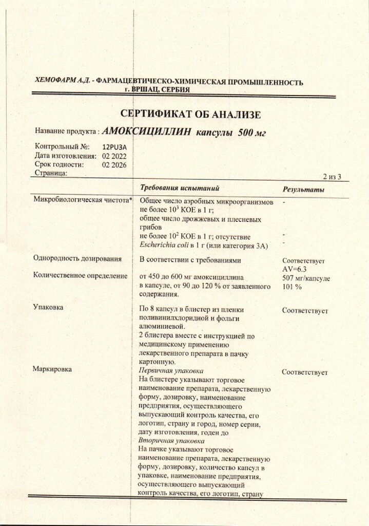 амоксициллин 500.00 мг (в форме амоксициллина тригидрата 573,9 мг);