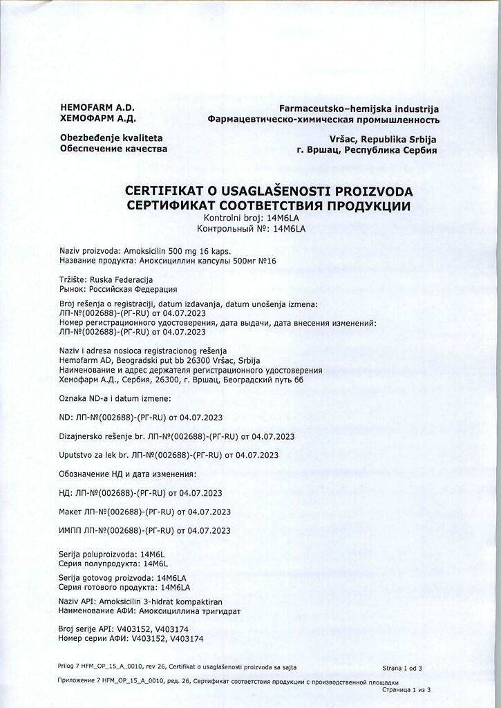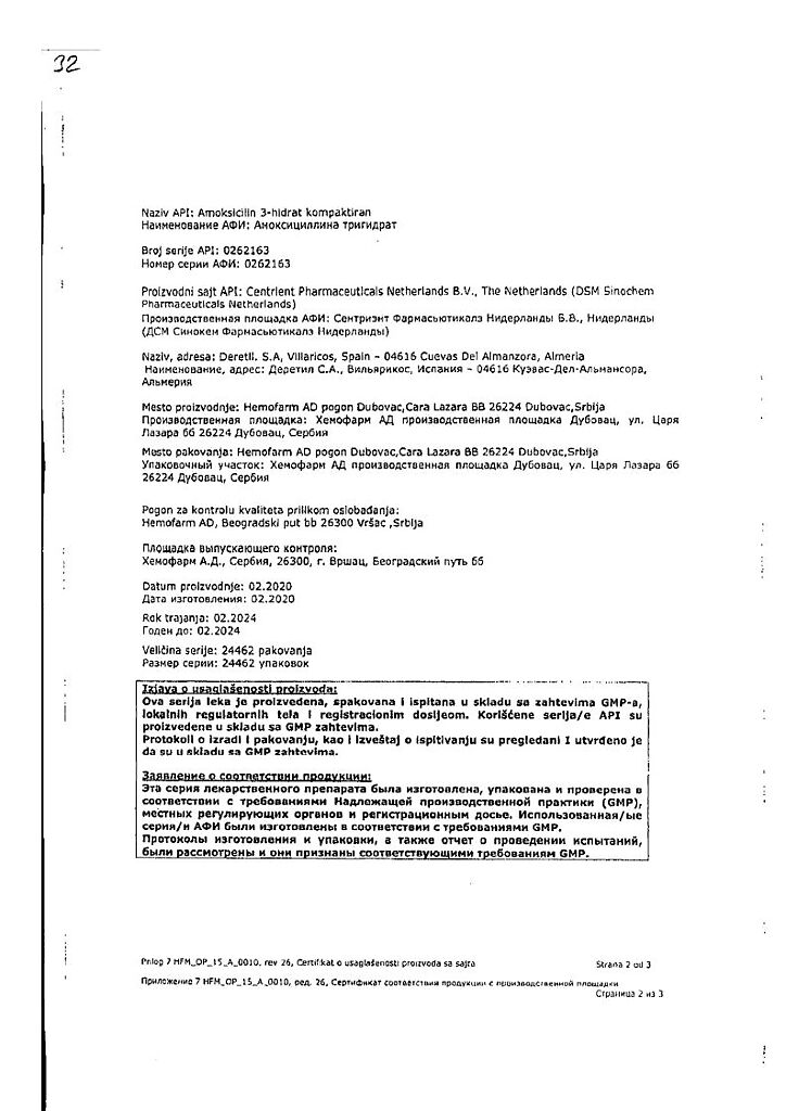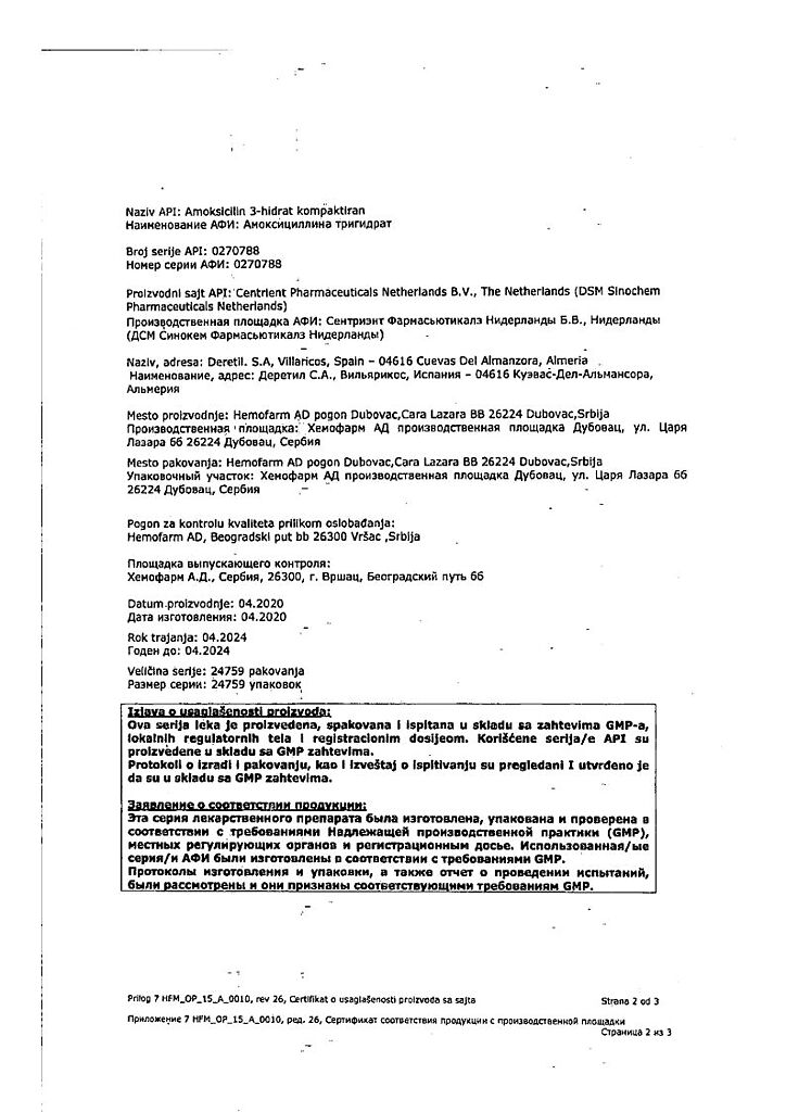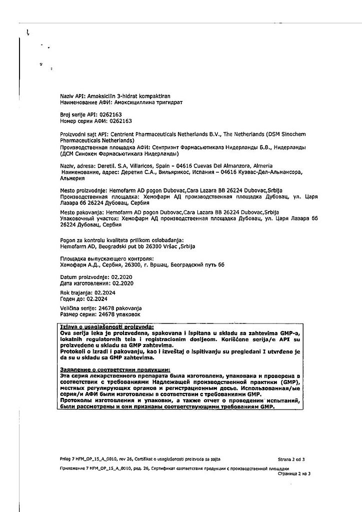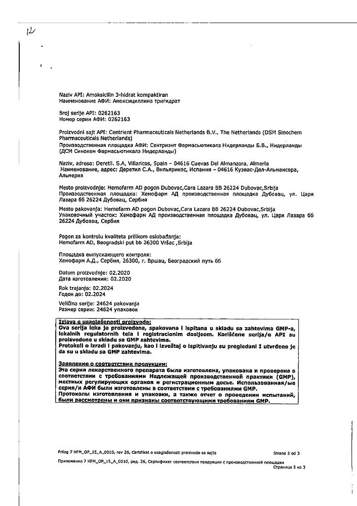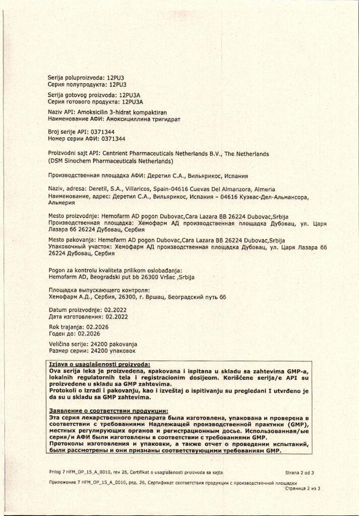 Абсорбция быстрая высокая (около 93%) прием пищи не оказывает влияния на абсорбцию; амоксициллин не разрушается в кислой среде желудка. При приеме внутрь в дозе 250 мг максимальная концентрация в плазме крови (Сmах) достигается через 1-2 ч (ТСmах) и составляет 35-5 мкг/мл. Период полувыведения (Т1/2) -1-15 ч.