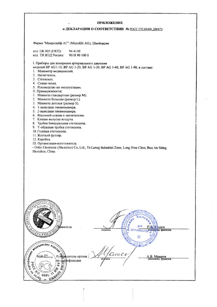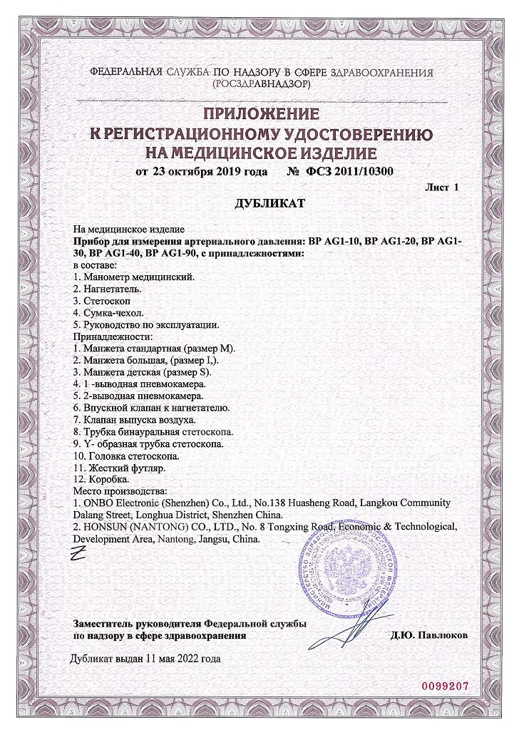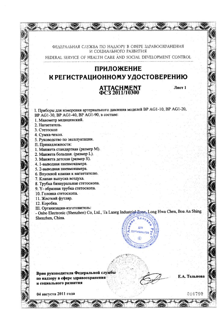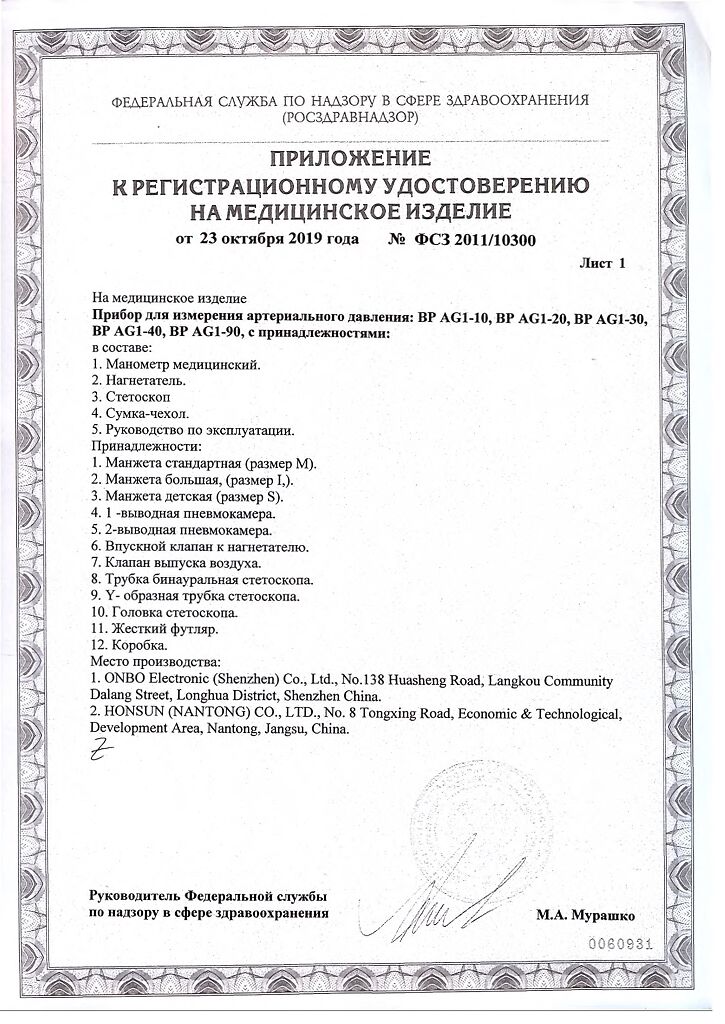В комплект поставки входят стетоскоп с мягкими ушными оливами, износостойкая капроновая манжета размером 22 - 32 см., высококачественная опора и анероидный измеритель давления, которые все вместе обеспечивают согласованную работу. Прибор со всеми комплектующими хранится в нейлоновой сумке с застежкой.