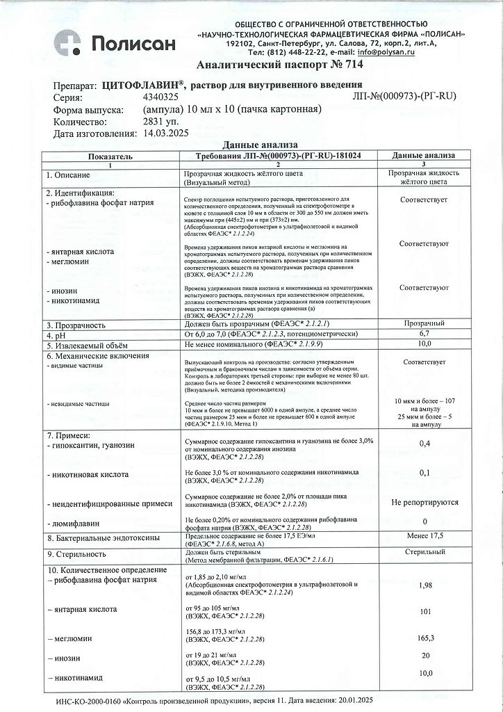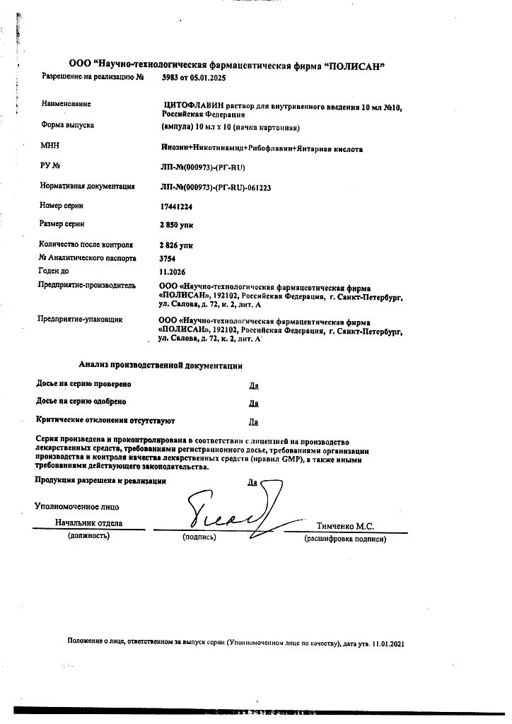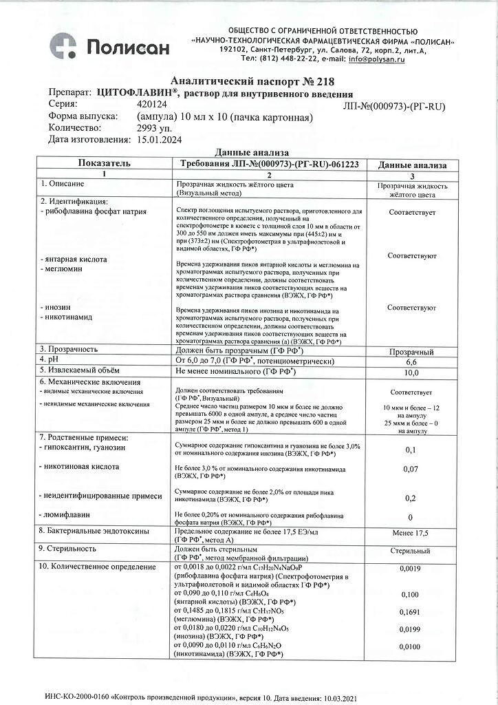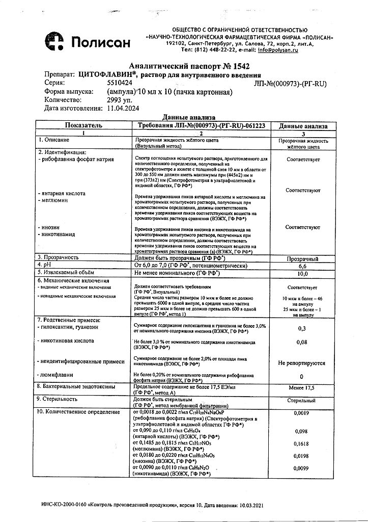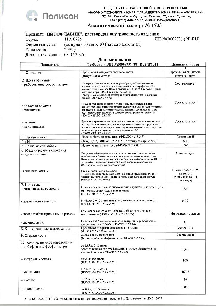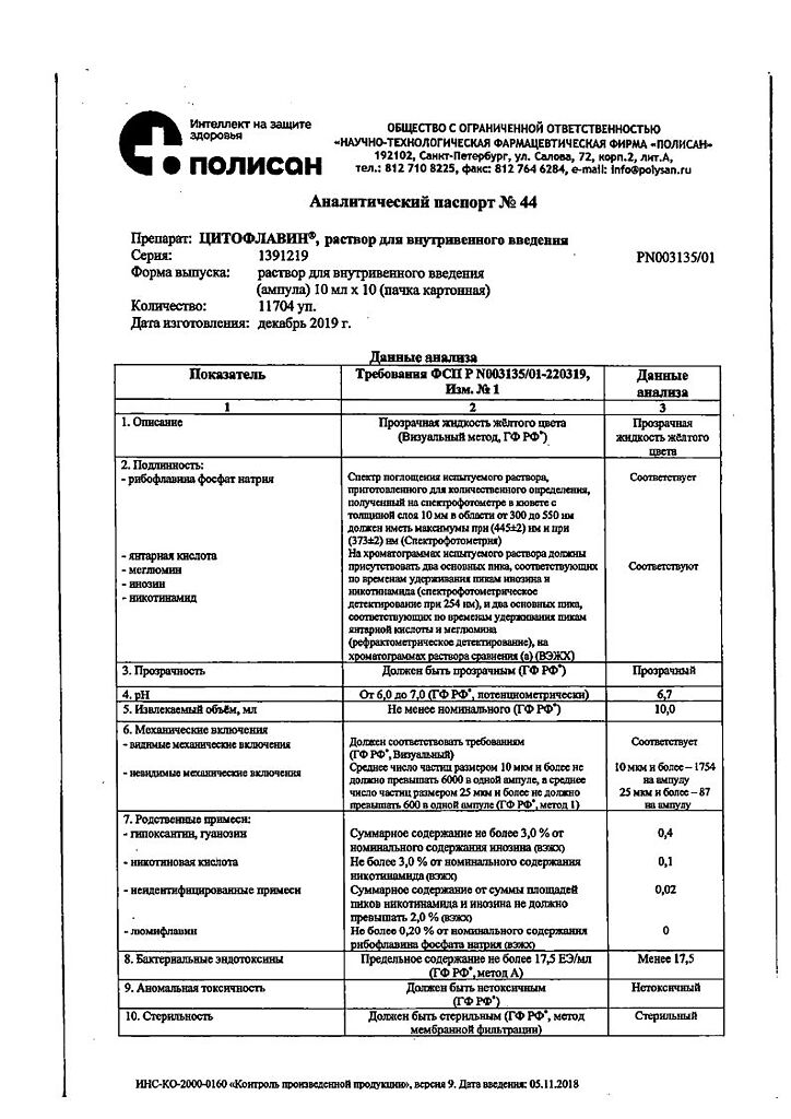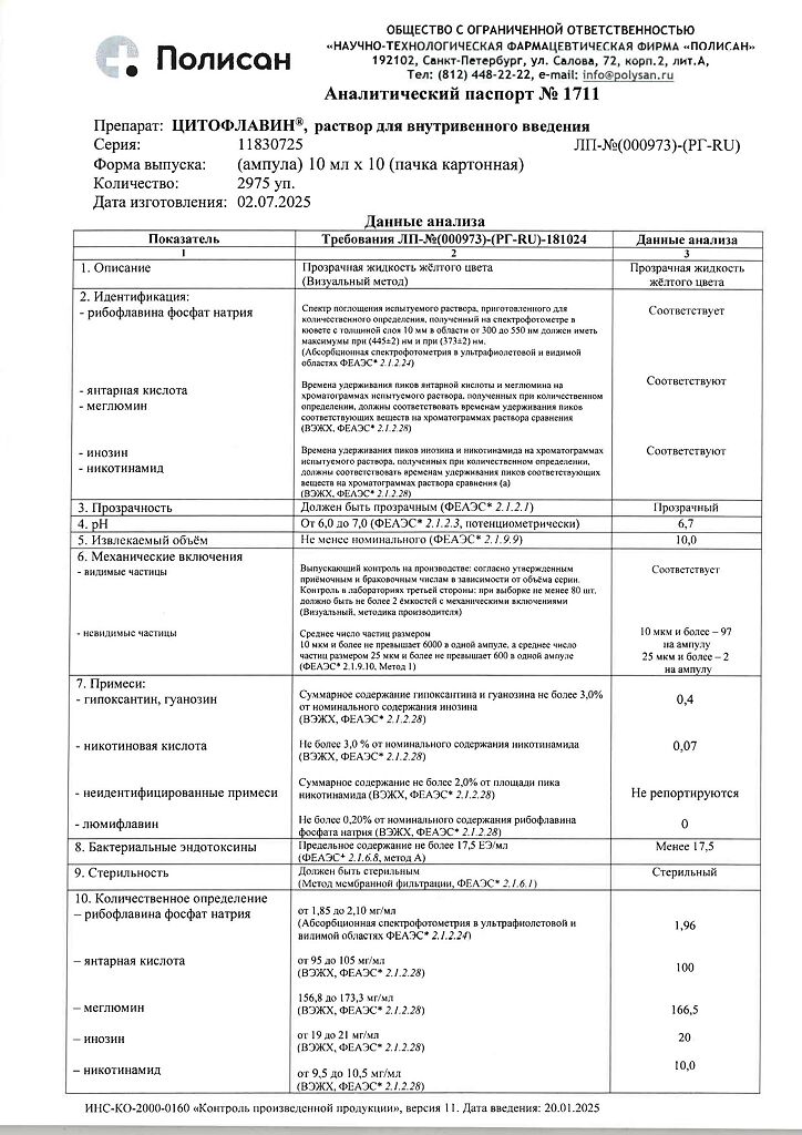 При внутривенной инфузии со скоростью около 2 мл/мин (в пересчете на неразбавленный ЦИТОФЛАВИН®) янтарная кислота и инозин утилизируются практически мгновенно и в плазме крови не определяются.