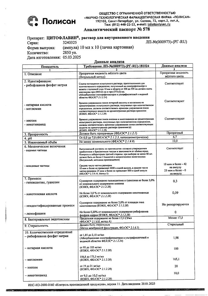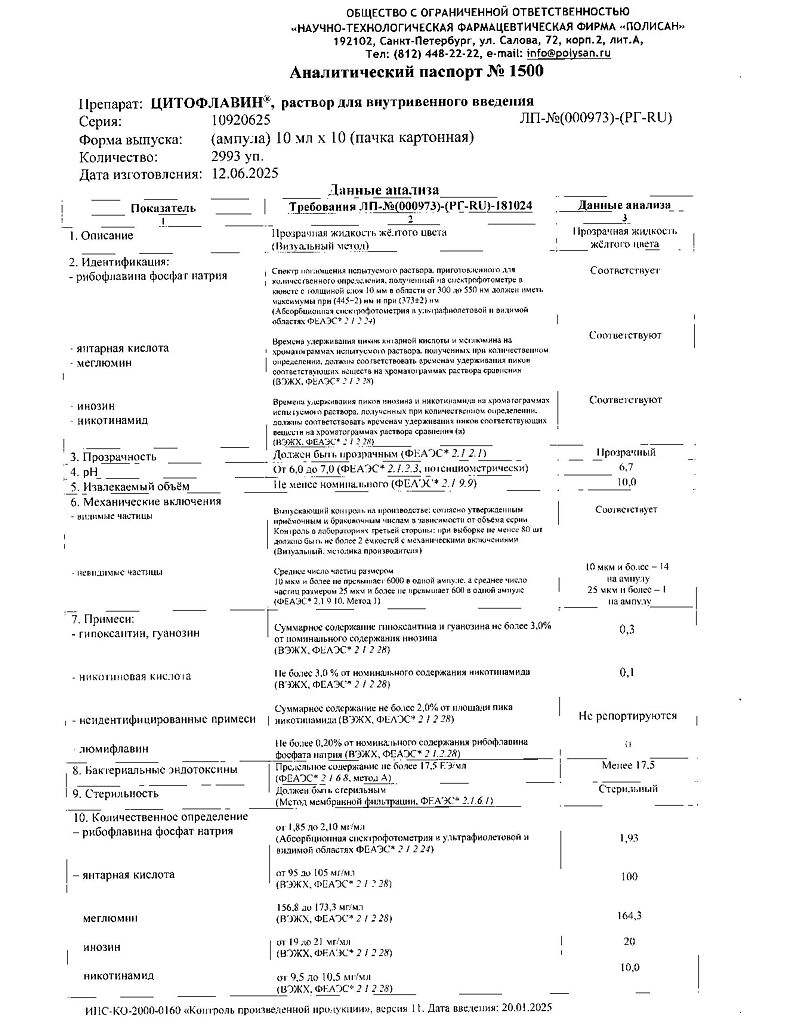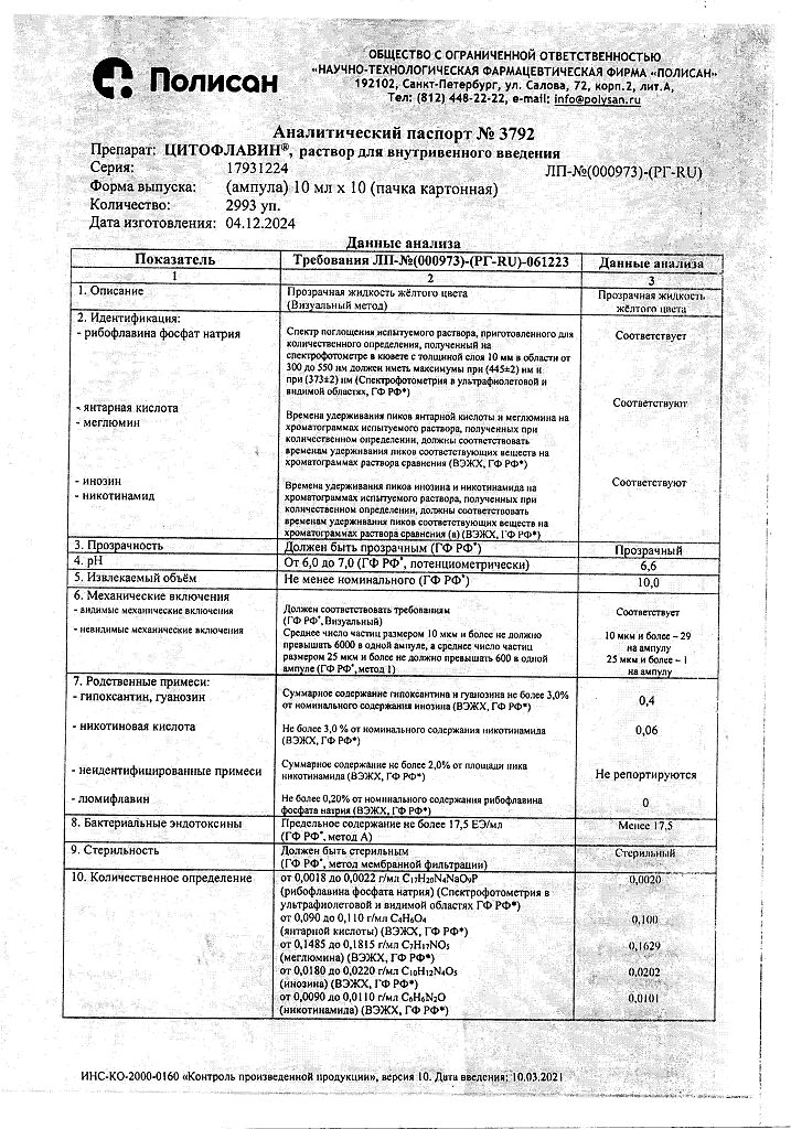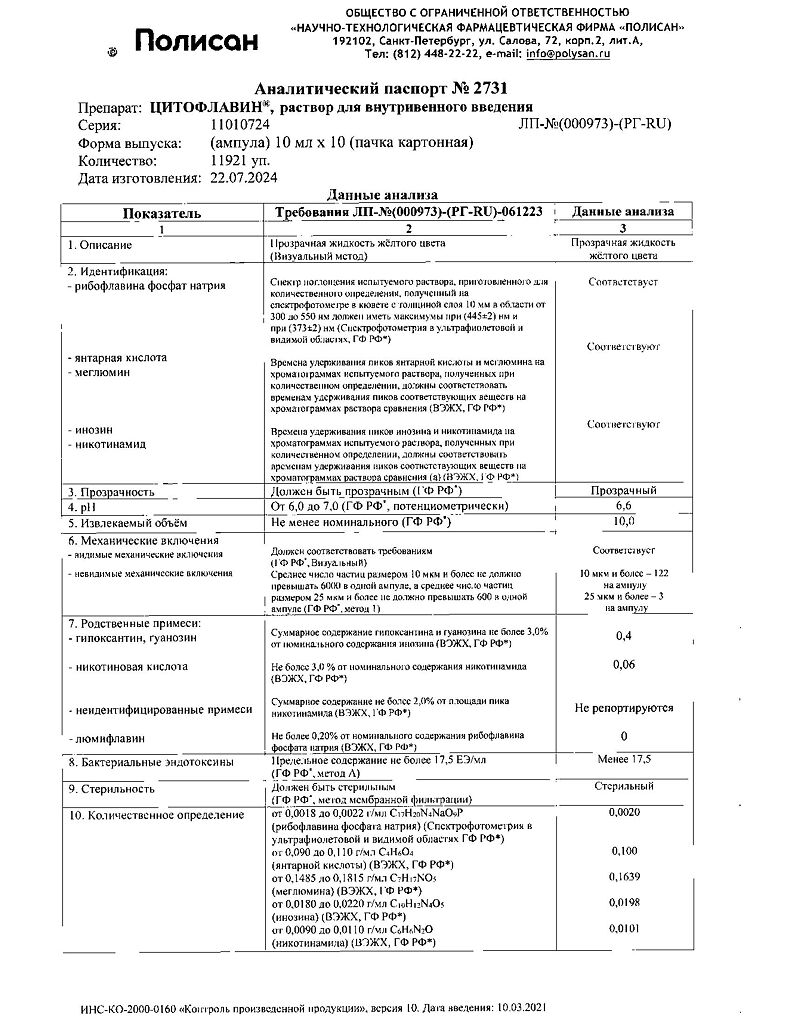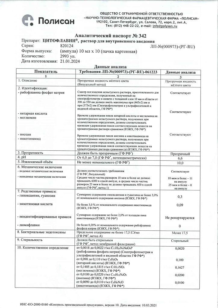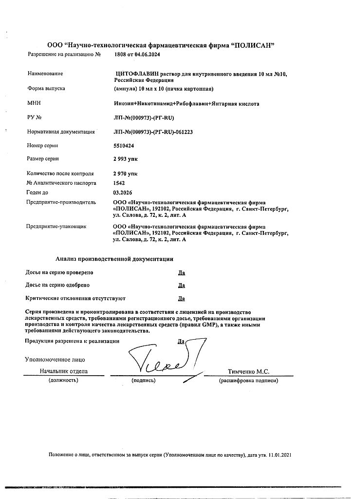 При внутривенной инфузии со скоростью около 2 мл/мин (в пересчете на неразбавленный ЦИТОФЛАВИН®) янтарная кислота и инозин утилизируются практически мгновенно и в плазме крови не определяются.