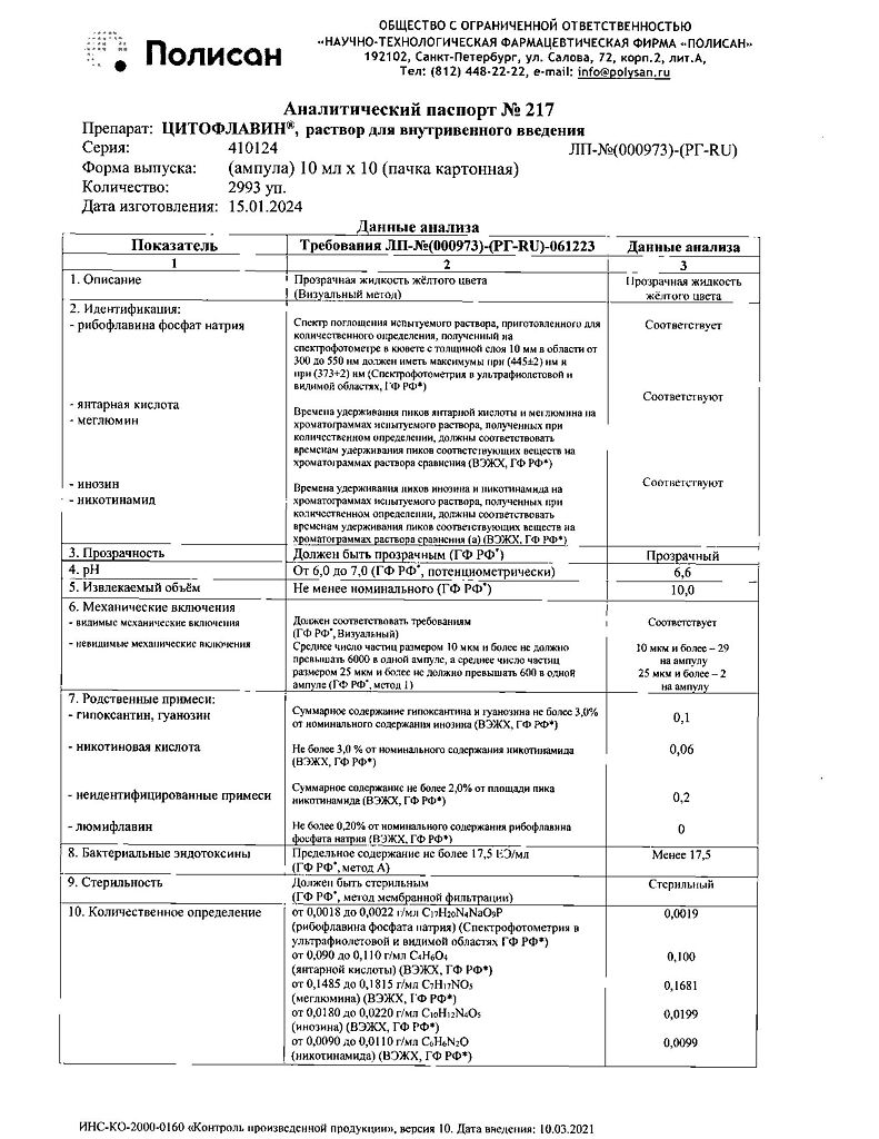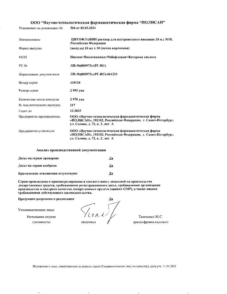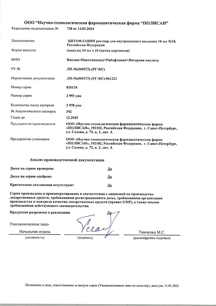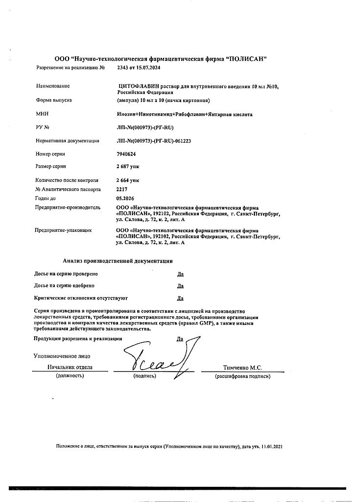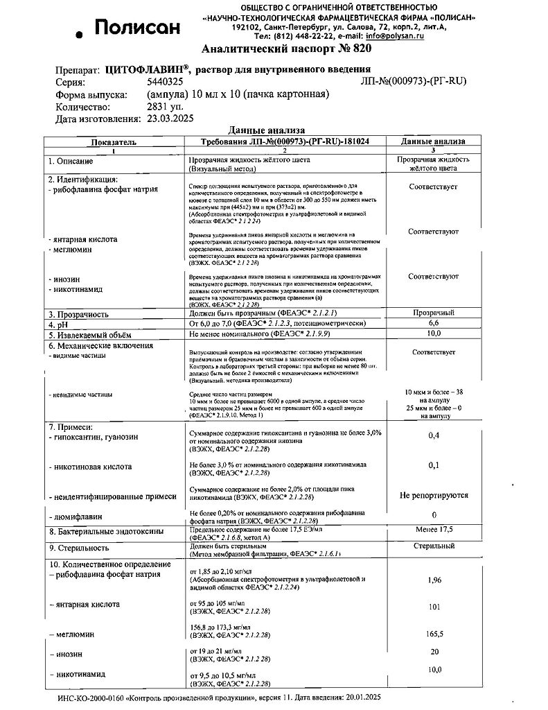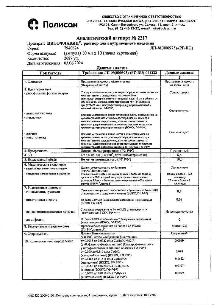 При внутривенной инфузии со скоростью около 2 мл/мин (в пересчете на неразбавленный ЦИТОФЛАВИН®) янтарная кислота и инозин утилизируются практически мгновенно и в плазме крови не определяются.