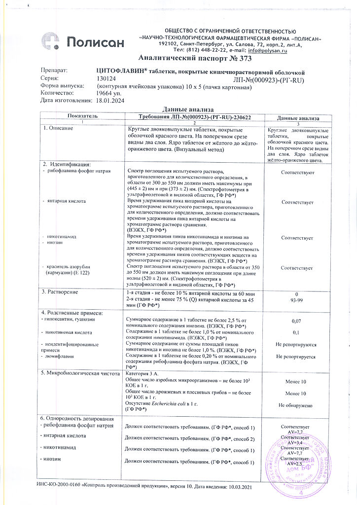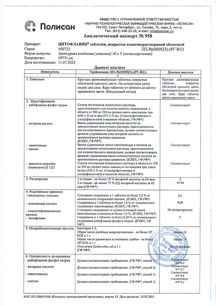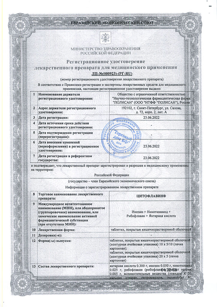 Таким образом, все компоненты препарата Цитофлавин® являются естественными метаболитами организма и стимулируют тканевое дыхание. Метаболическая энергокоррекция, антигипоксическая и антиоксидантная активность препарата, определяющие фармакологические свойства и лечебную эффективность составляющих, обусловлена взаимодополняющим действием янтарной кислоты, инозина, никотинамида и рибофлавина.