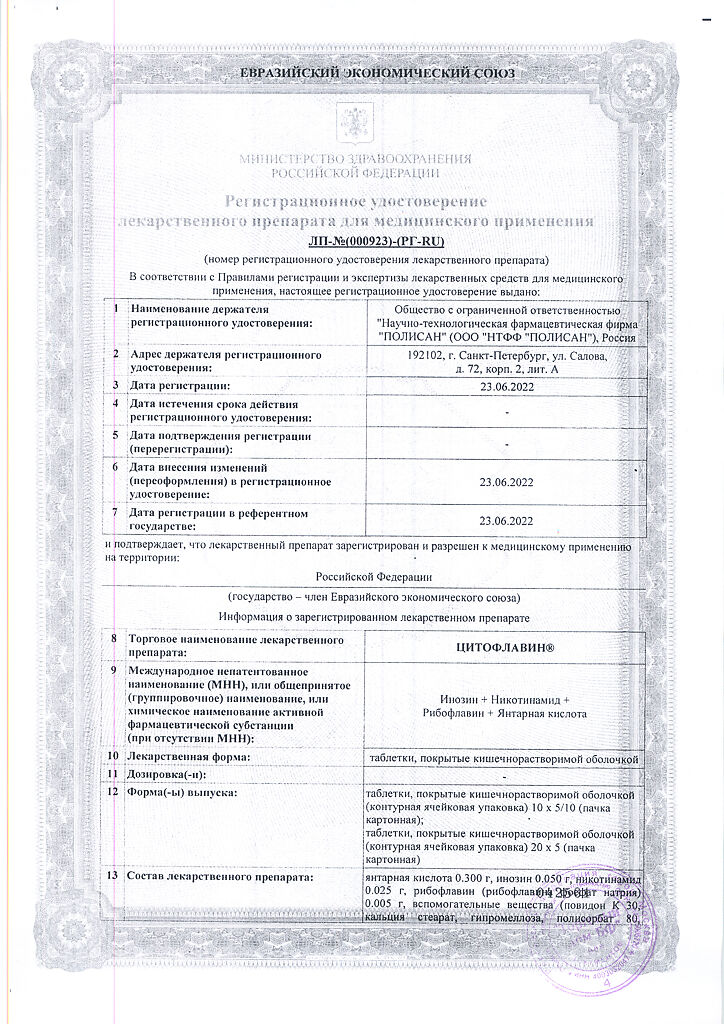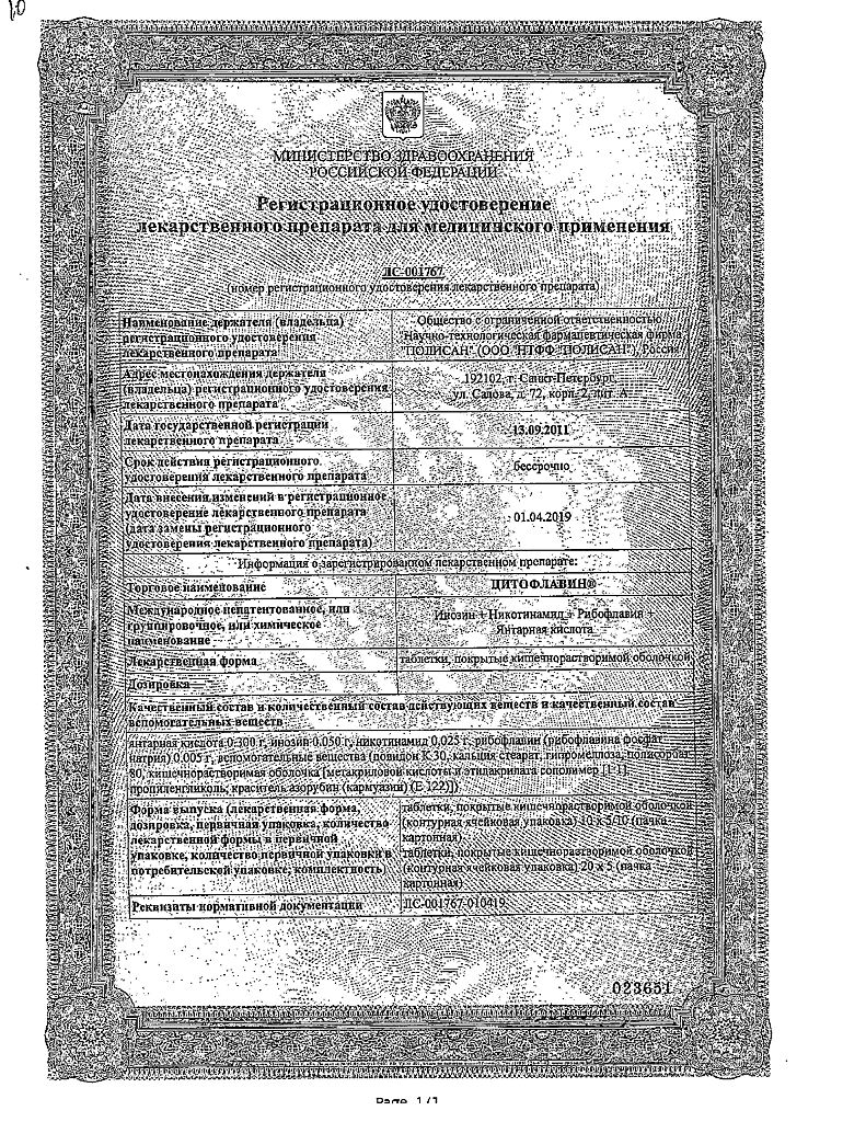 Препарат принимают внутрь по 2 таб. 2 раза/сут с интервалом 8-10 ч. Рекомендуется принимать Цитофлавин® утром и днем, не позднее 18 ч.