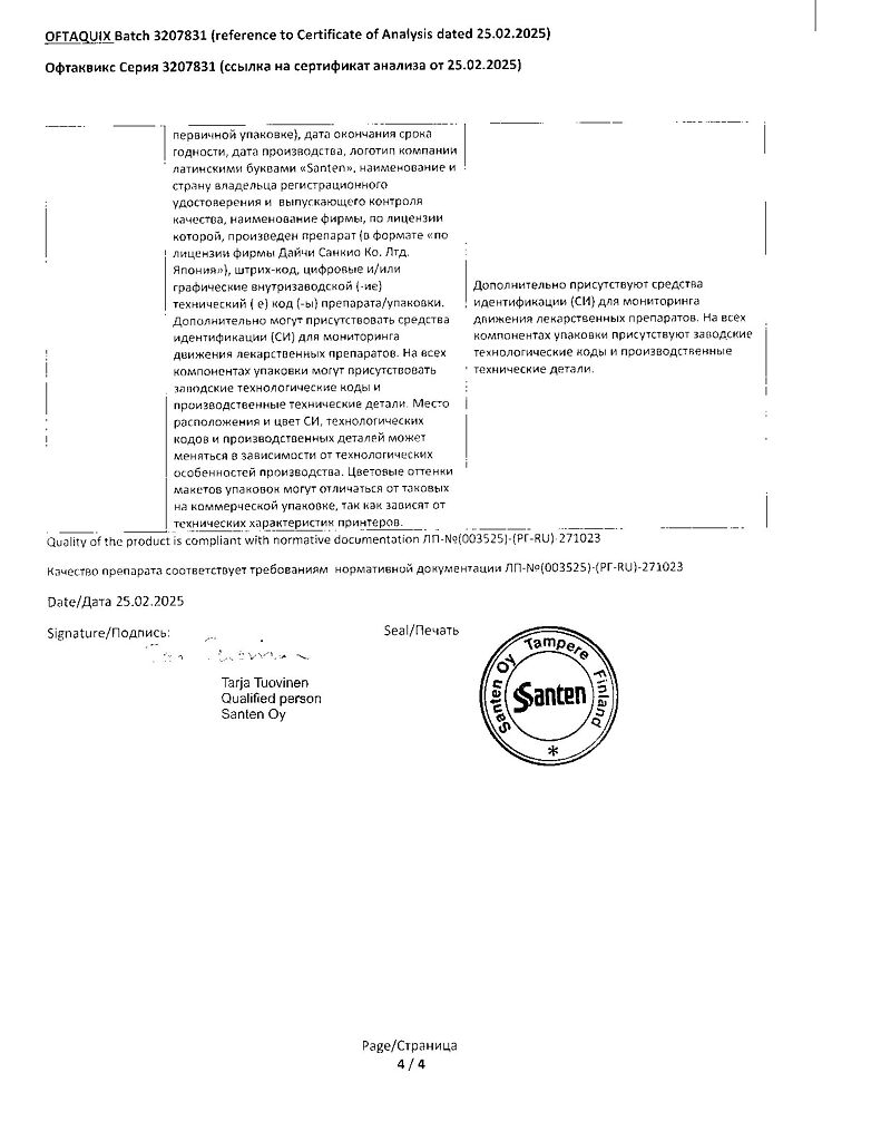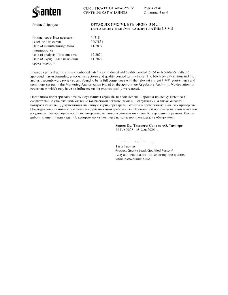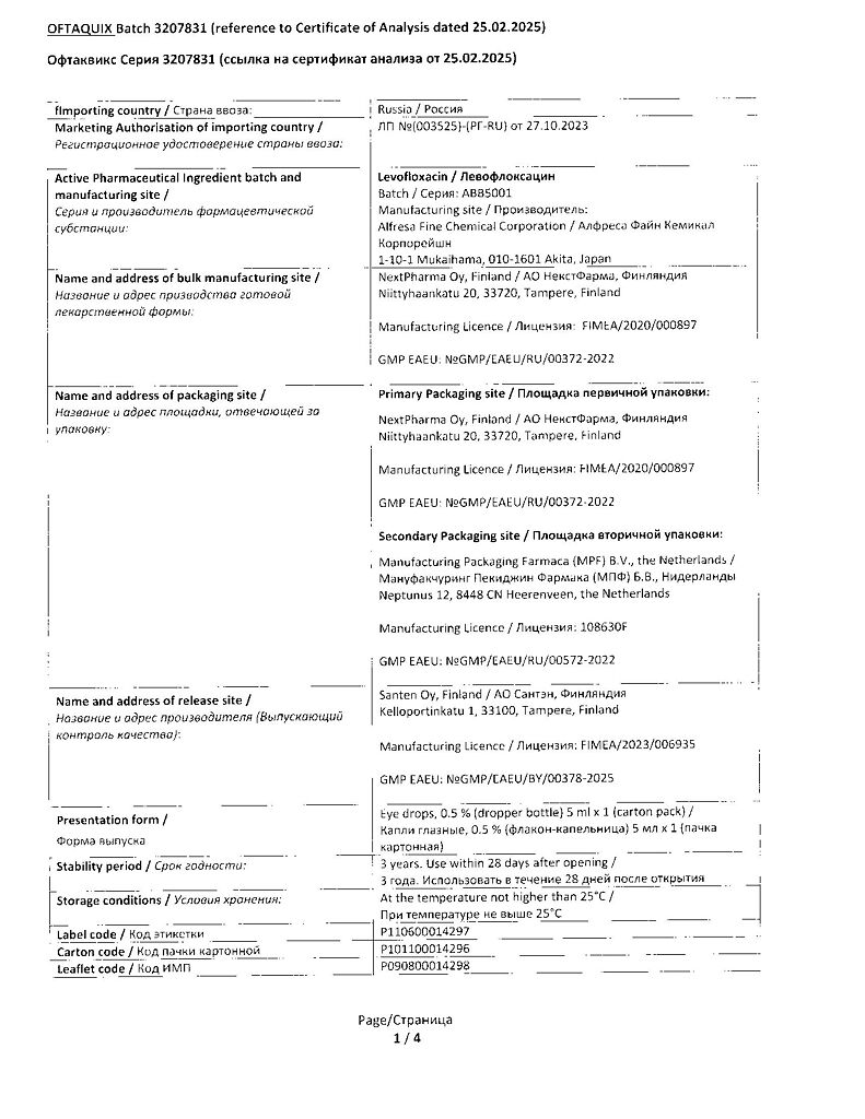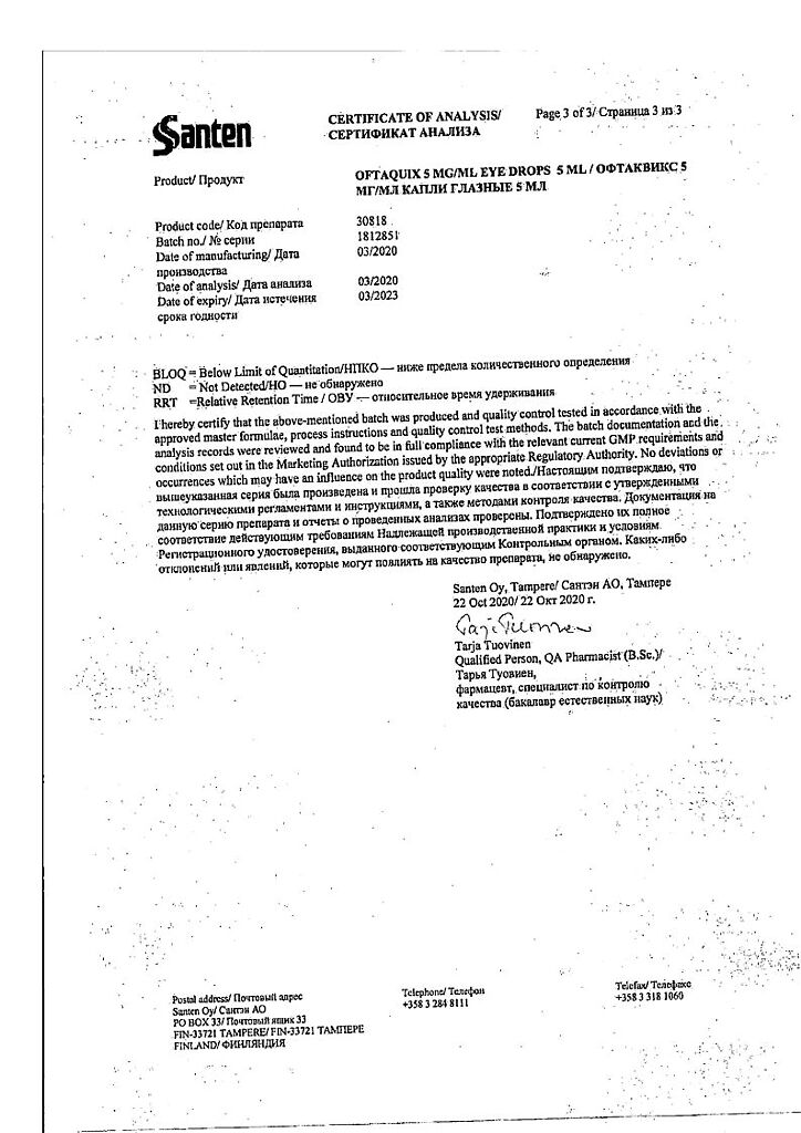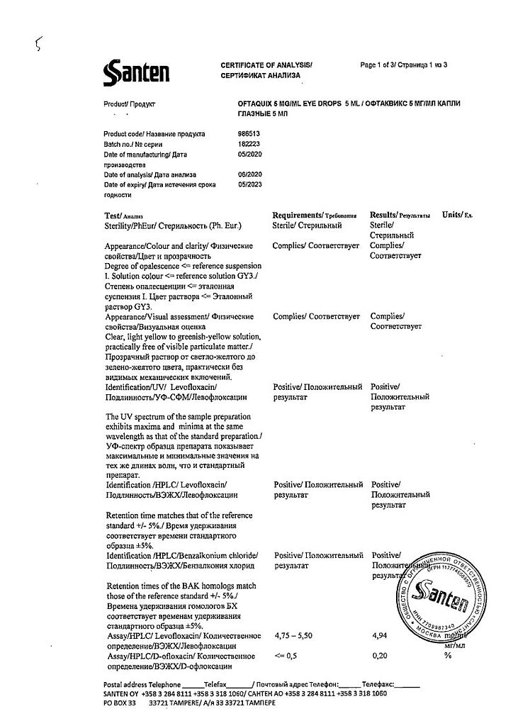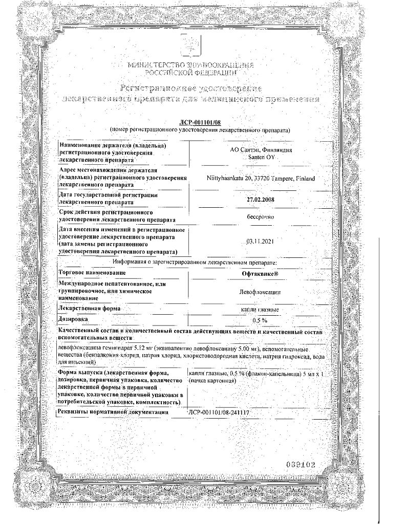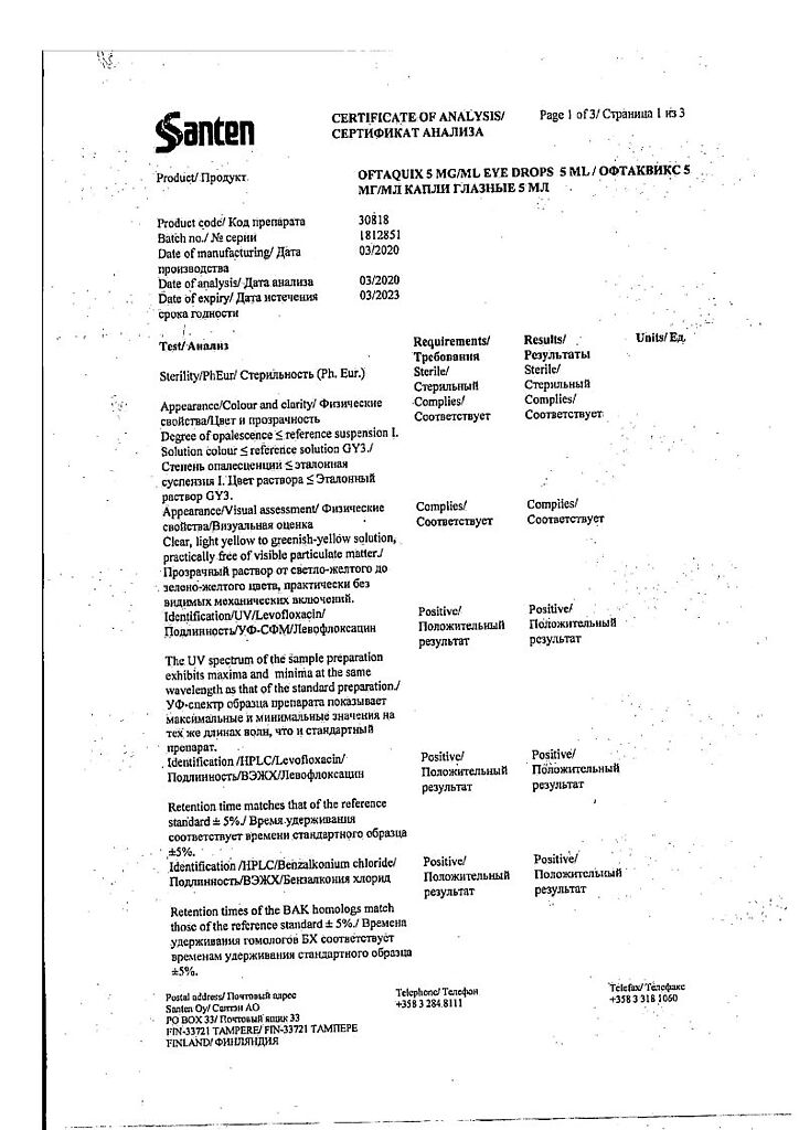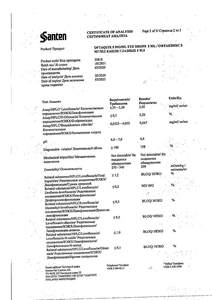 После инстилляции в глаз левофлоксацин хорошо сохраняется в слезной пленке. В исследованиях на здоровых добровольцах было показано, что средние концентрации левофлоксацина в слезной пленке, измеренные через 4 и 6 ч после местного применения составили 17.0 мкг/мл и 6.6 мкг/мл соответственно. У пяти из шести испытуемых концентрации левофлоксацина составляли 2 мкг/мл и выше через 4 ч после инстилляции. У четырех из шести испытуемых эта концентрация сохранилась через 6 ч после инстилляции.